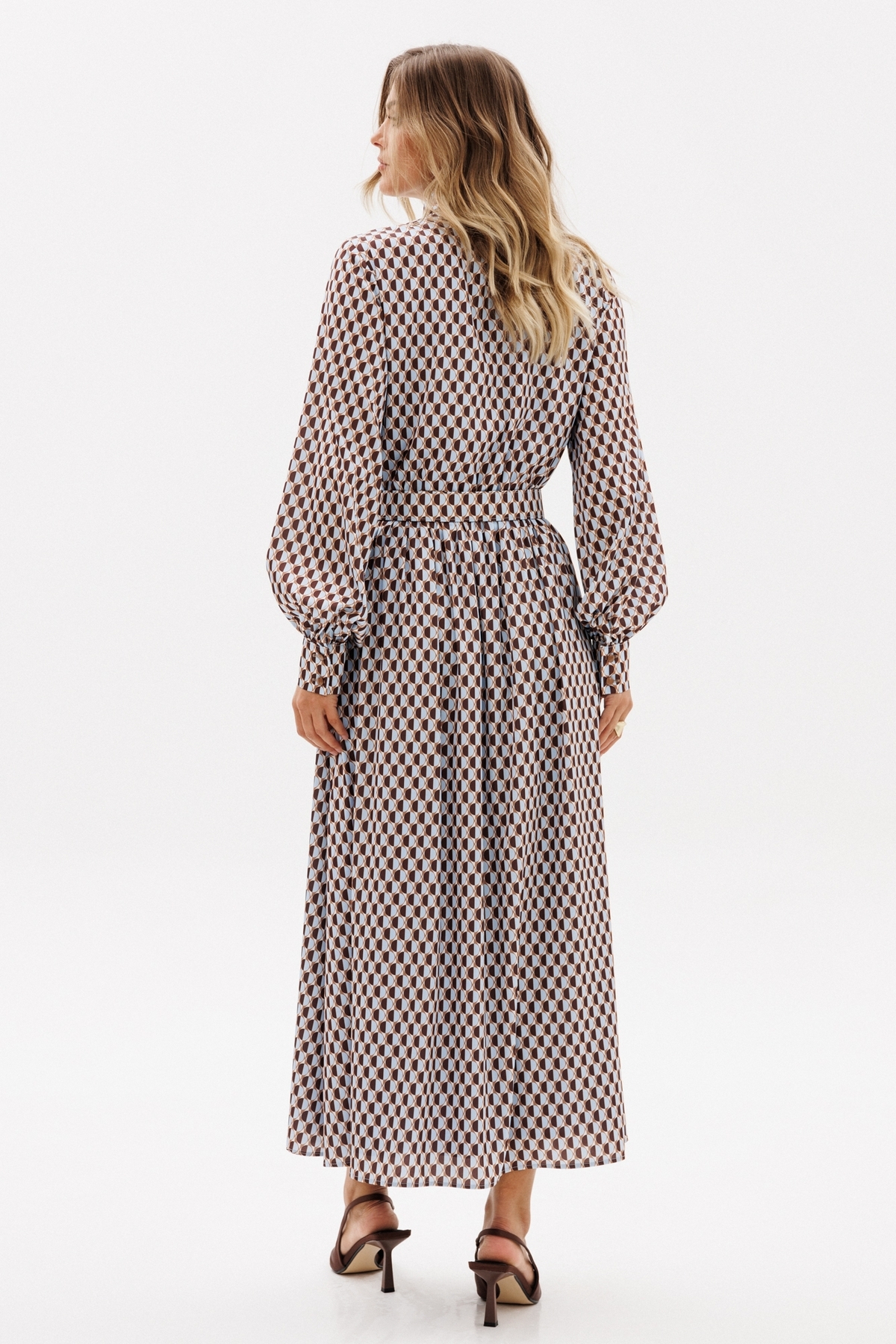 Платье выполнено из тонкого атласа с принтом. Платье отрезное по линии талии. Воротник рубашечного типа. Застежка спереди на пуговицы на планке. Рукав втачной, на манжете. Лиф и юбка платья на подкладке из тонкого однотонного атласа. В комплект входит съемный ремень из основной ткани с обтяжной пряжкой.