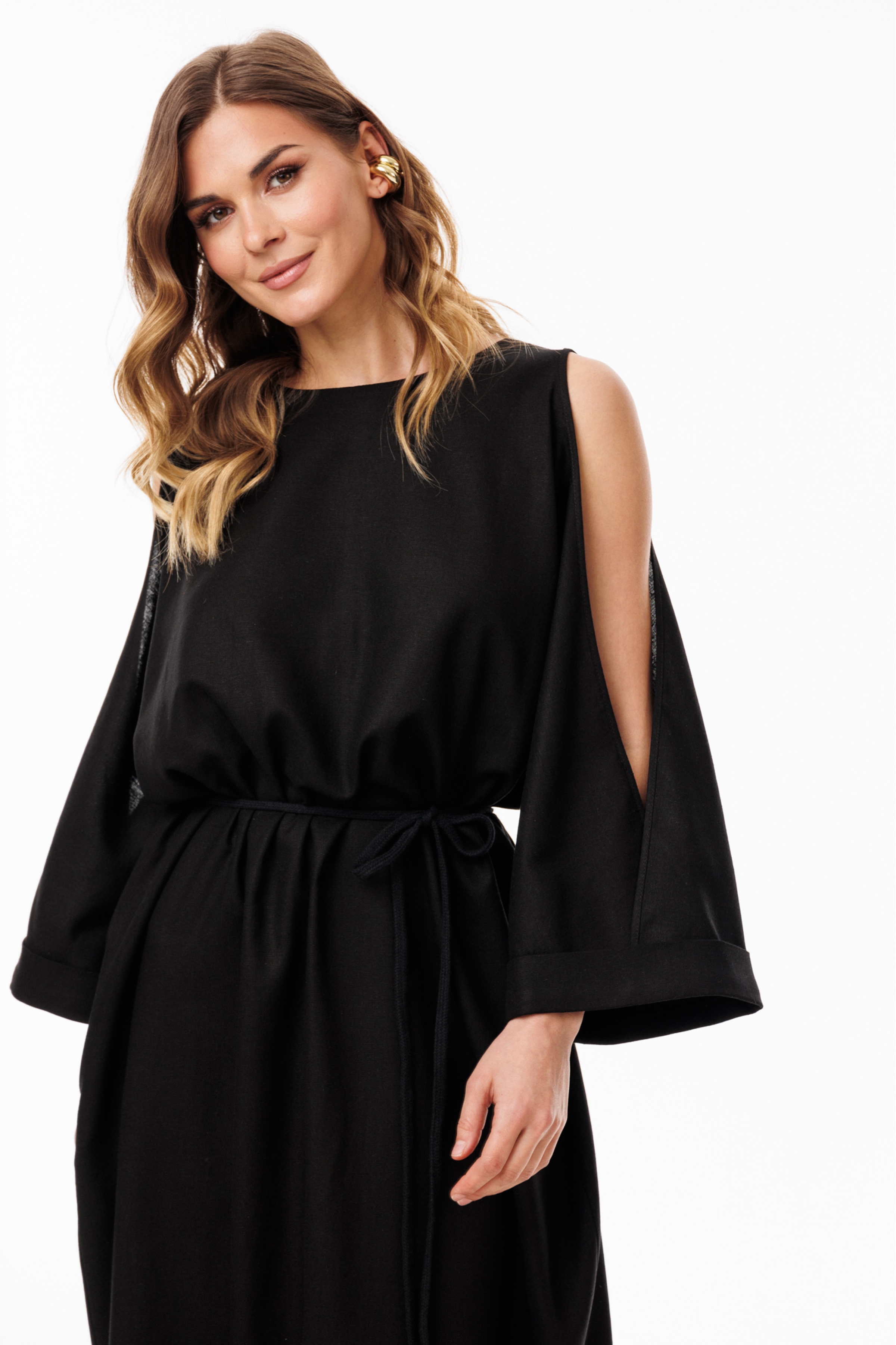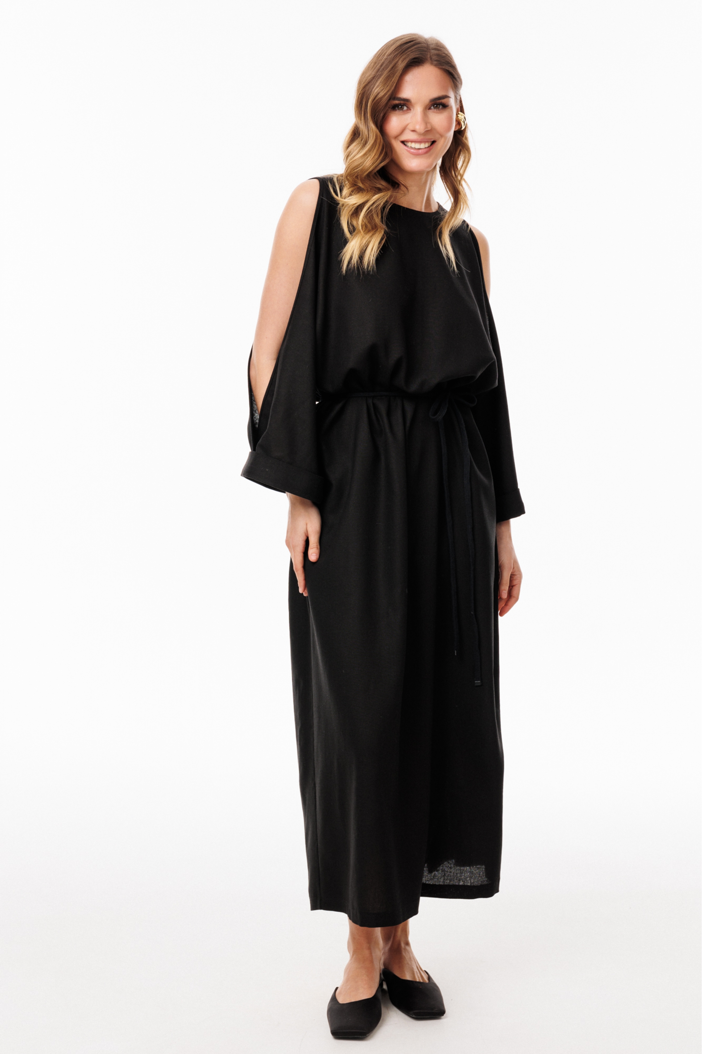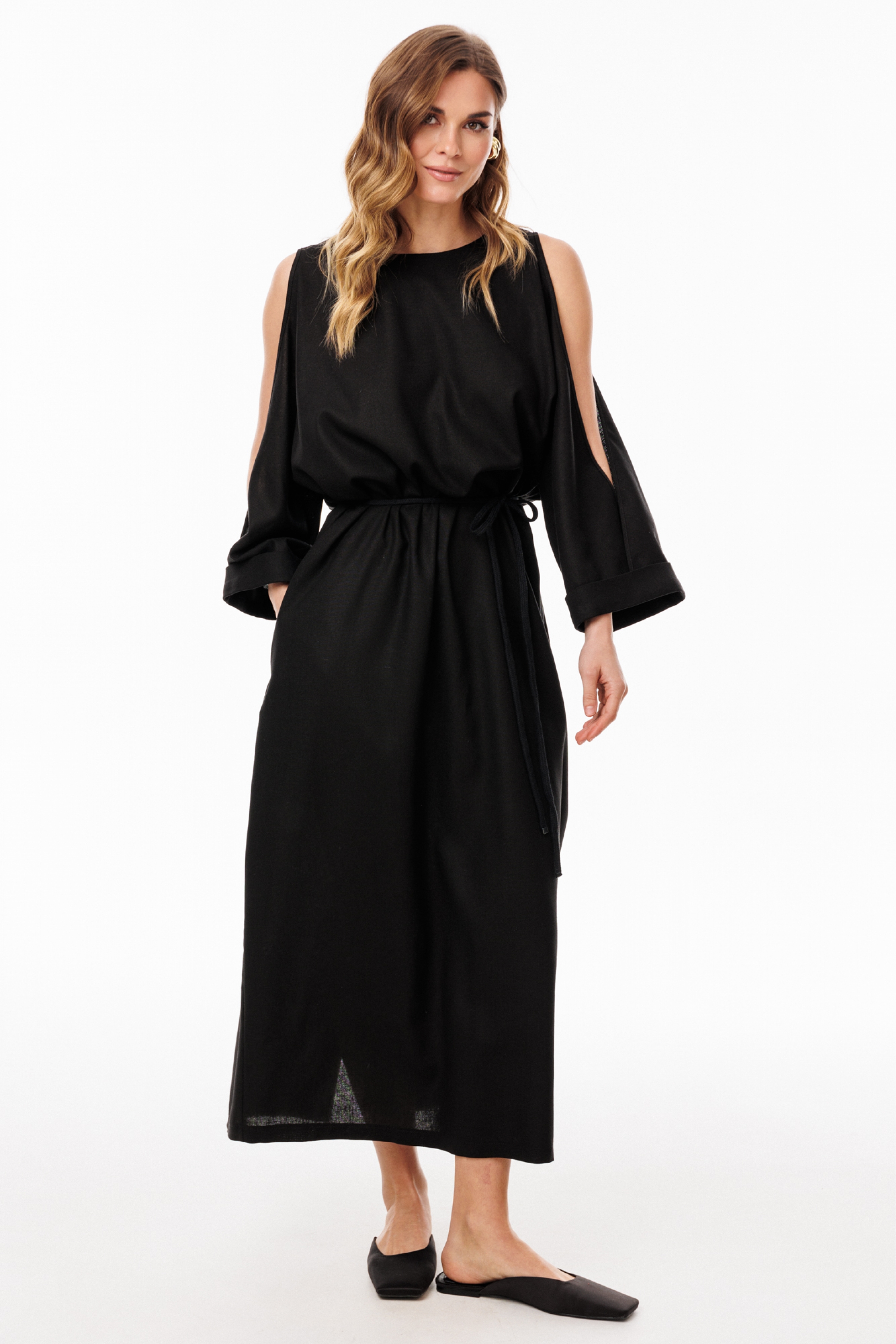 Платье выполнено из льна. Платье прямого силуэта, длиной миди. Перед цельный. Спинка со средним швом и разрезом. Горловина округлой формы. Рукав цельнокроенного покроя с каплевидной прорезью в верхней части. По низу рукава обработан заход задней части рукава на переднюю и притачная манжета с отворотом. В боковых швах обработаны карманы.