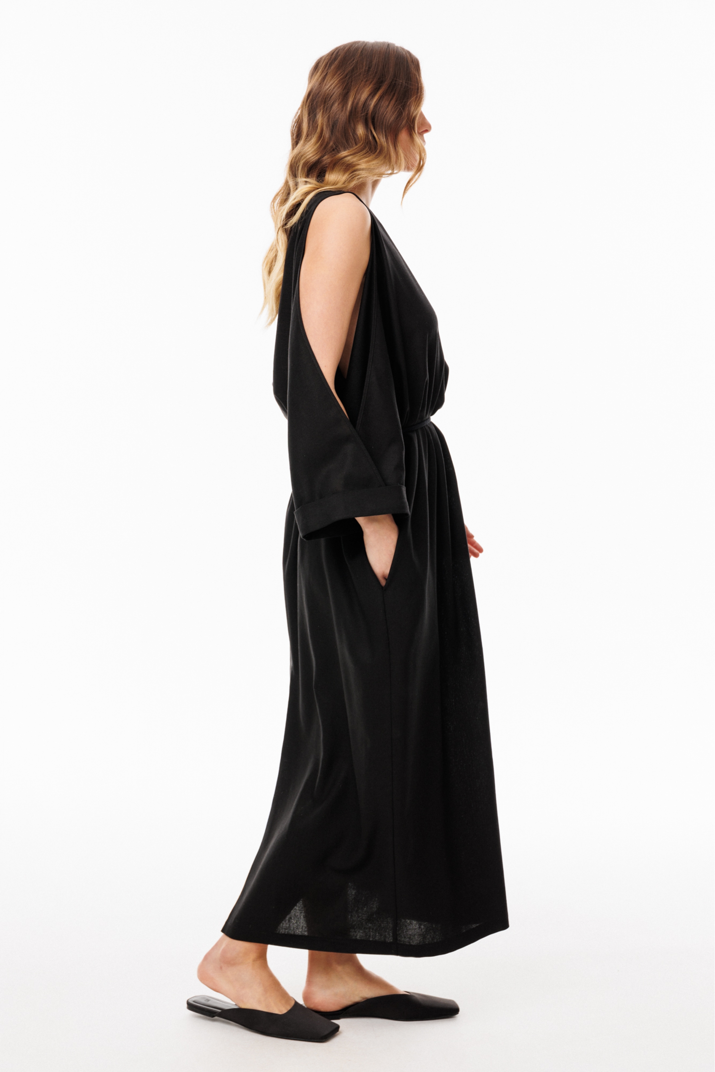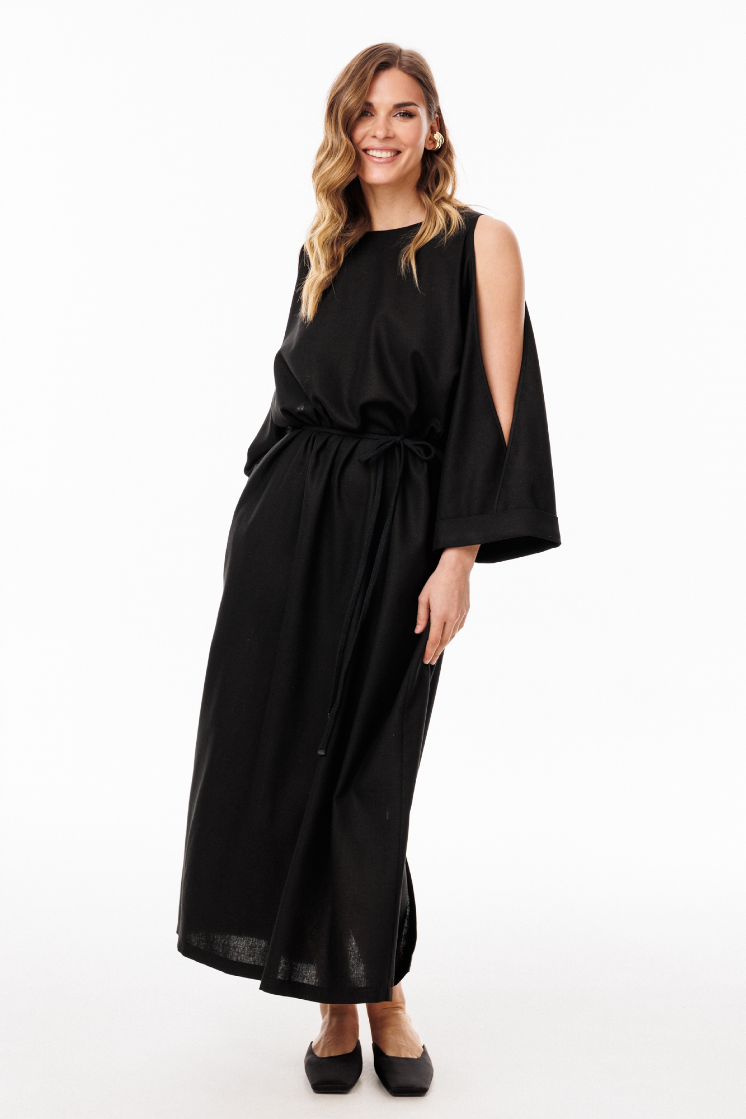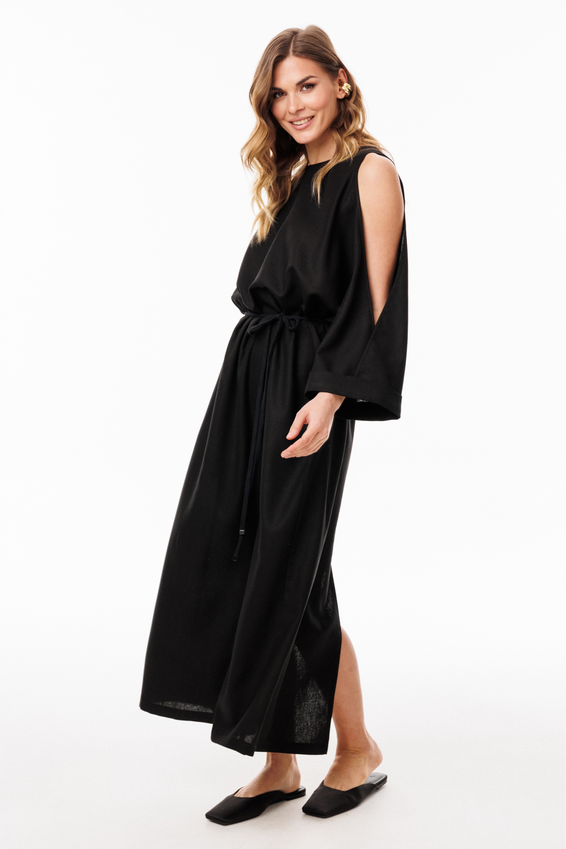 Платье выполнено из льна. Платье прямого силуэта, длиной миди. Перед цельный. Спинка со средним швом и разрезом. Горловина округлой формы. Рукав цельнокроенного покроя с каплевидной прорезью в верхней части. По низу рукава обработан заход задней части рукава на переднюю и притачная манжета с отворотом. В боковых швах обработаны карманы.