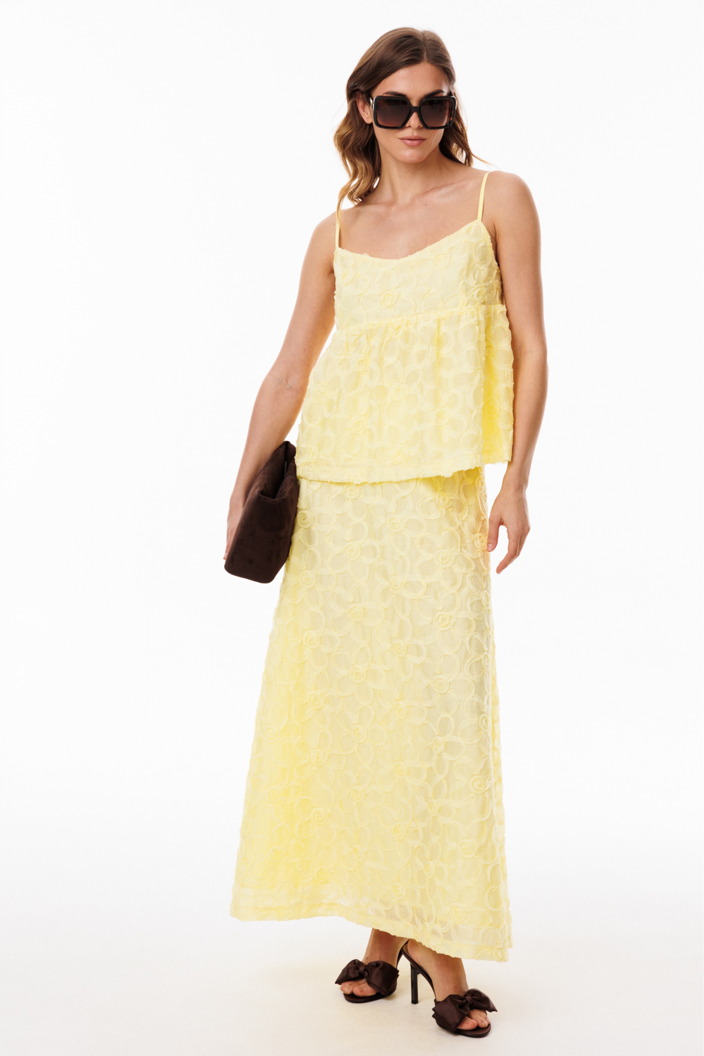 Топ выполнен из плательно-блузочной ткани с настроченными цветами. Топ А-образного силуэта, длиной выше линии бедер на регулируемых бретелях. Верхняя часть топа облегающая, с нагрудными вытачками по переду. Нижняя часть - отрезная под грудью, присборена и расширена к низу. Топ на отлетной по низу подкладке.