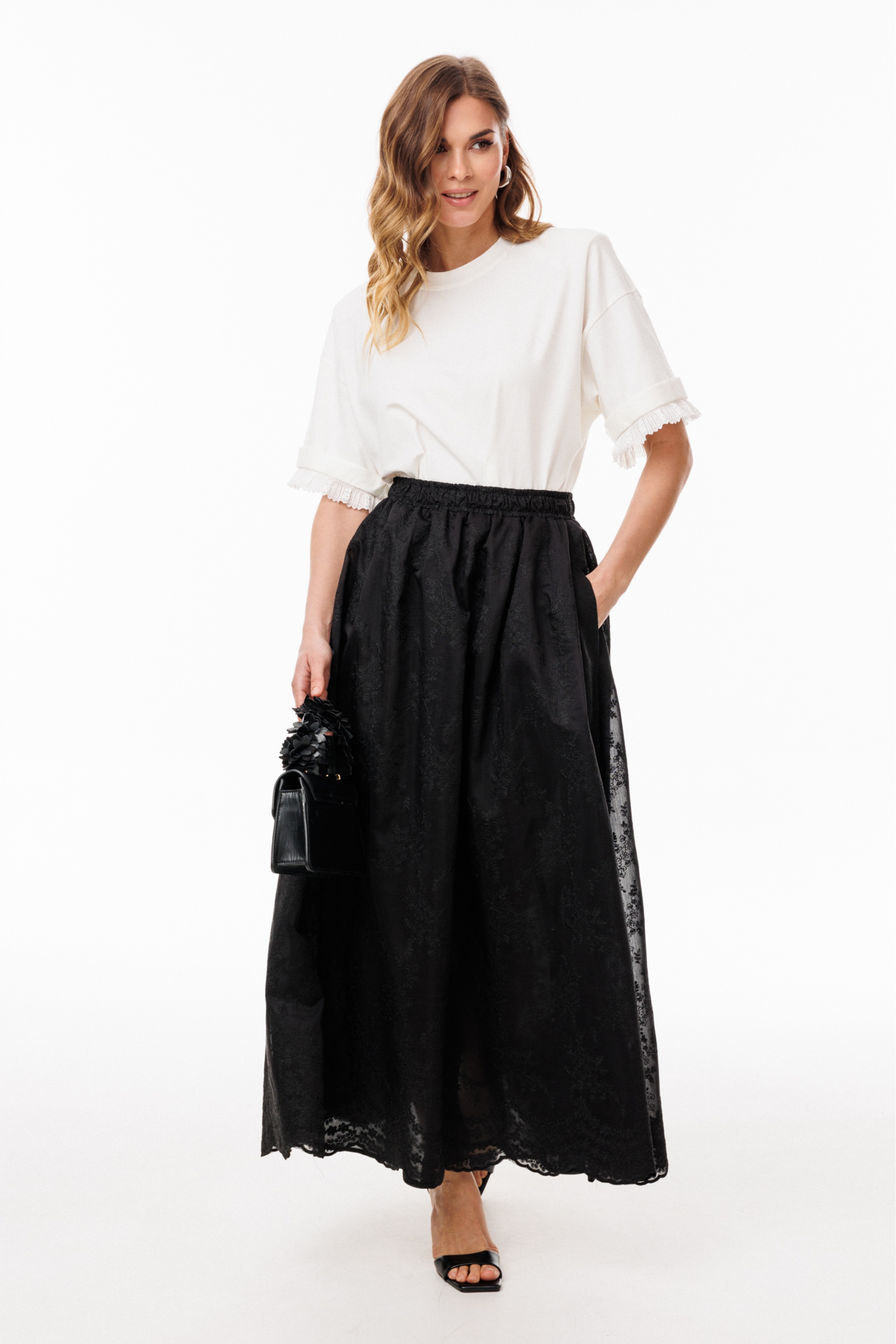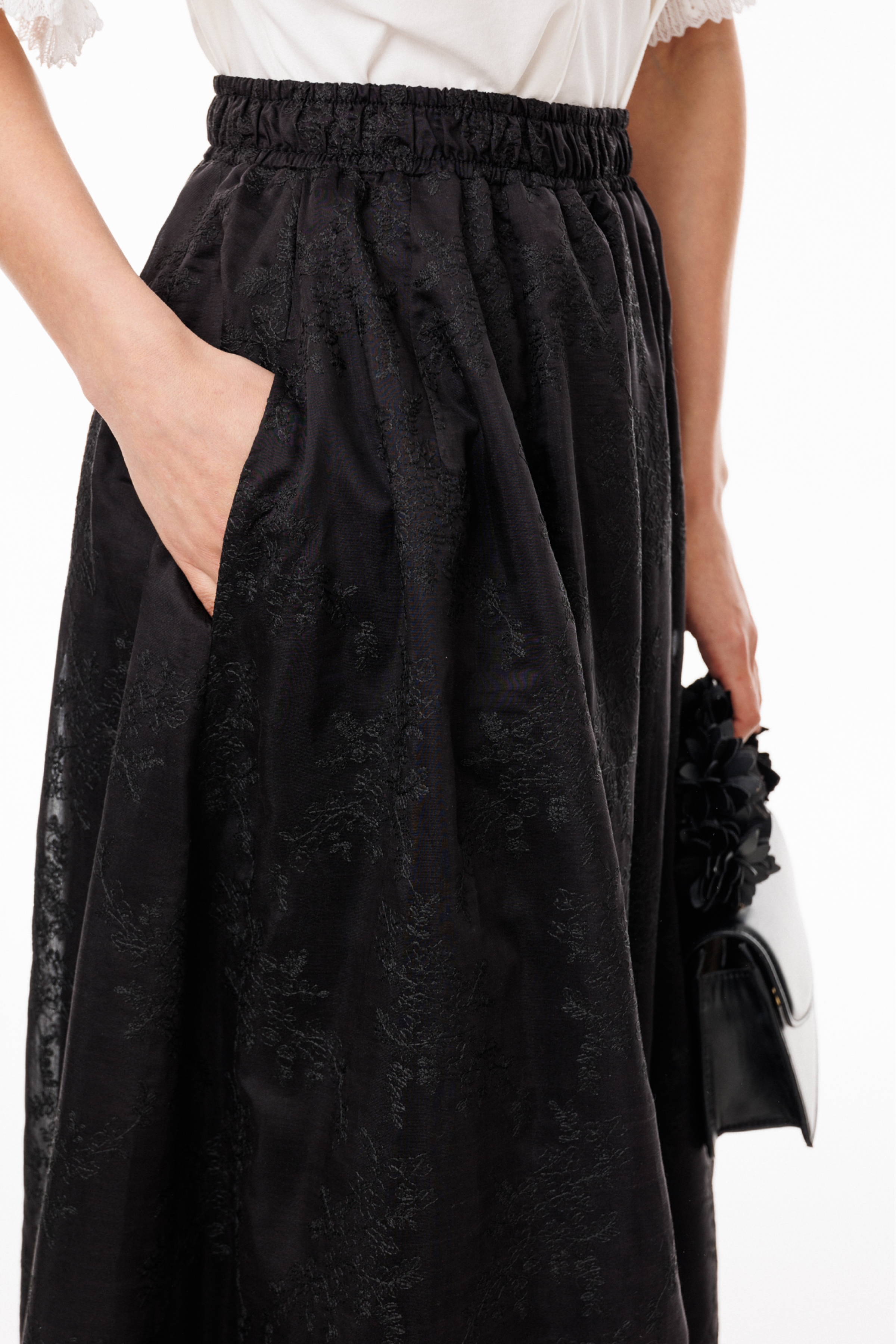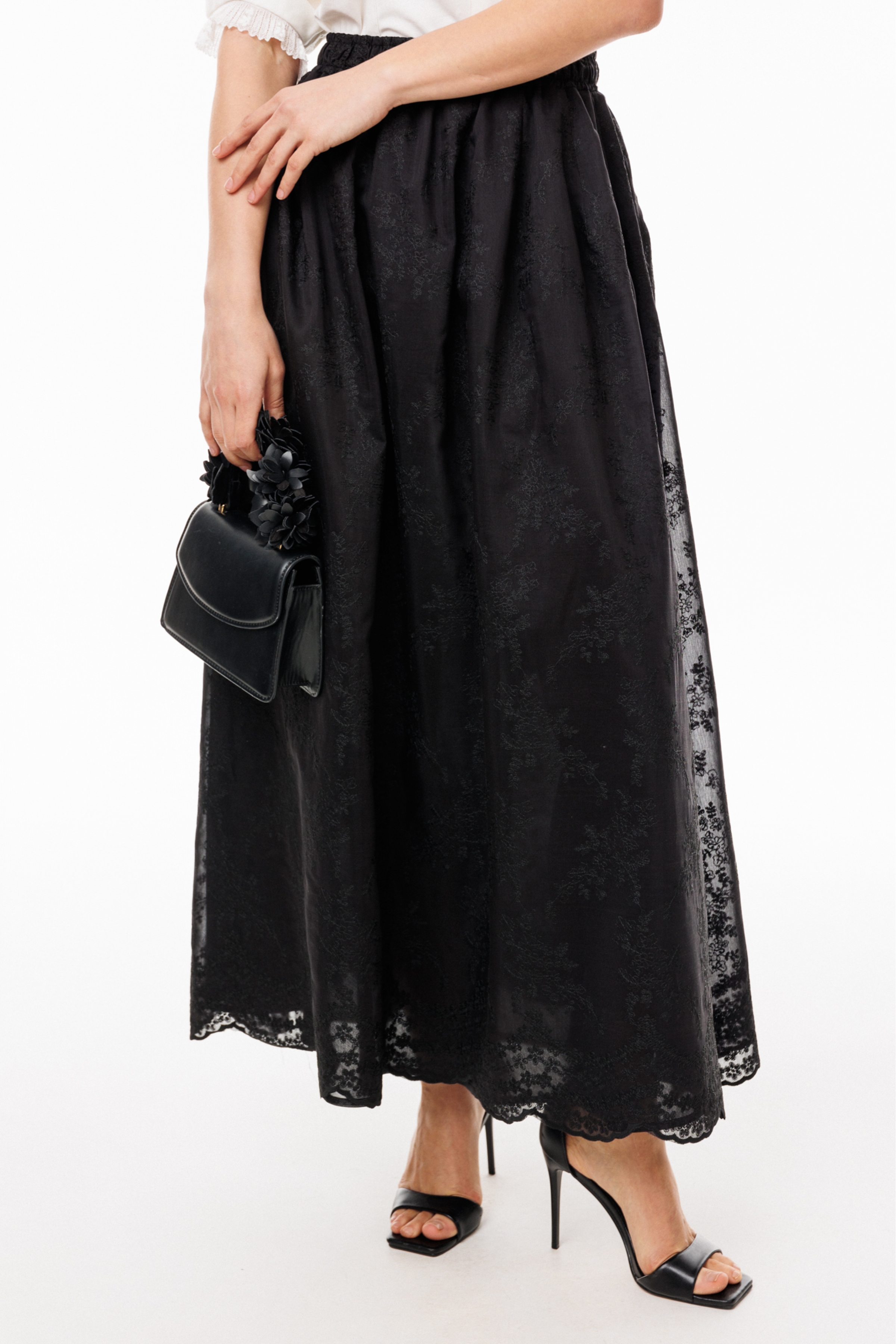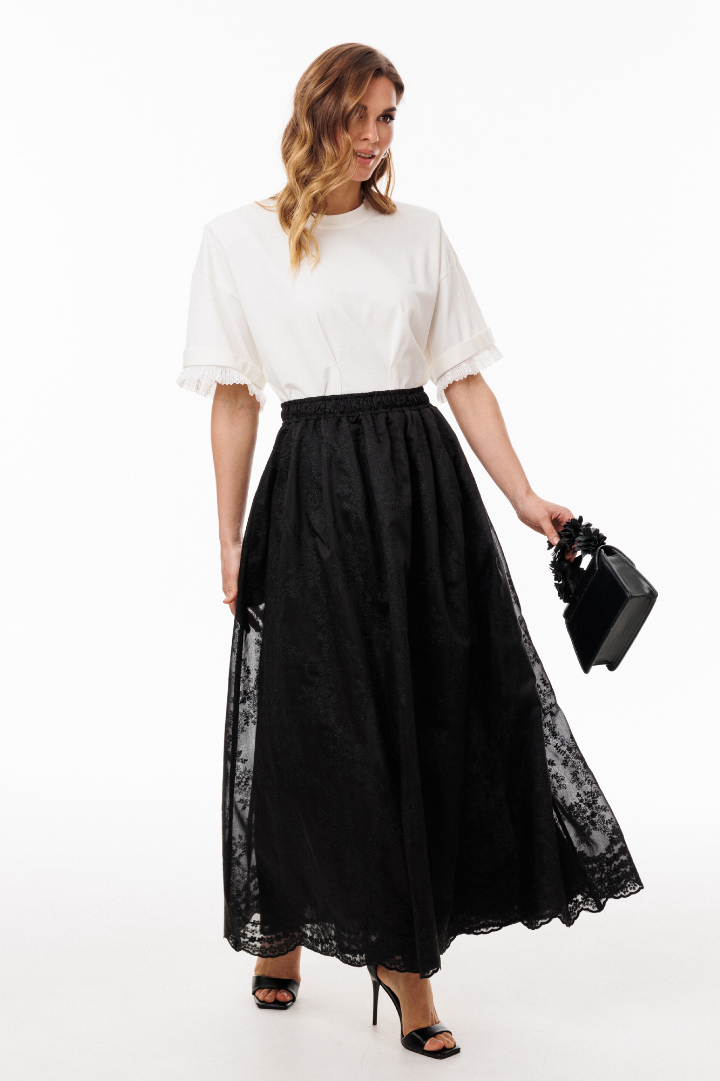 Юбка выполнена из плательно-блузочной ткани с вышивкой. Юбка А-образного силуэта, длиной выше линии щиколотки, на притачном поясе с эластичной тесьмой. На переднем и заднем полотнищах обработаны по шесть талиевых вытачек. В боковых швах обработаны карманы. Юбка на отлетной по низу подкладке. По низу юбки фестоны. Ремень в комплект не входит м.0067.