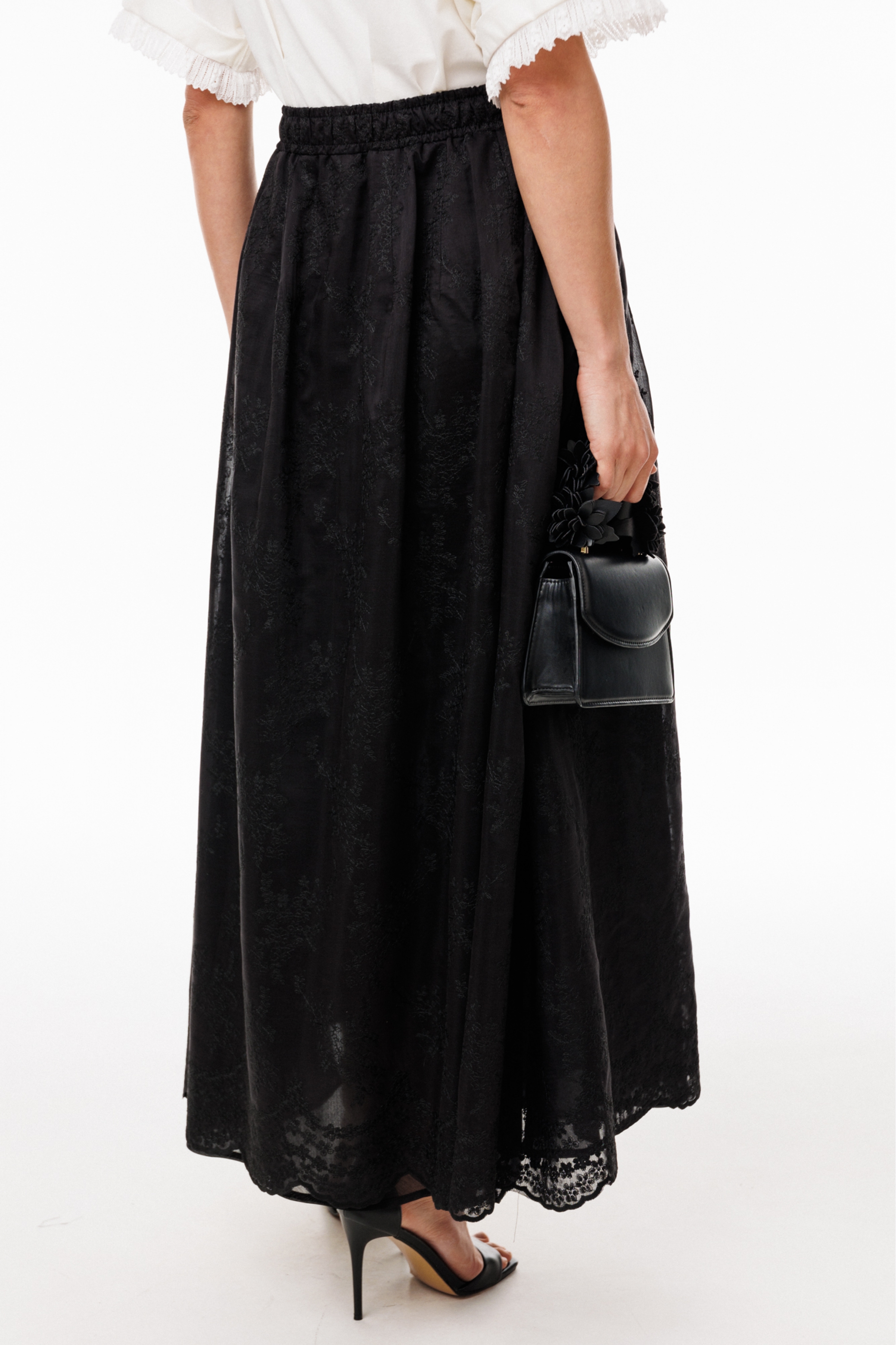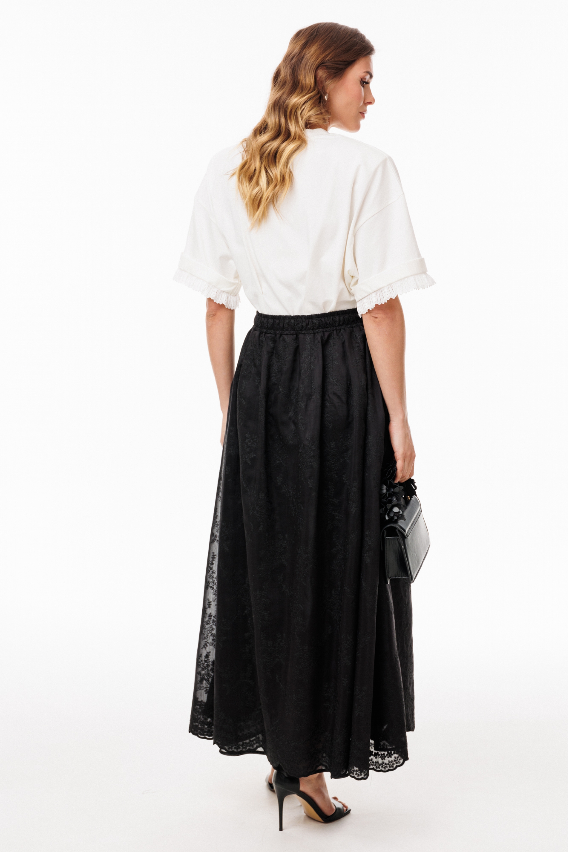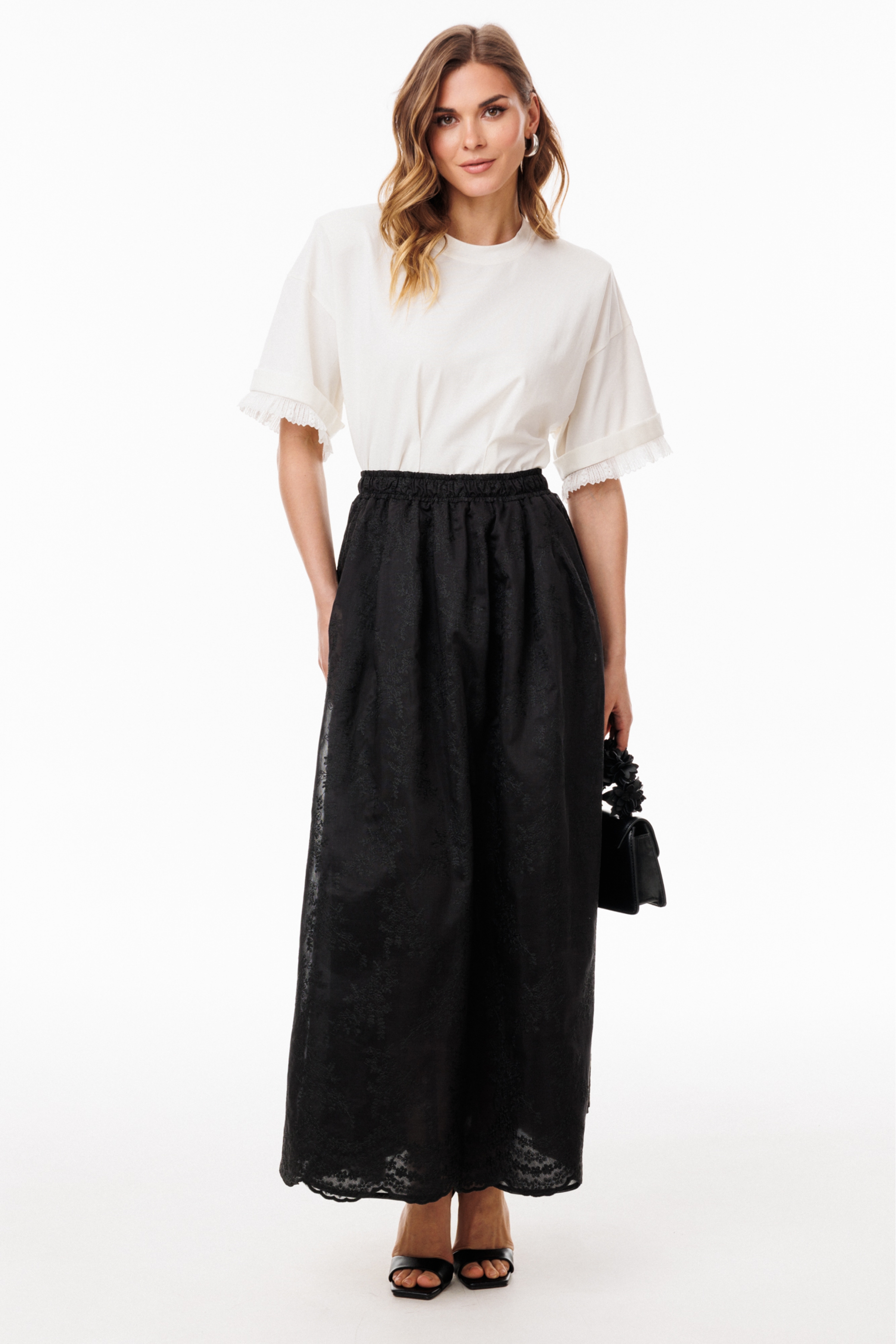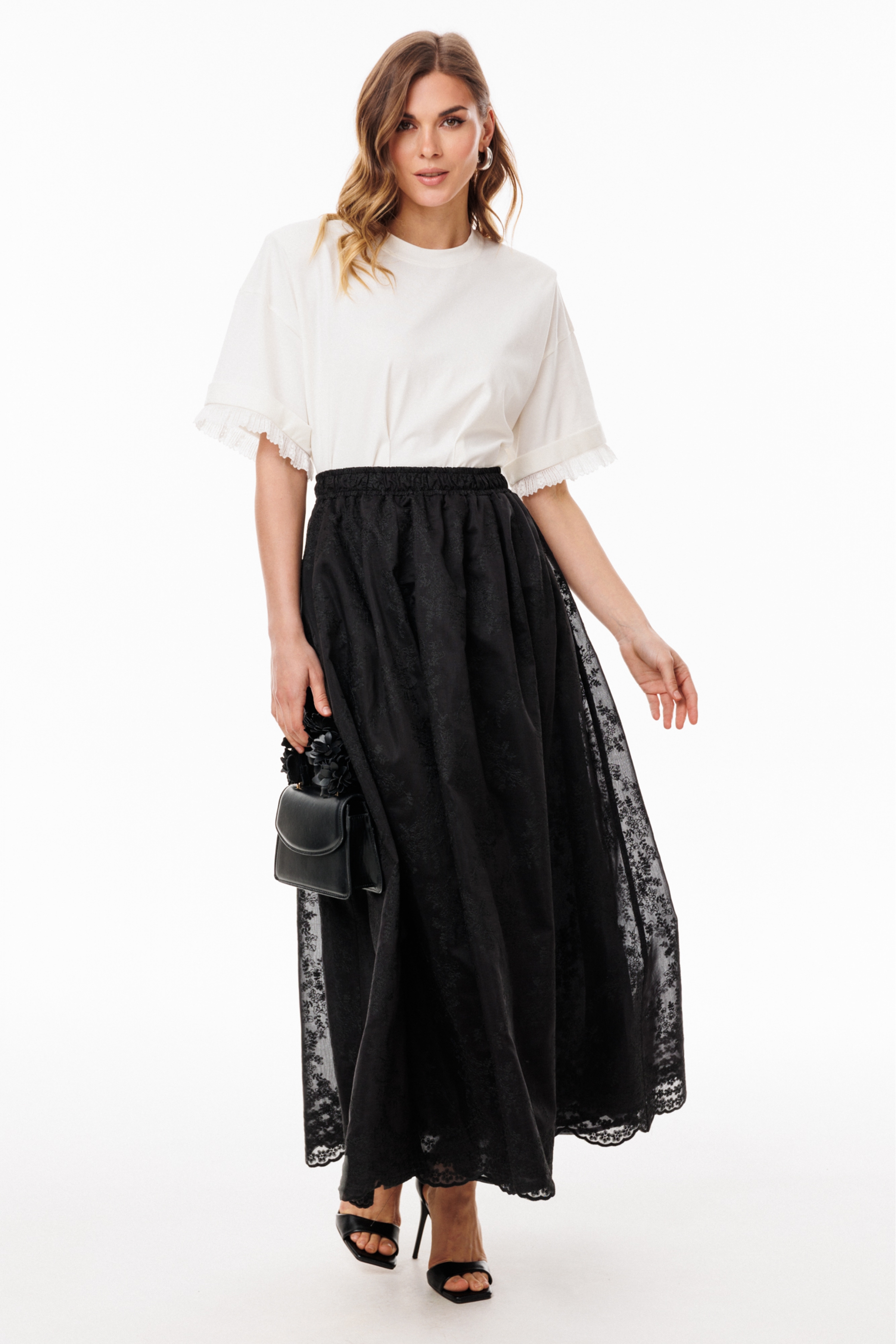 Юбка выполнена из плательно-блузочной ткани с вышивкой. Юбка А-образного силуэта, длиной выше линии щиколотки, на притачном поясе с эластичной тесьмой. На переднем и заднем полотнищах обработаны по шесть талиевых вытачек. В боковых швах обработаны карманы. Юбка на отлетной по низу подкладке. По низу юбки фестоны. Ремень в комплект не входит м.0067.