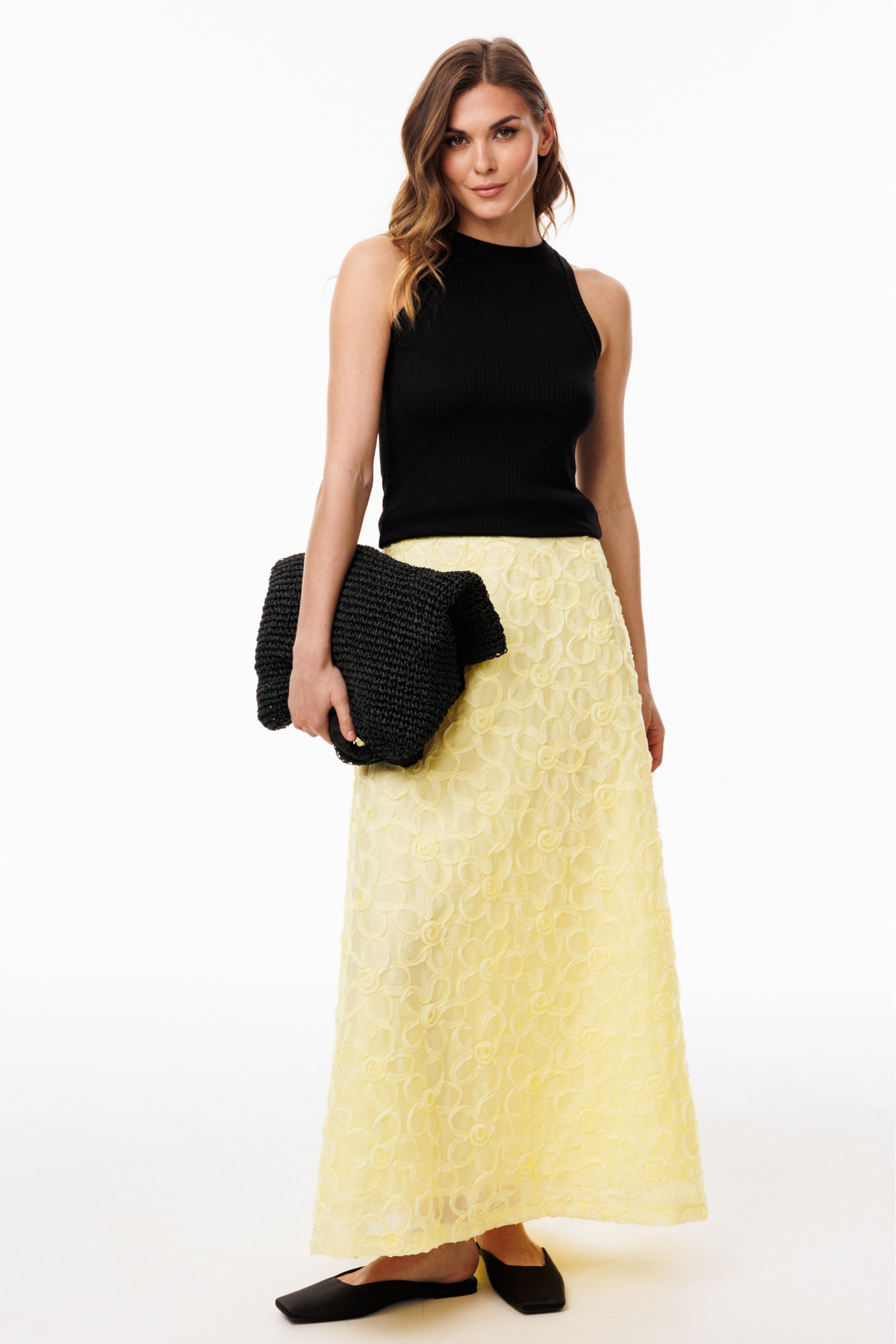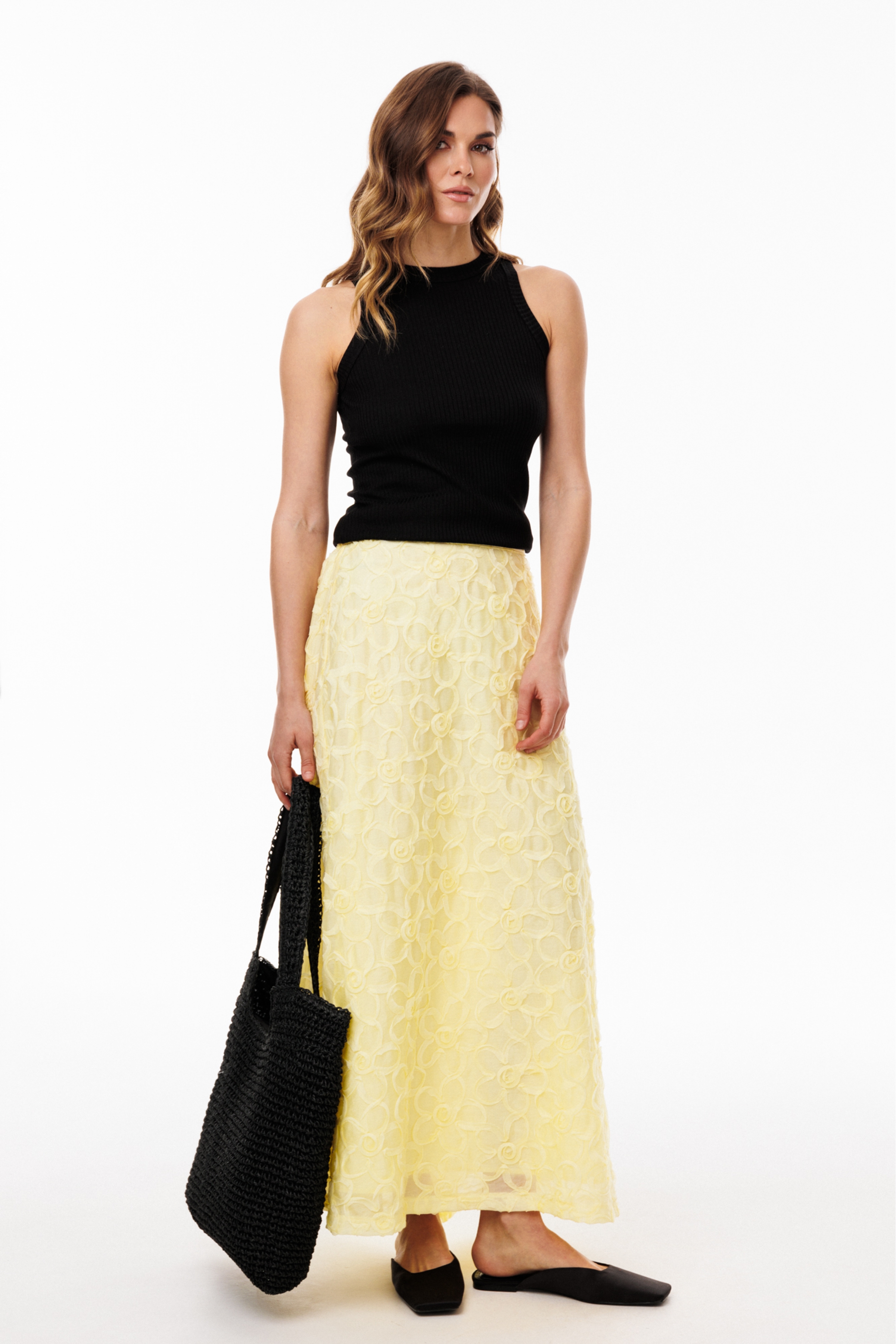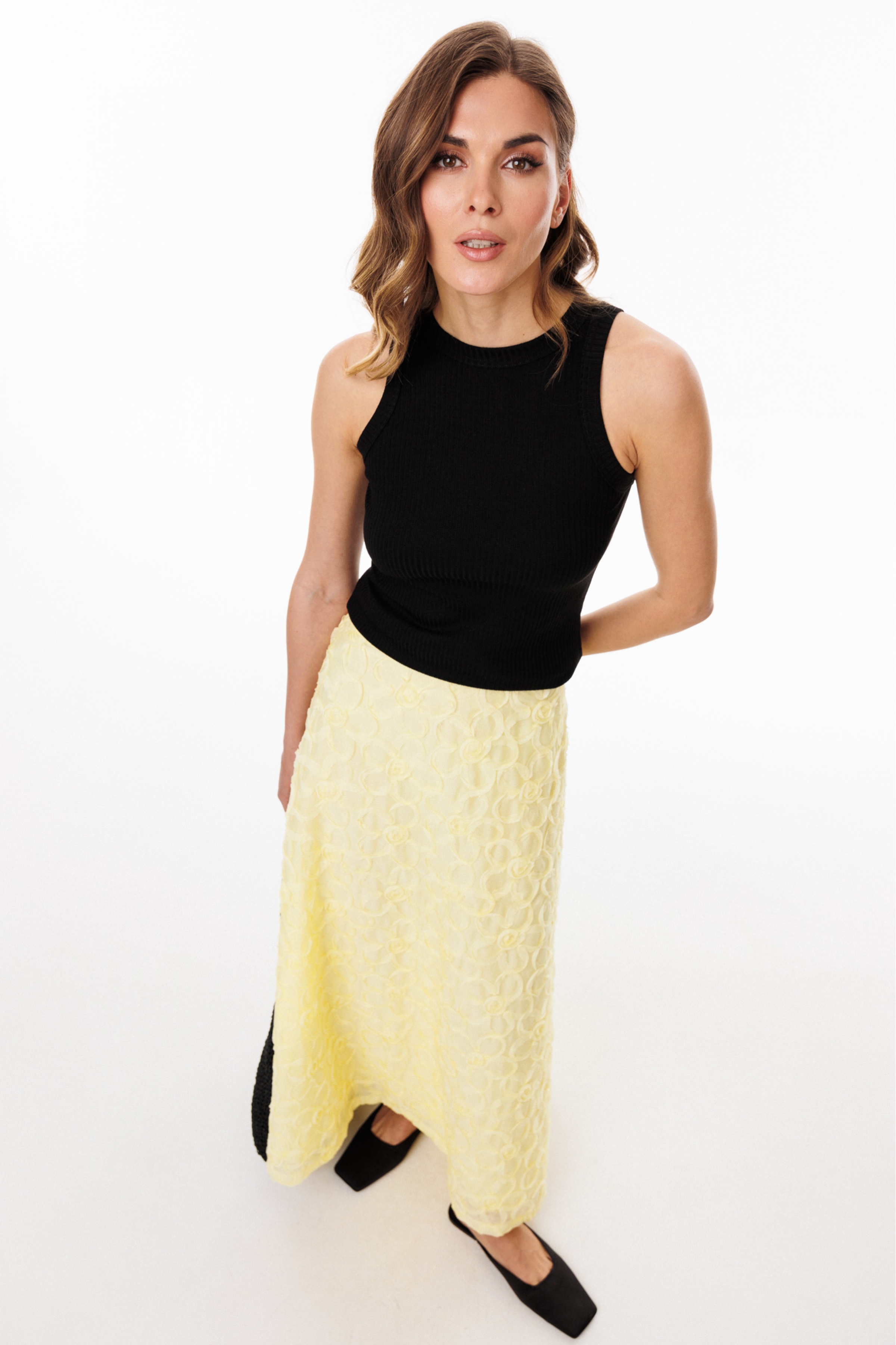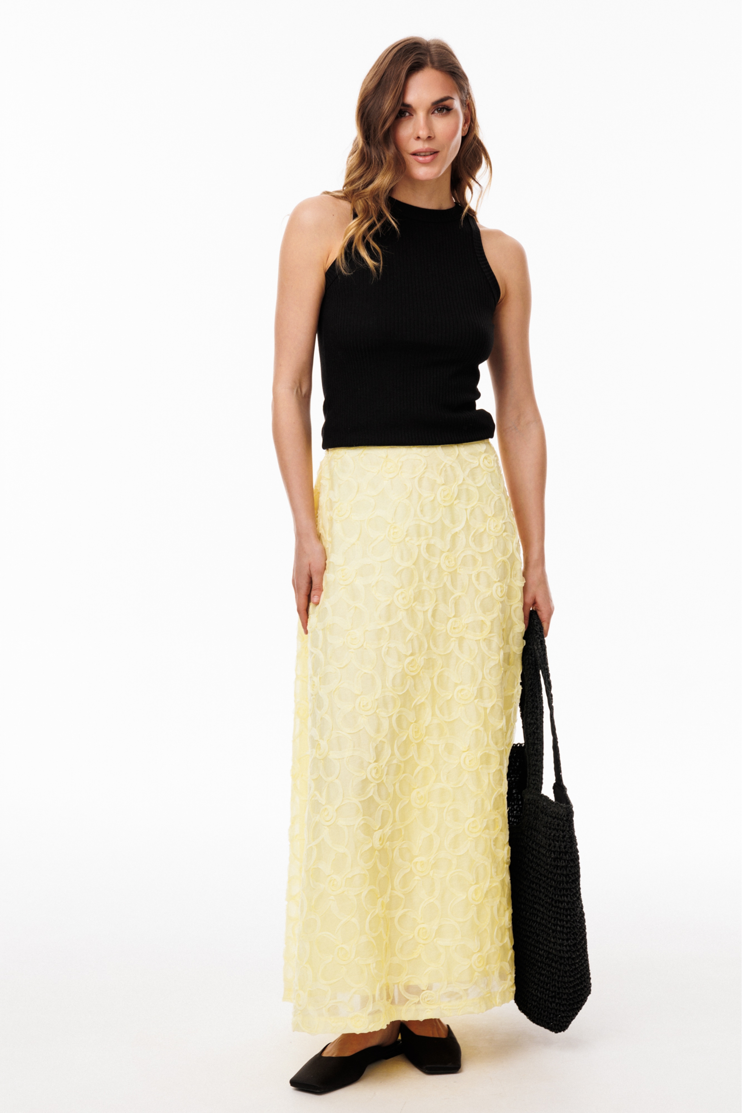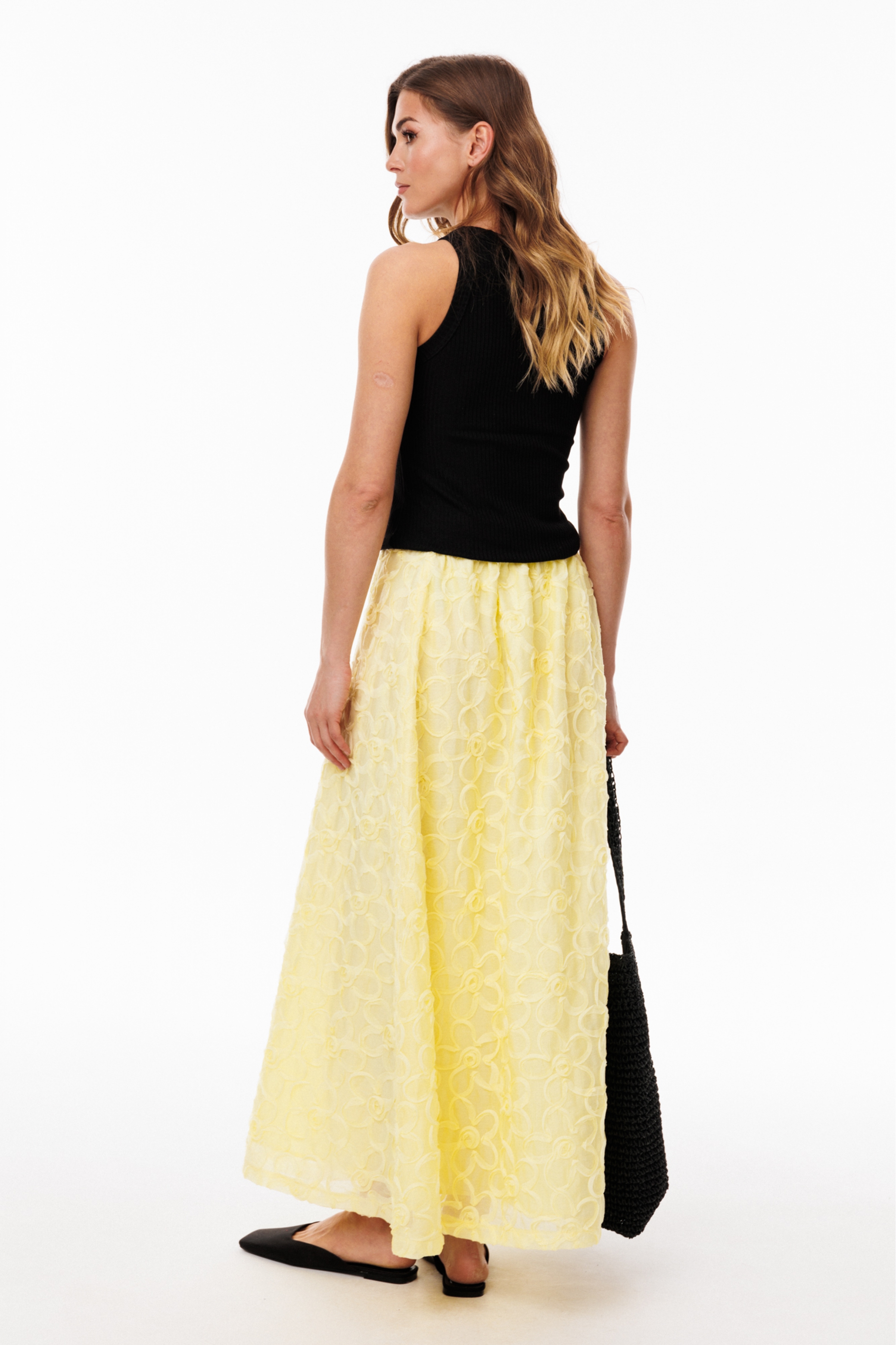Юбка выполнена из плательно-блузочной ткани с настроченными цветами. Юбка А-образного силуэта, на притачном поясе, длиной до линии щиколотки. Передние и задние полотнища цельные и выкроены по косой. По задней части пояса обработана эластичная тесьма.