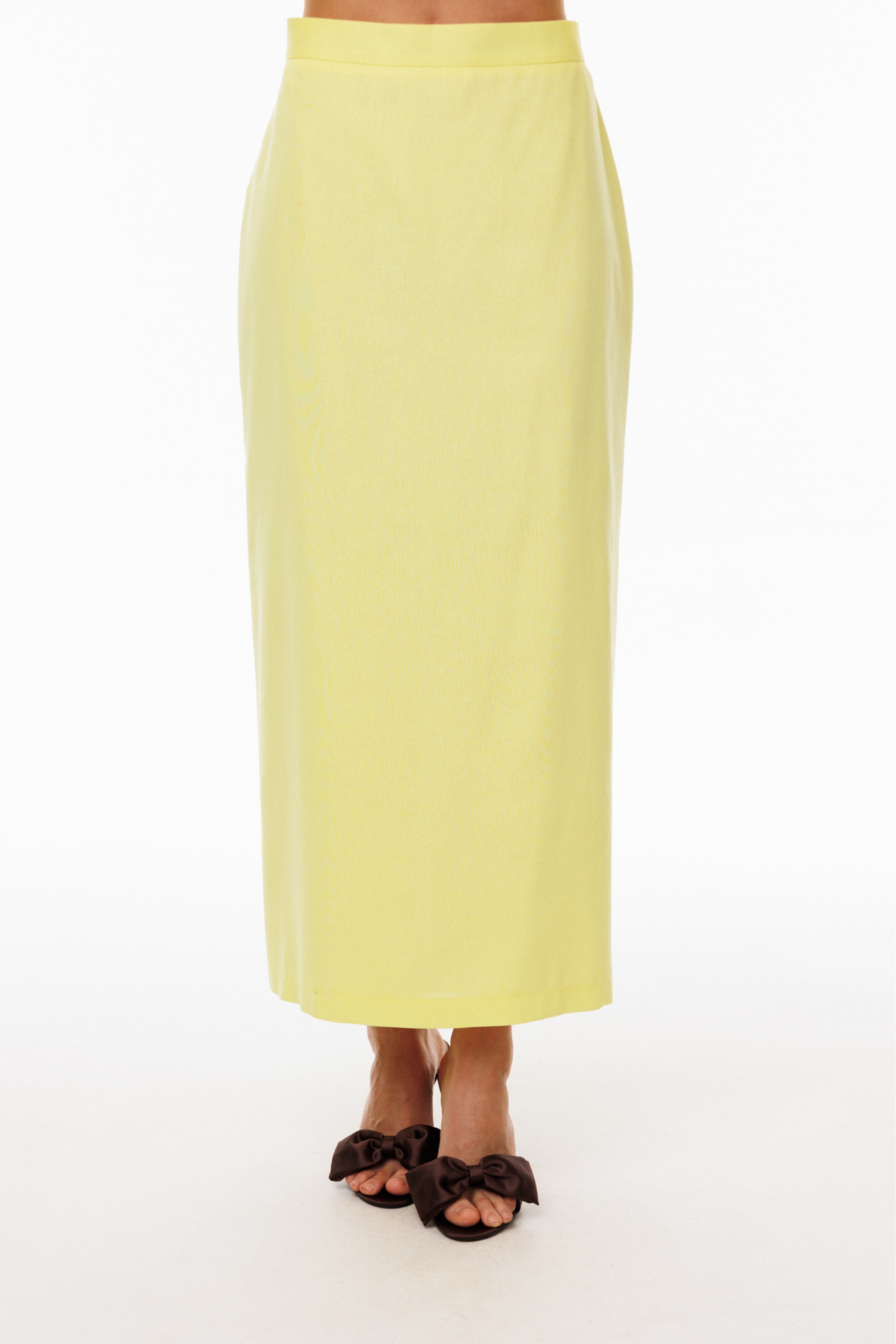 Юбка выполнена из льна. Юбка прямого силуэта, длиной миди, на притачном поясе. Переднее полотнище цельное. На заднем полотнище обработаны талиевые вытачки, средний шов, разрез и застежка на потайную молнию. Пояс застегивается на петлю и пуговицу. Юбка на подкладке.