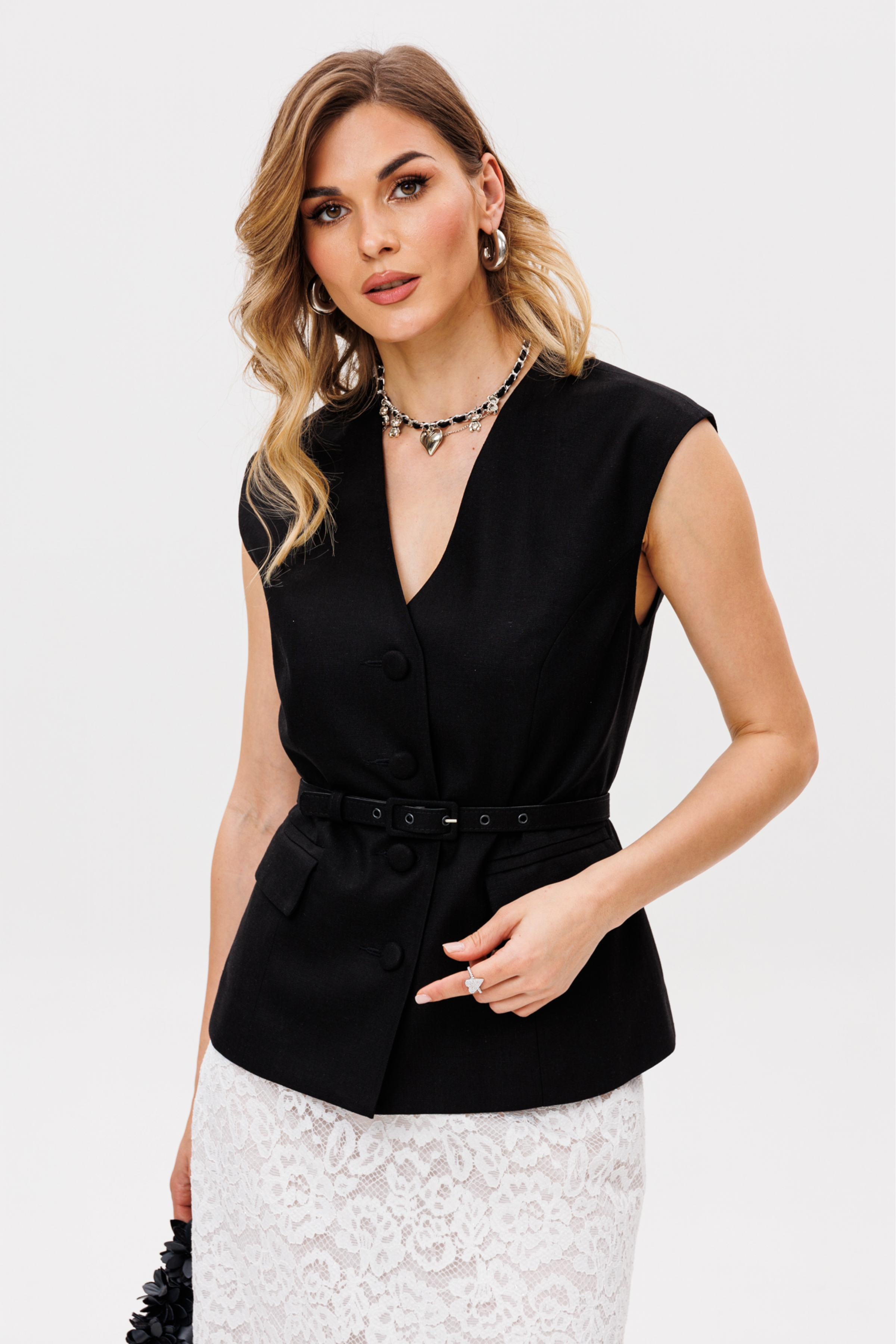 Жилет выполнен из льна. Жилет полуприлегающего силуэта, длиной выше линии бедер. Спереди рельефы, прорезные карманы с клапанами и центральная бортовая застежка на пуговицы. На спинке рельефы. Горловина V-образной формы. Плечевой шов удлинен. Жилет на притачной по низу подкладке. В комплект входит ремень из основной ткани.