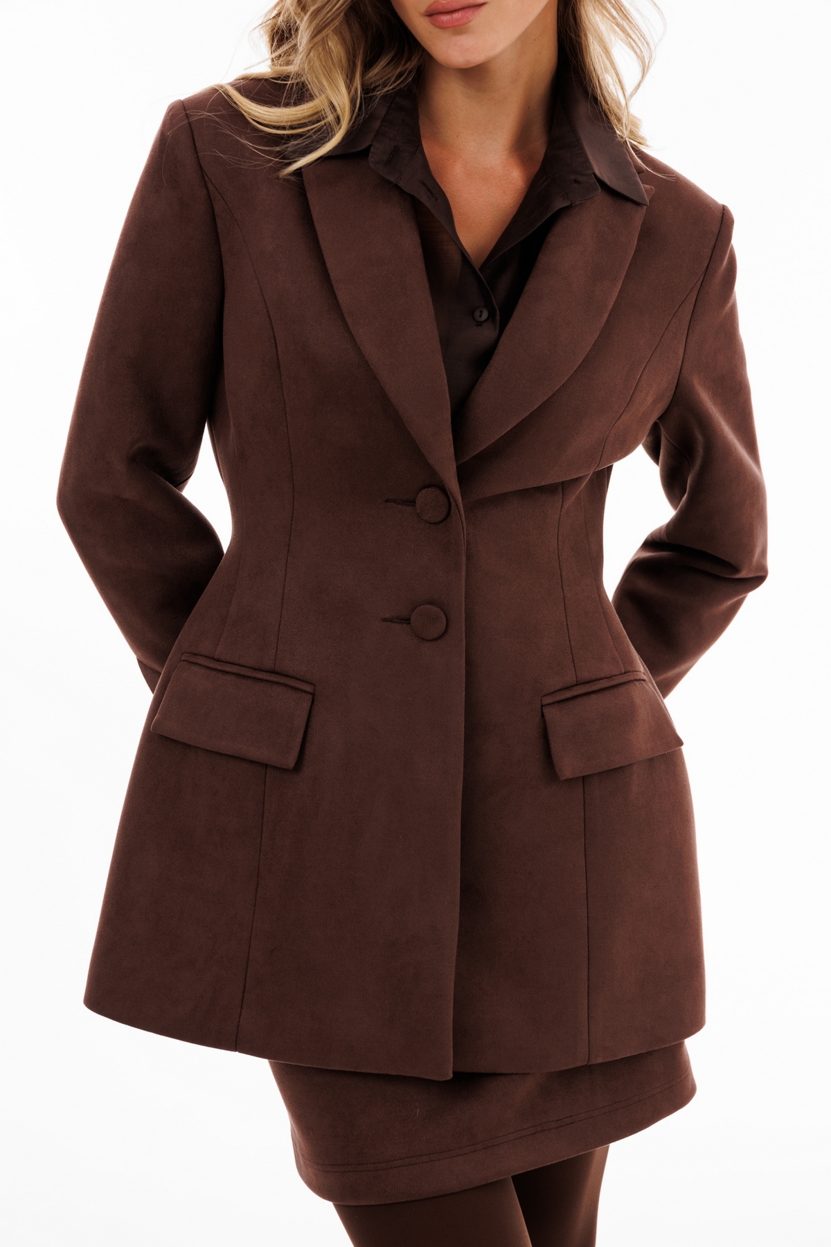 Блузка выполнена из плательно-блузочной ткани. Блузка прямого силуэта, длиной до линии бедер. Спереди центральная застежка на пуговицы. Воротник стояче-отложной. Плечевой шов удлинен. Рукав рубашечного кроя, одношовный с прорезью и двумя складками по низу. Рукав на притачной манжете. Низ блузки фигурной формы. В комплект входит пояс из основной ткани.
