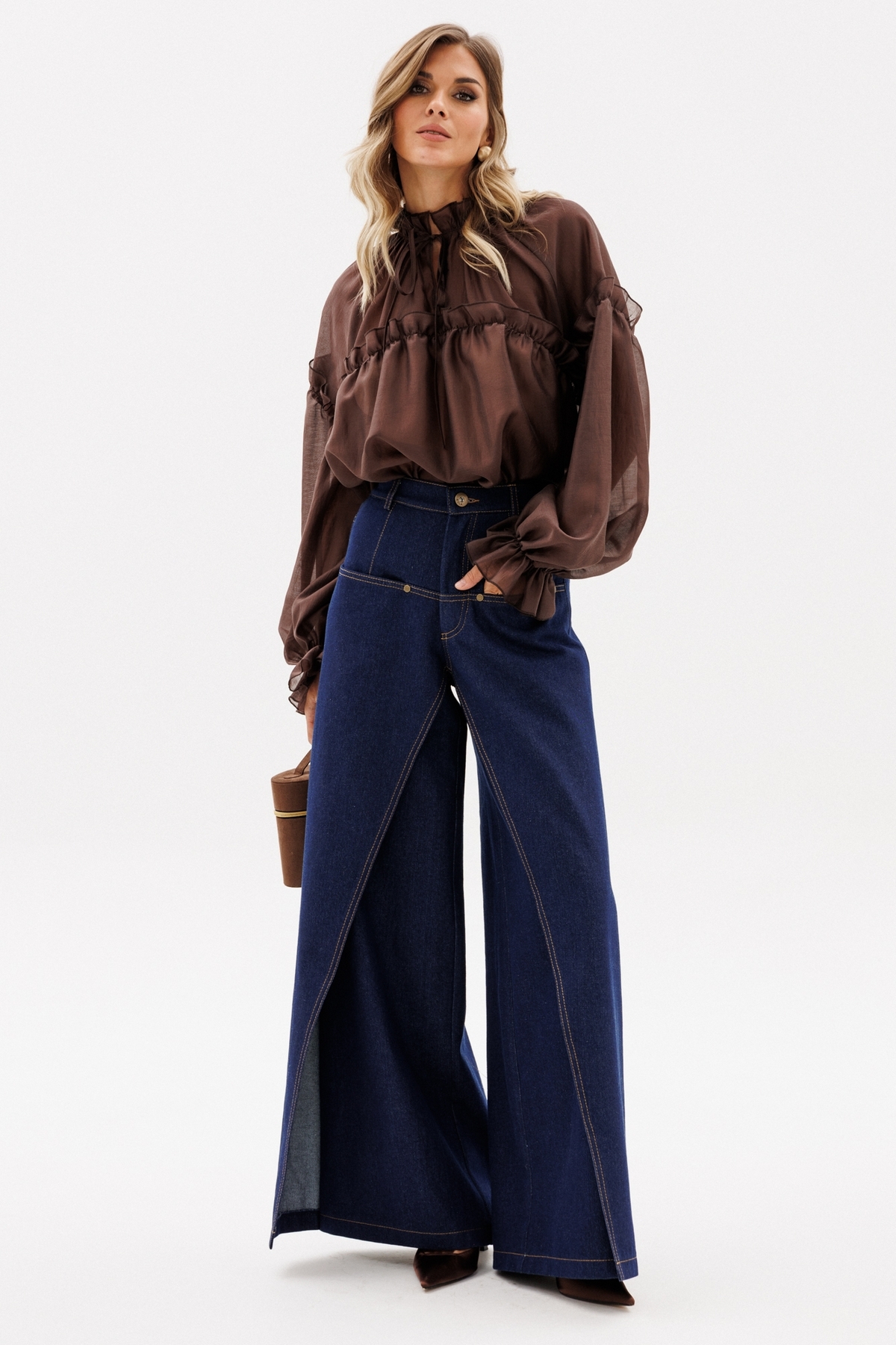 Блузка выполнена из плательно-блузочной ткани. Блузка прямого силуэта, длиной до линии бедер. Спереди и по спинке средний шов и кокетки со сборками от них. Рукав реглан, расширенный к низу.  Блузка декоррирована оборками из основной ткани по линиям кокеток переда и спинки, и по верхнему шву рукава.