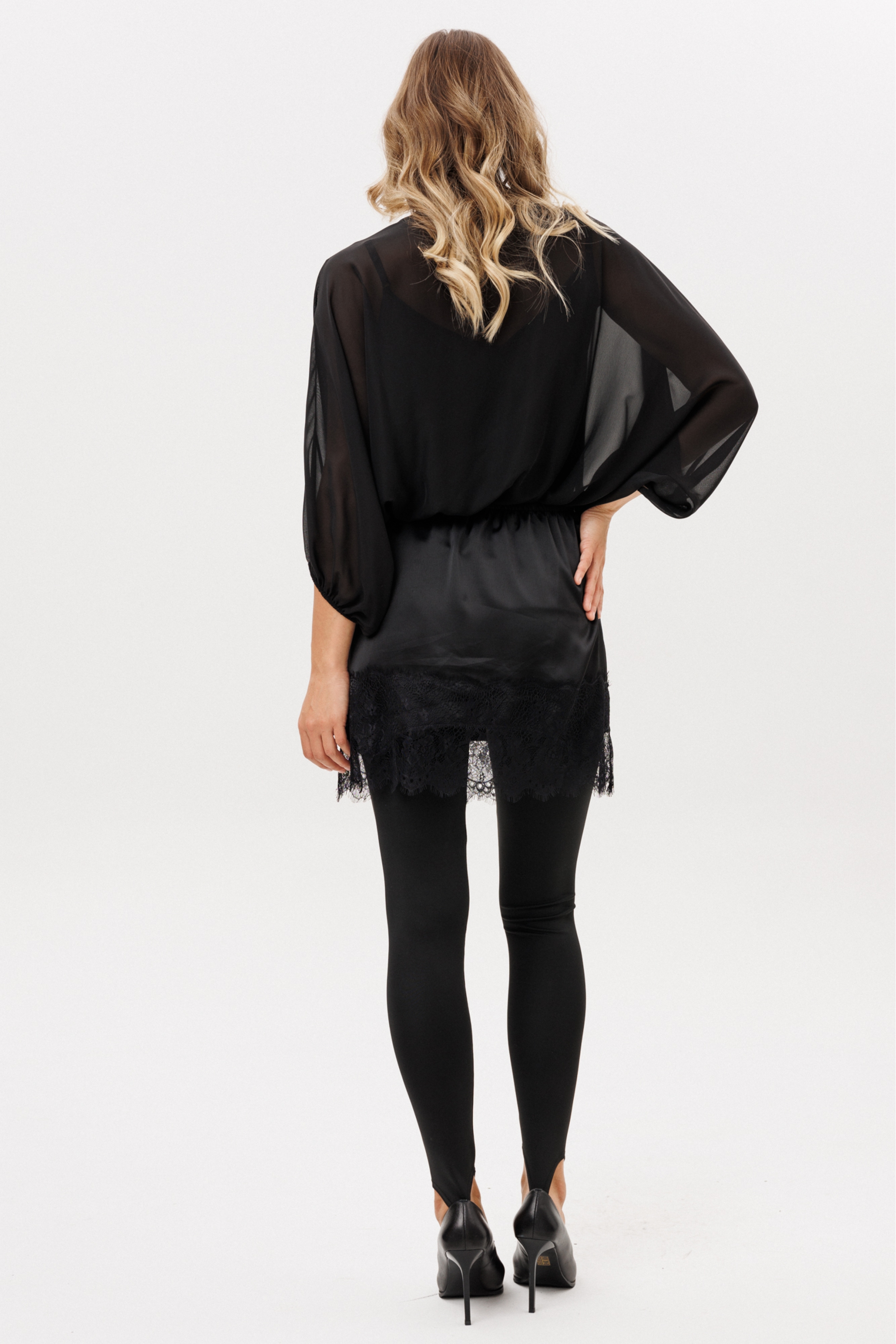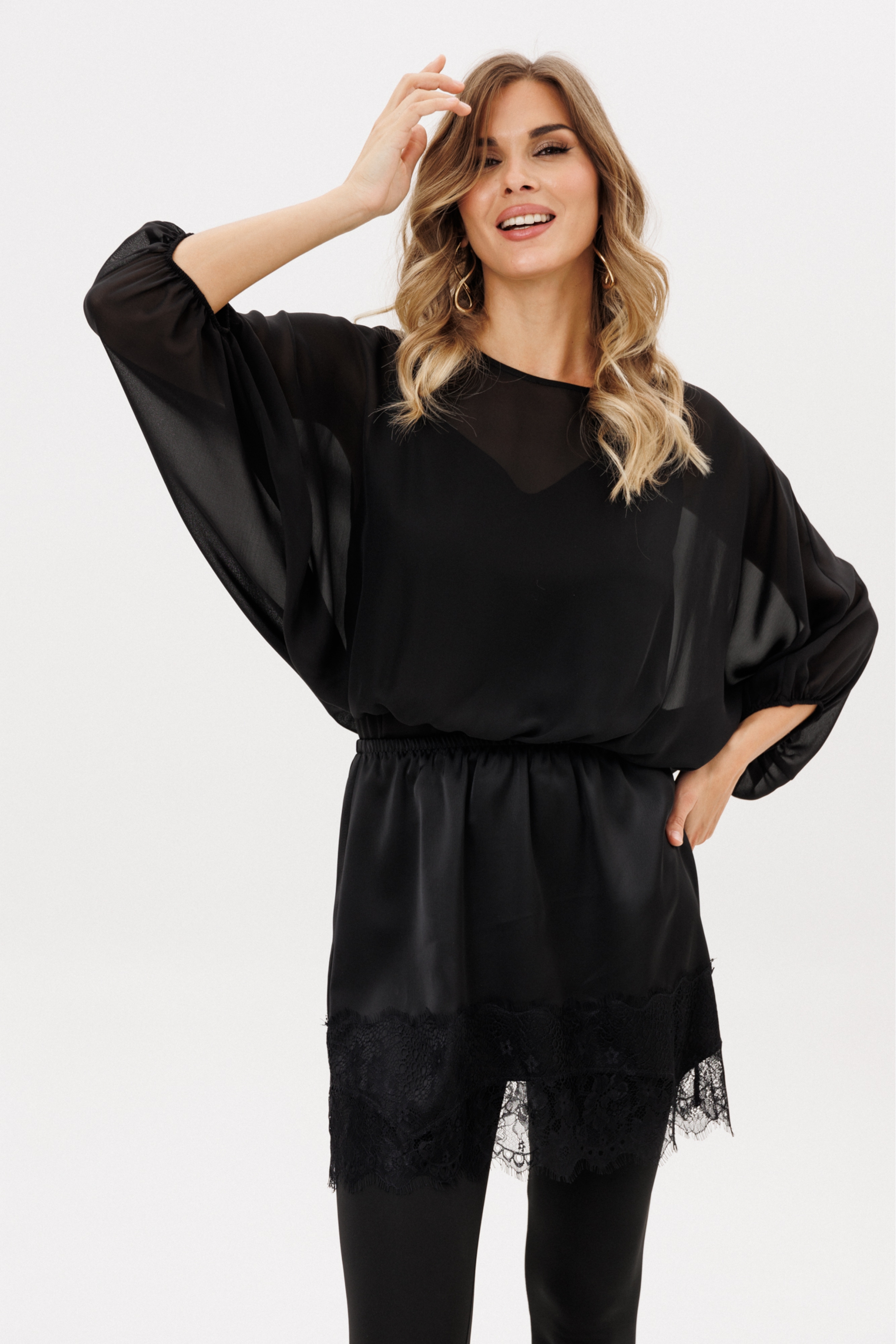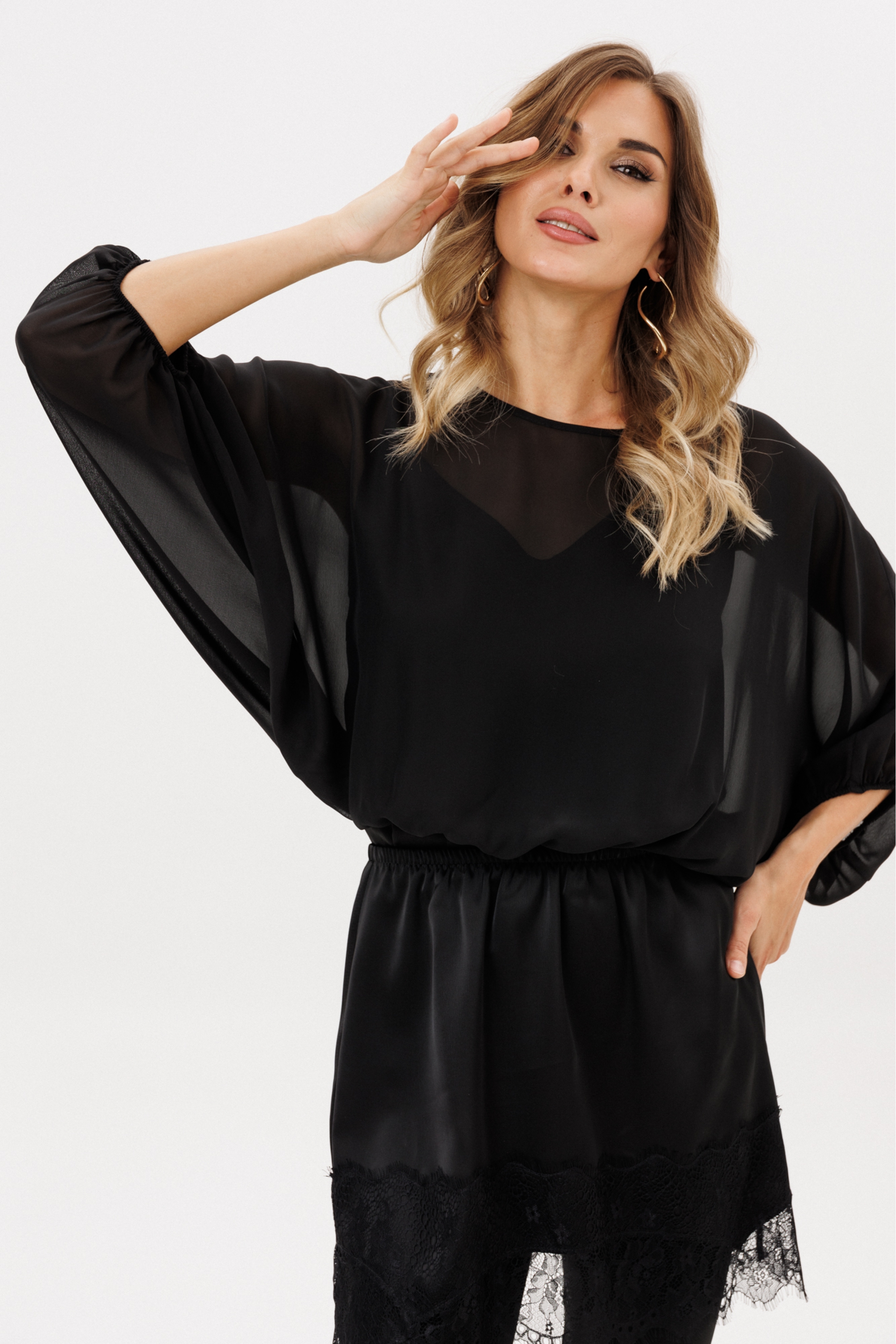 Блузка выполнена из шифона. Блузка О-образного силуэта, длиной до линии талии. Перед и спинка цельные. Горловина округлой формы. Рукав покроя "летучая мышь", двухшовный, длиной ниже линии локтя. Низ блузки и рукава на эластичной тесьме. Топ из тонкого атласа в комплект не входит и продается отдельно м.2770.