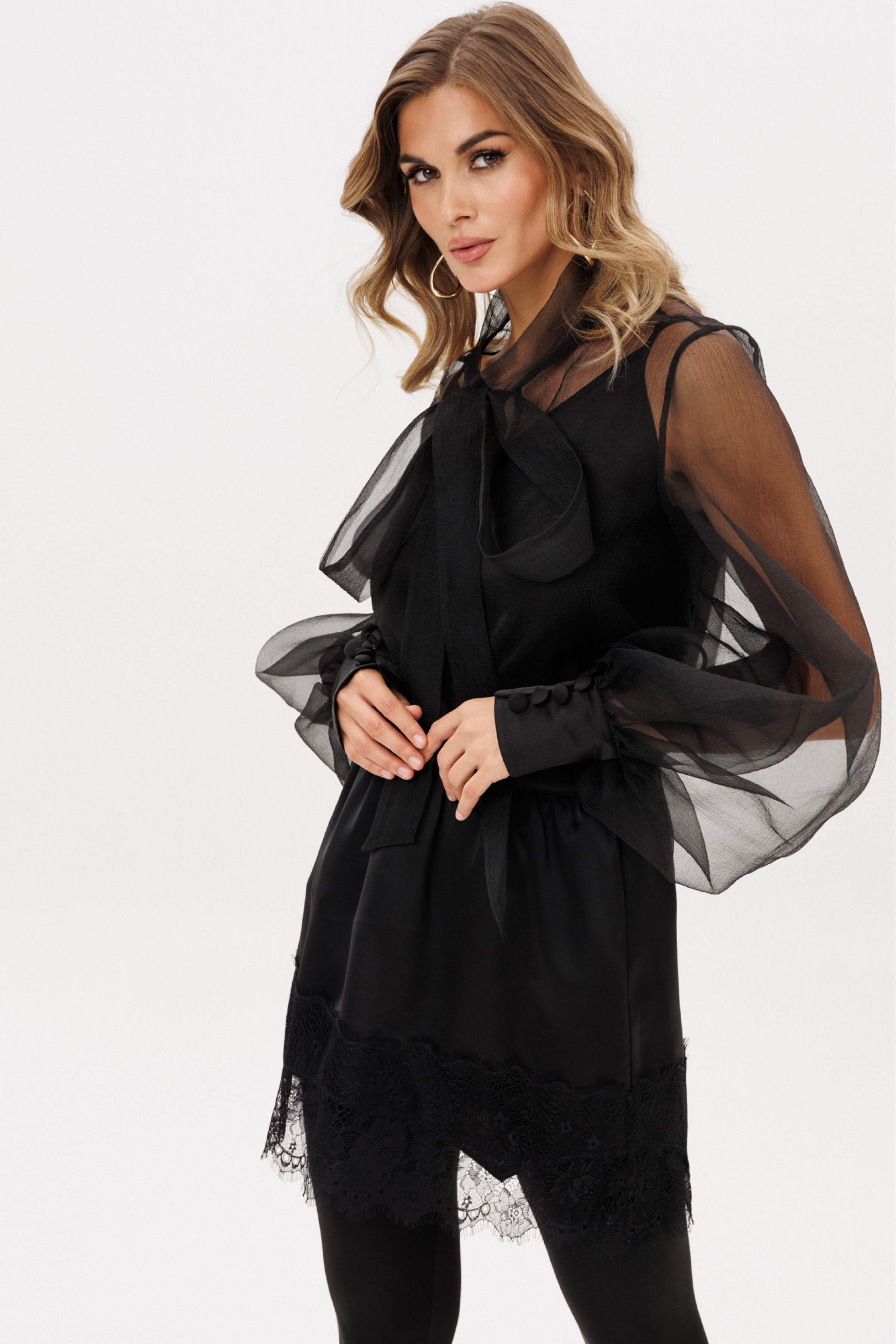 Блузка + топ. Блузка выполнена из органзы. Блузка прямого силуэта, длиной выше линии бедер. Перед и спинка цельные. Спереди прорезь. Воротник-стойка, переходящий в бант. Рукав втачной, одношовный, расширенный к низу и присборенный. Низ рукава на притачной манжете из отделочной ткани, застегивающейся на четыре пуговицы. В комплект входит топ из атласа. Топ на регулируемых бретелях. Перед и спинка топа цельные.