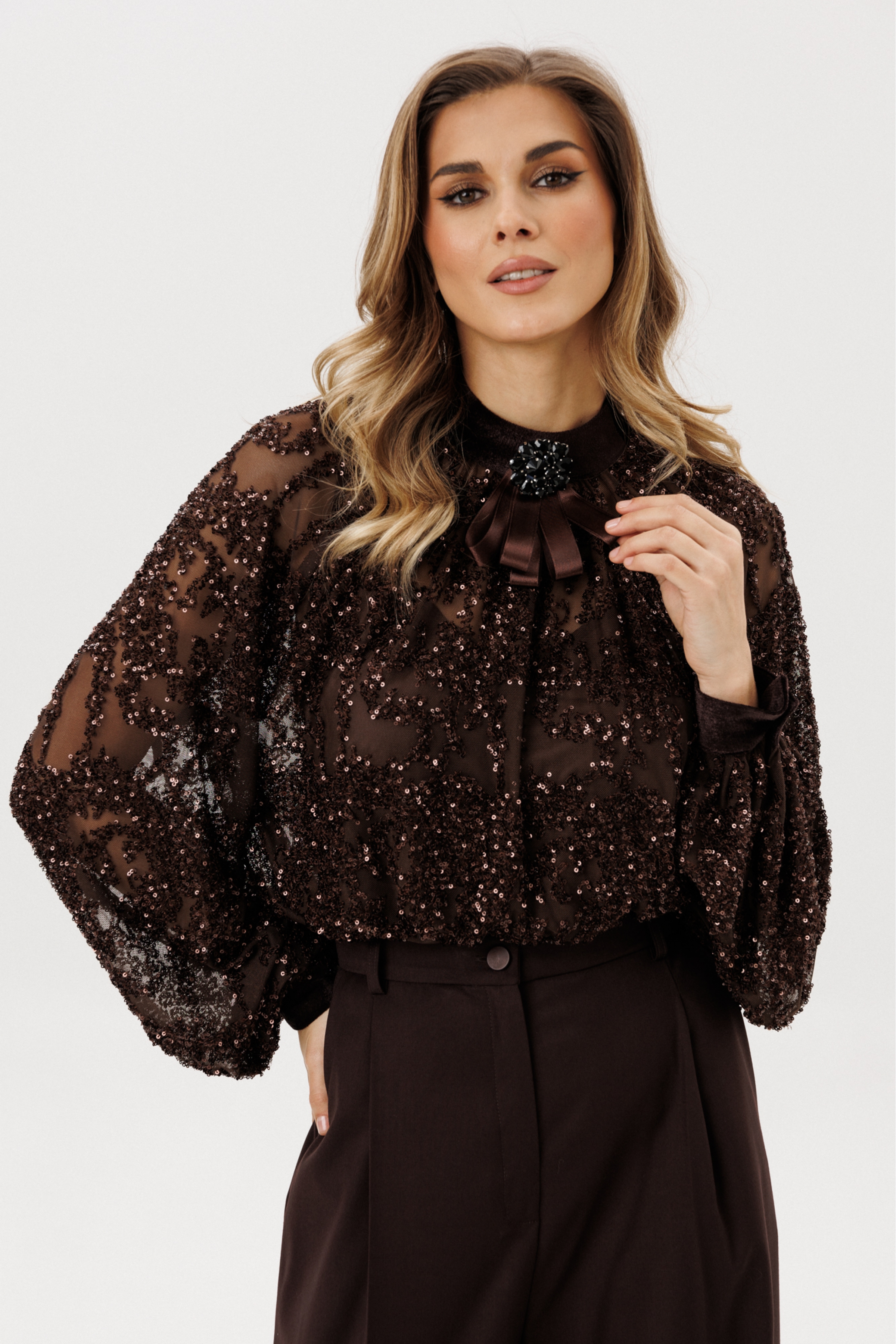 Блузка + топ. Блузка выполнена из сетки с вышивкой пайетками. Блузка прямого силуэта, длиной до линии бедер. Перед и спинка цельные, со сборкой по горловине.  Воротник-стойка. Застежка сзади на две петли и пуговицы. Рукав покроя "реглан", одношовный, со сборкой по горловине и низу. Низ рукава на притачной манжете из велюра, застегивающейся на пуговицу. В комплект входит топ из трикотажной подкладки. Топ прямого силуэта, длиной до линии бедер, бретели регулируются по длине. В комплект входит декоративная брошь.