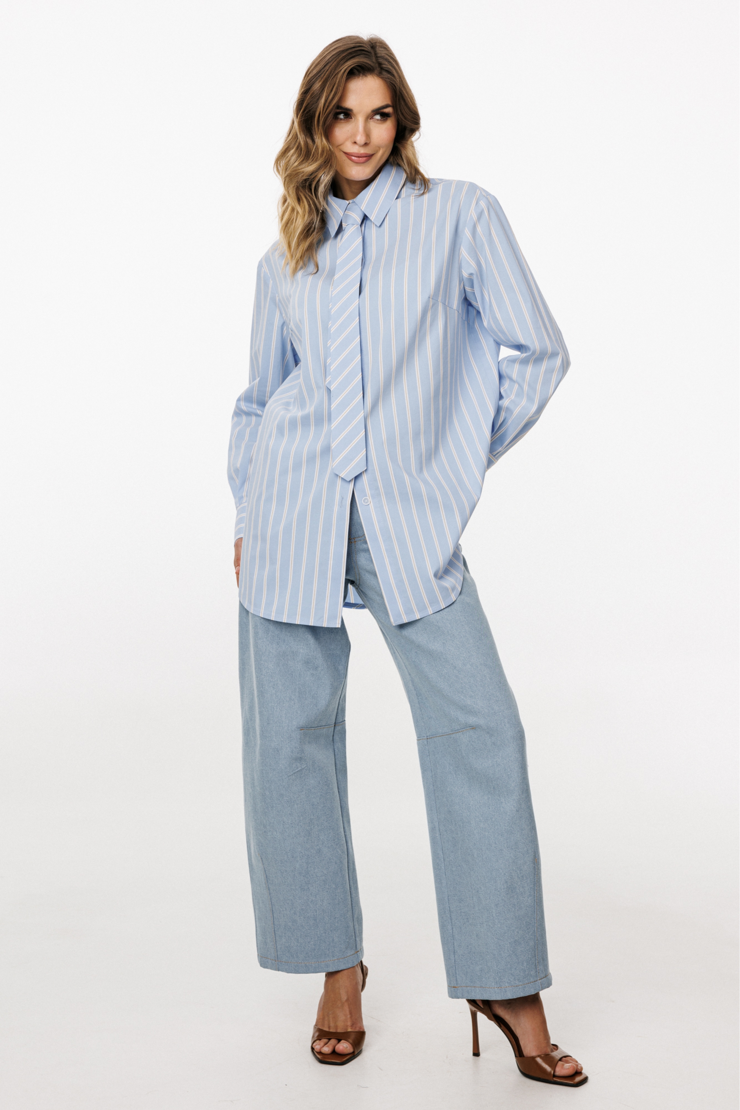 Джинсы-багги выполнены из плотного джинса. Брюки на притачном поясе, длиной до линии щиколотки, расширенные от бедер и слегка зауженные к низу. Спереди боковые карманы с фигурным входом. Застежка на пуговицу и молнию с гульфиком. На задних частях кокетки и накладные карманы. На передней и задней части коленные вытачки.