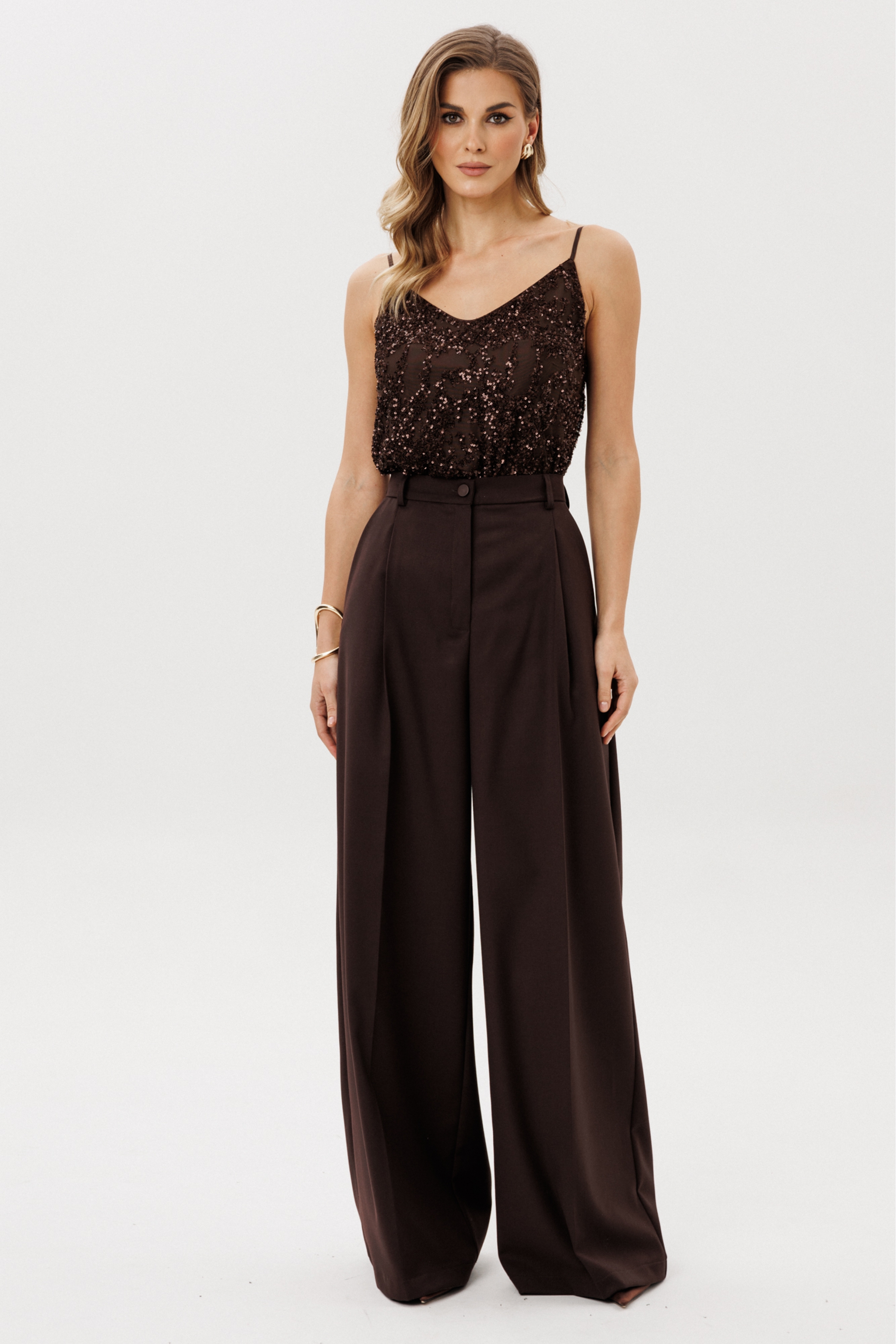 Брюки-палаццо выполнены из плательно-костюмной ткани. Брюки на притачном поясе, длиной в пол, расширенные к низу. Спереди складки и боковые карманы с наклонным входом. Застежка спереди на молнию с гульфиком и пуговицу. На задних частях обработаны талиевые вытачки.