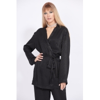 Комплект: блузка + брюки. Комплект выполнен из плательной ткани. Блузка прямого силуэта, длиной ниже линии бедер. Перед выполнен "на запах". Застежка спереди на одну пришивную кнопку. Спинка цельная. Вырез V-образной формы. Горловина и борта обработаны притачной планкой. Плечевой шов слегка спущен. Рукав одношовный. В боковых швах разрезы. Брюки на притачном поясе с эластичной тесьмой, прямого покроя, длиной в пол. В боковых швах карманы с наклонным входом. В комплект входит съемный пояс из основной ткани.
