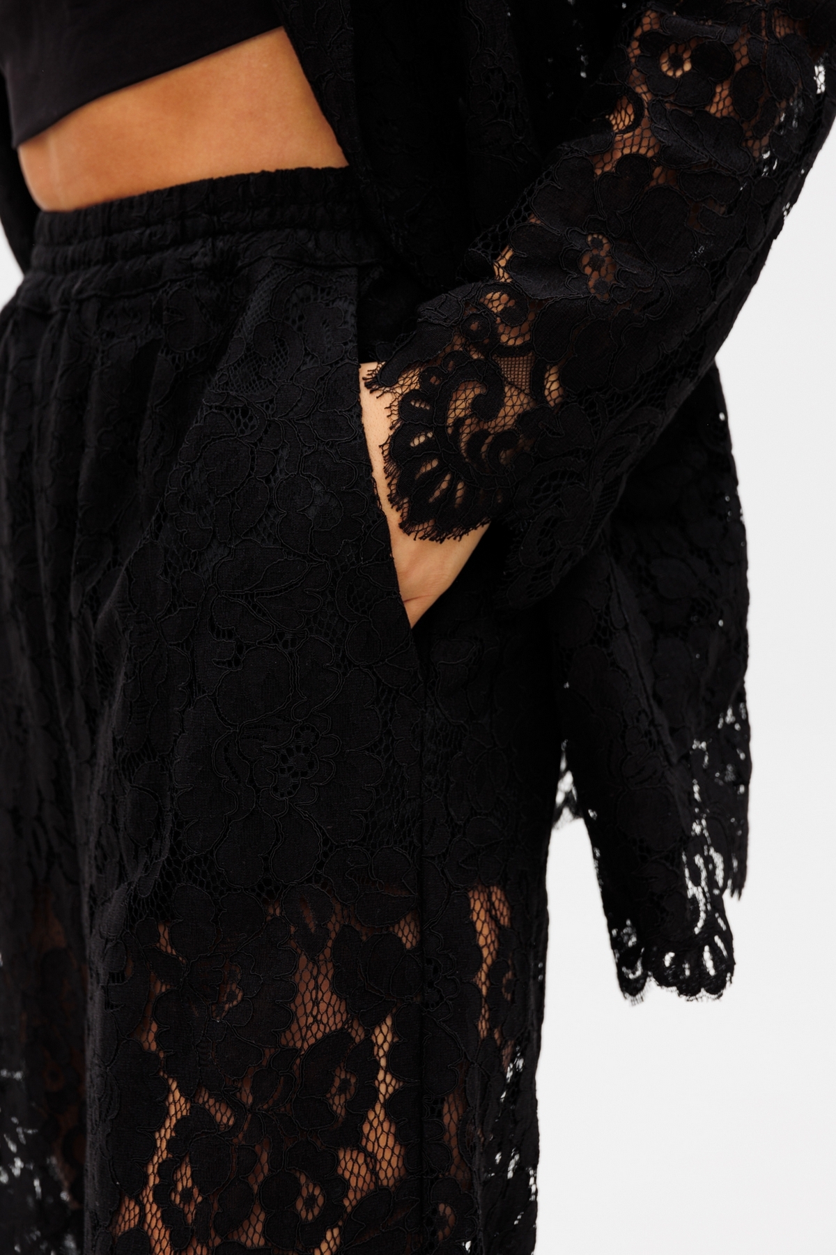 Комплект: жакет +брюки. Комплект выполнен из гипюра. Жакет прямого силуэта до линии бедер. Спереди накладные карманы. Центральная двубортная застежка на пуговицы. Горловина пиджачного типа. Рукав втачной двухшовный. Брюки прямого силуэта на притачном поясе с эластичной тесьмой. В боковых швах карманы с наклонным входом. Брюки на отлетной подкладке в виде шорт.