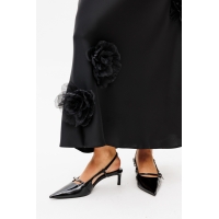 Юбка выполнена из плотного атласа. Юбка расширенная к низу, на притачном поясе, длиной миди. Переднее и заднее полотнища цельные и выкроены по косой. Застежка в левом боковом шве на потайную молнию и пуговицу. Юбка спереди декорирована объемными цветами. Юбка без подкладки.