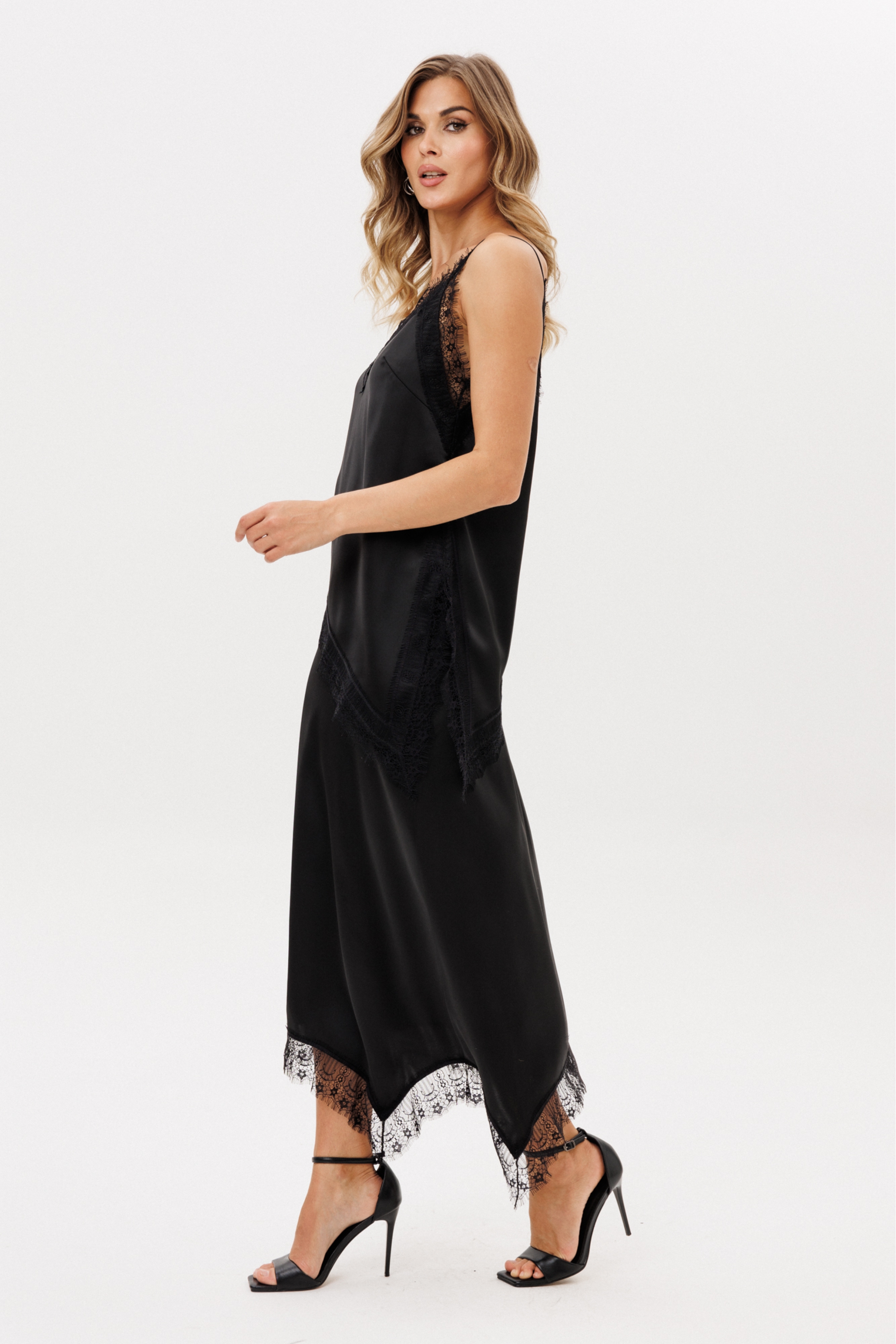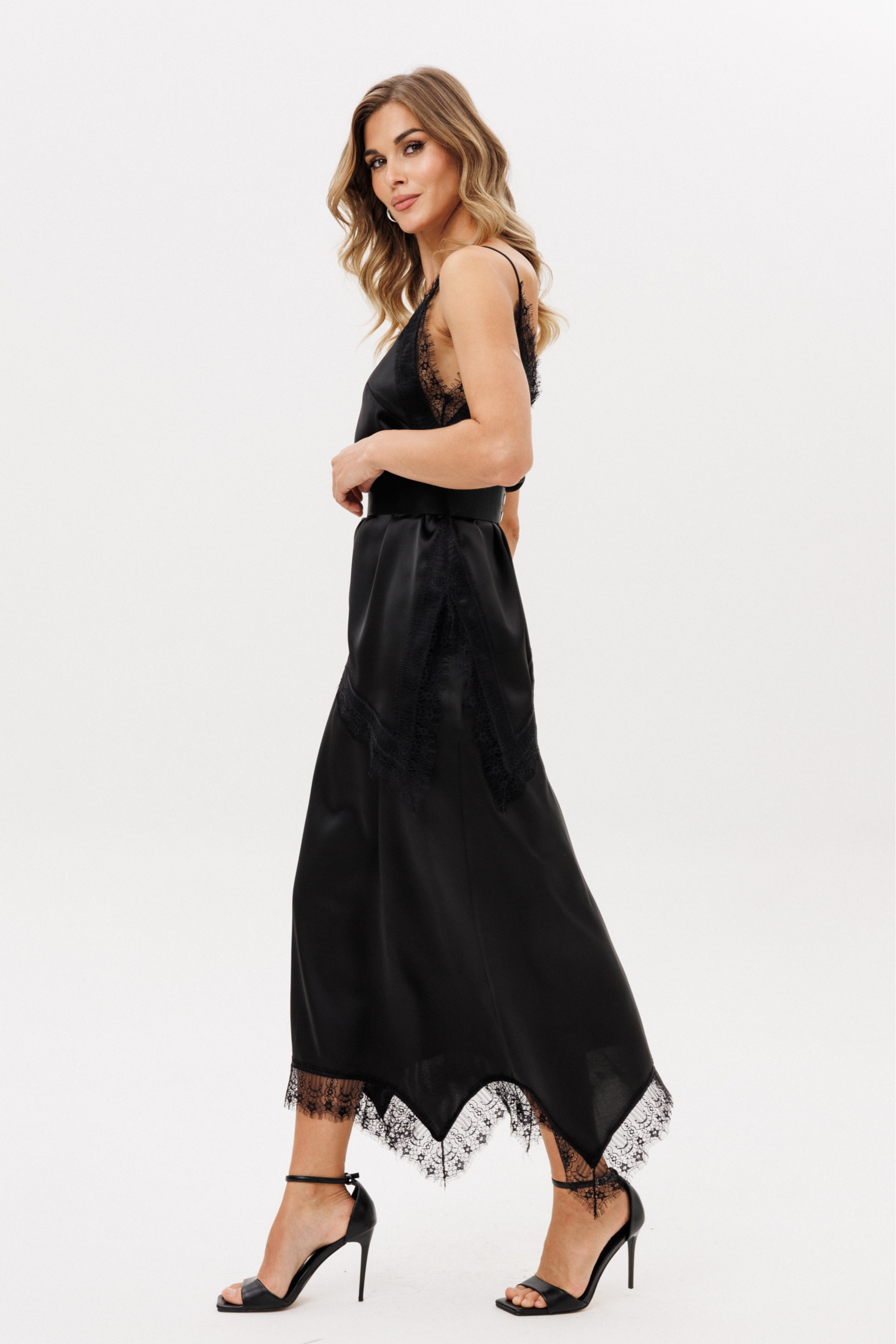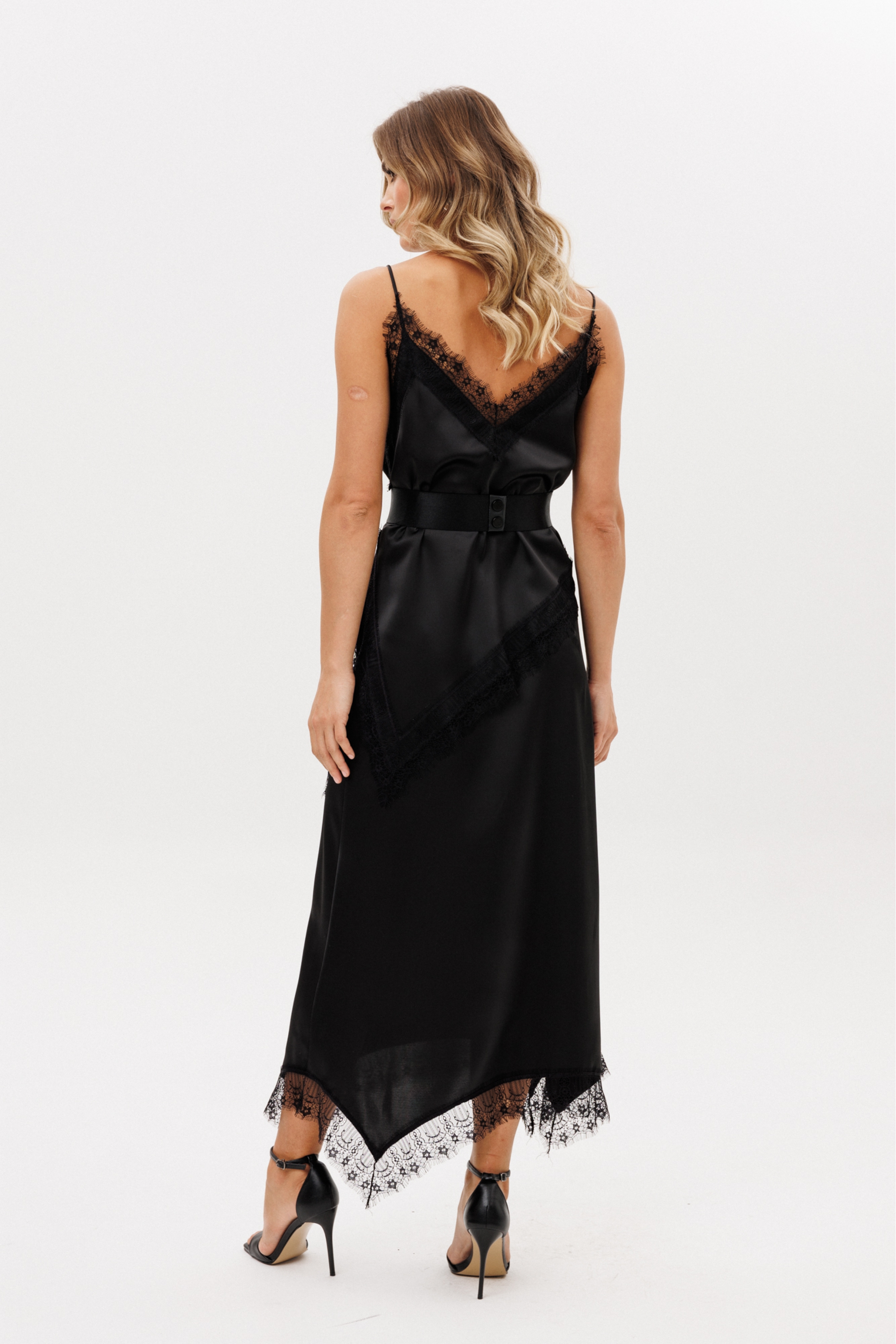 Юбка выполнена из атласа. Юбка А-образного силуэта, длиной миди. Переднее и заднее полотнище цельные и расширены к низу. Низ юбки фигурной формы, обработан кружевом. ВЗастежка в левом боковом шве на потайную молнию и пуговицу. Юбка без подкладки.
