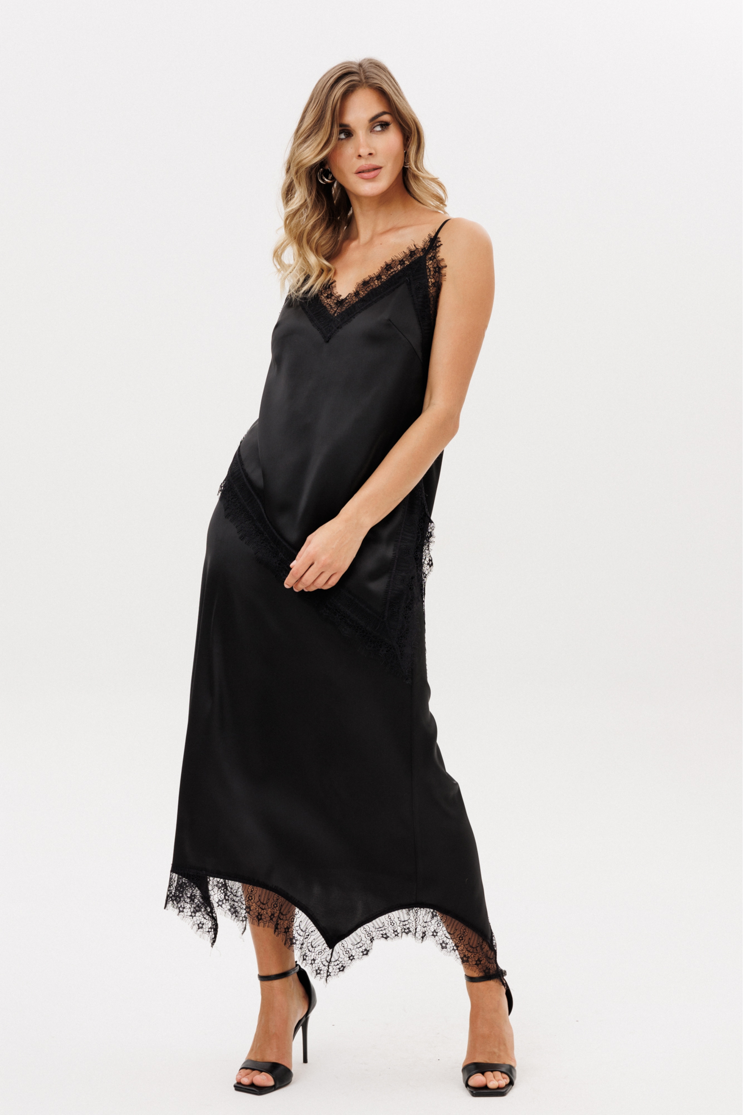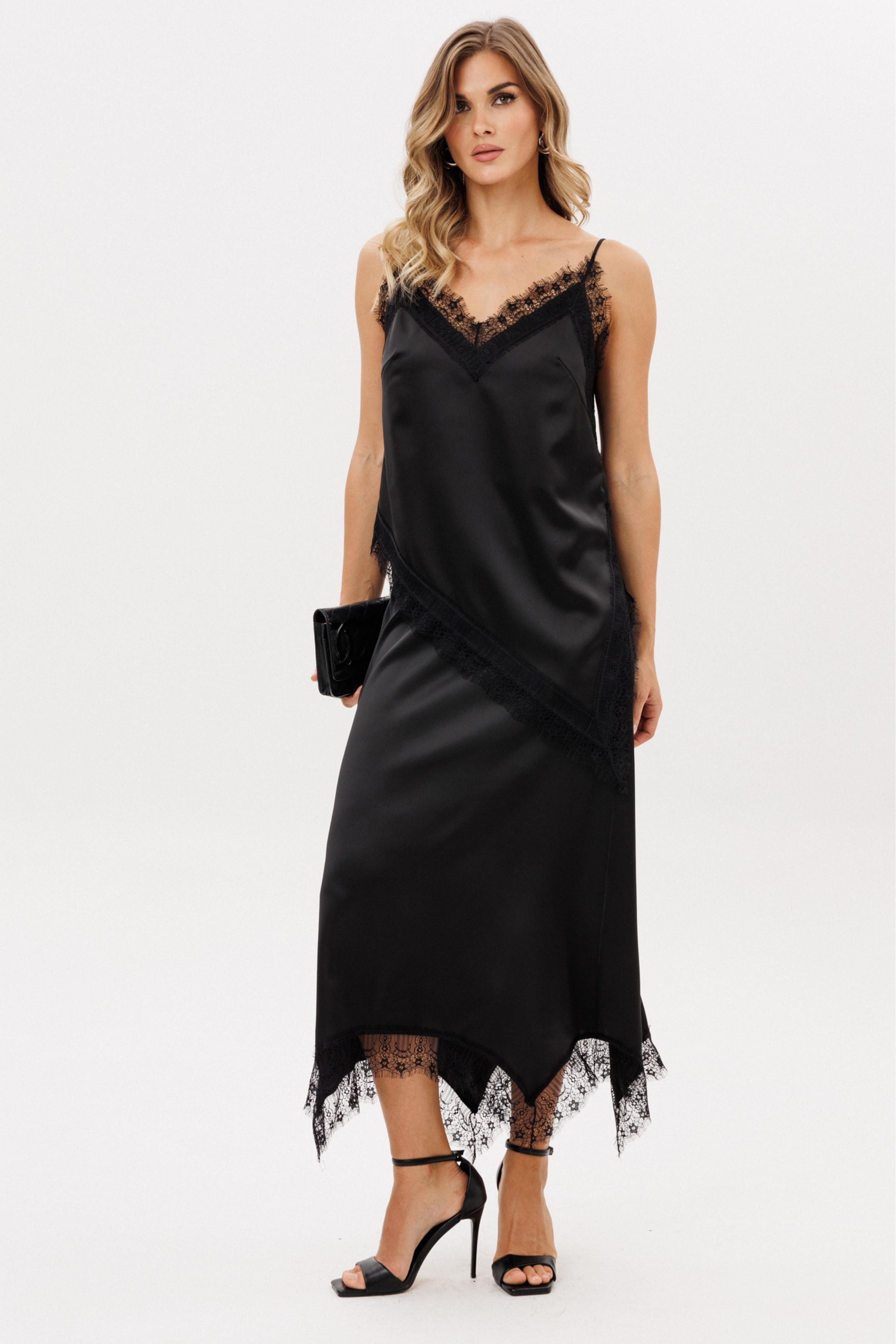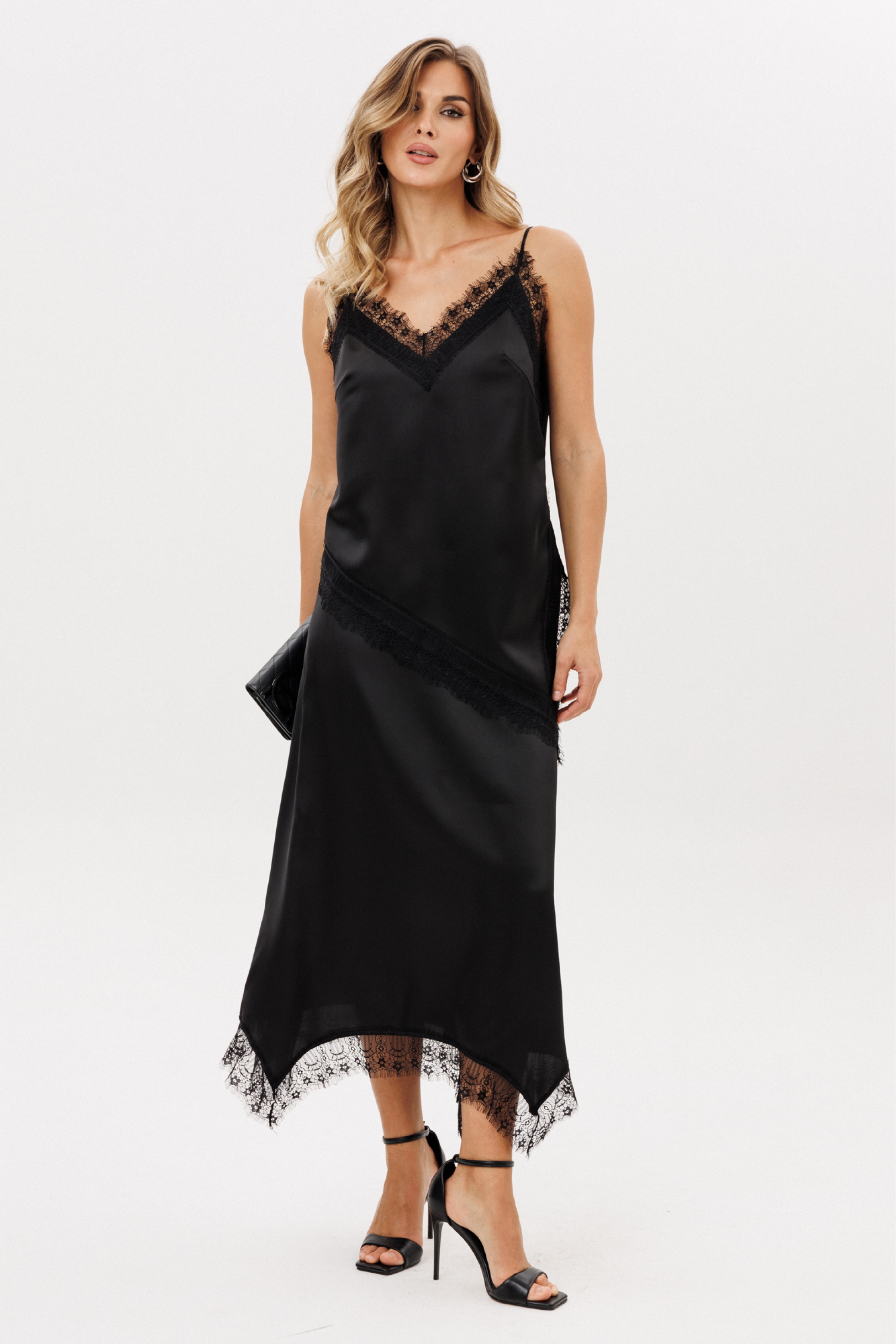 Юбка выполнена из атласа. Юбка А-образного силуэта, длиной миди. Переднее и заднее полотнище цельные и расширены к низу. Низ юбки фигурной формы, обработан кружевом. ВЗастежка в левом боковом шве на потайную молнию и пуговицу. Юбка без подкладки.