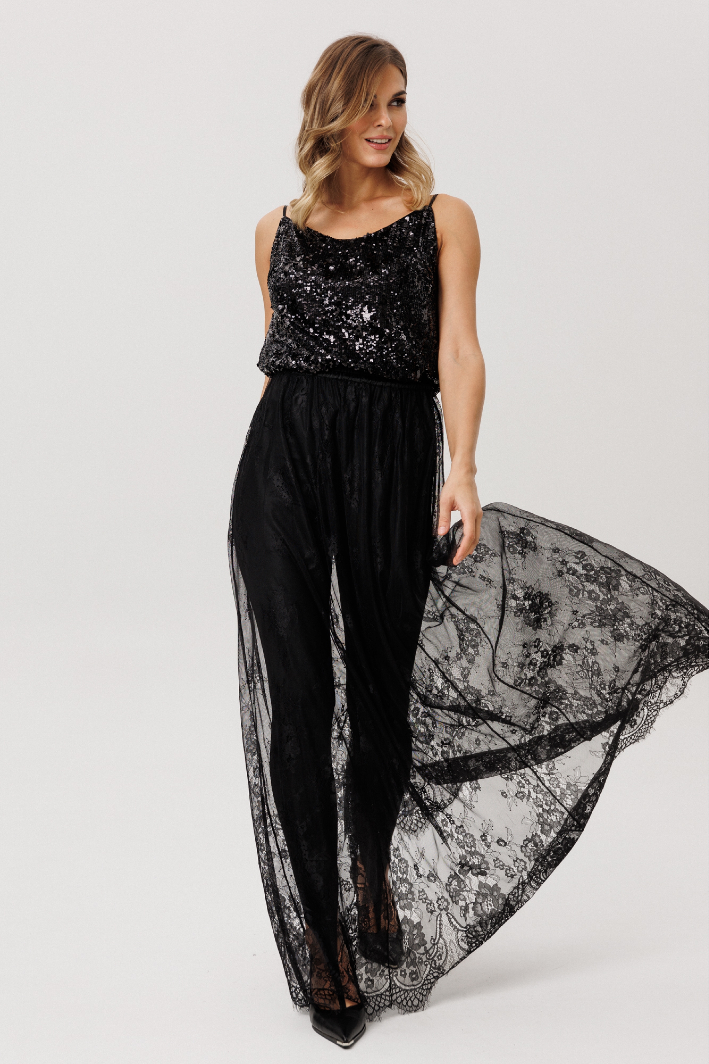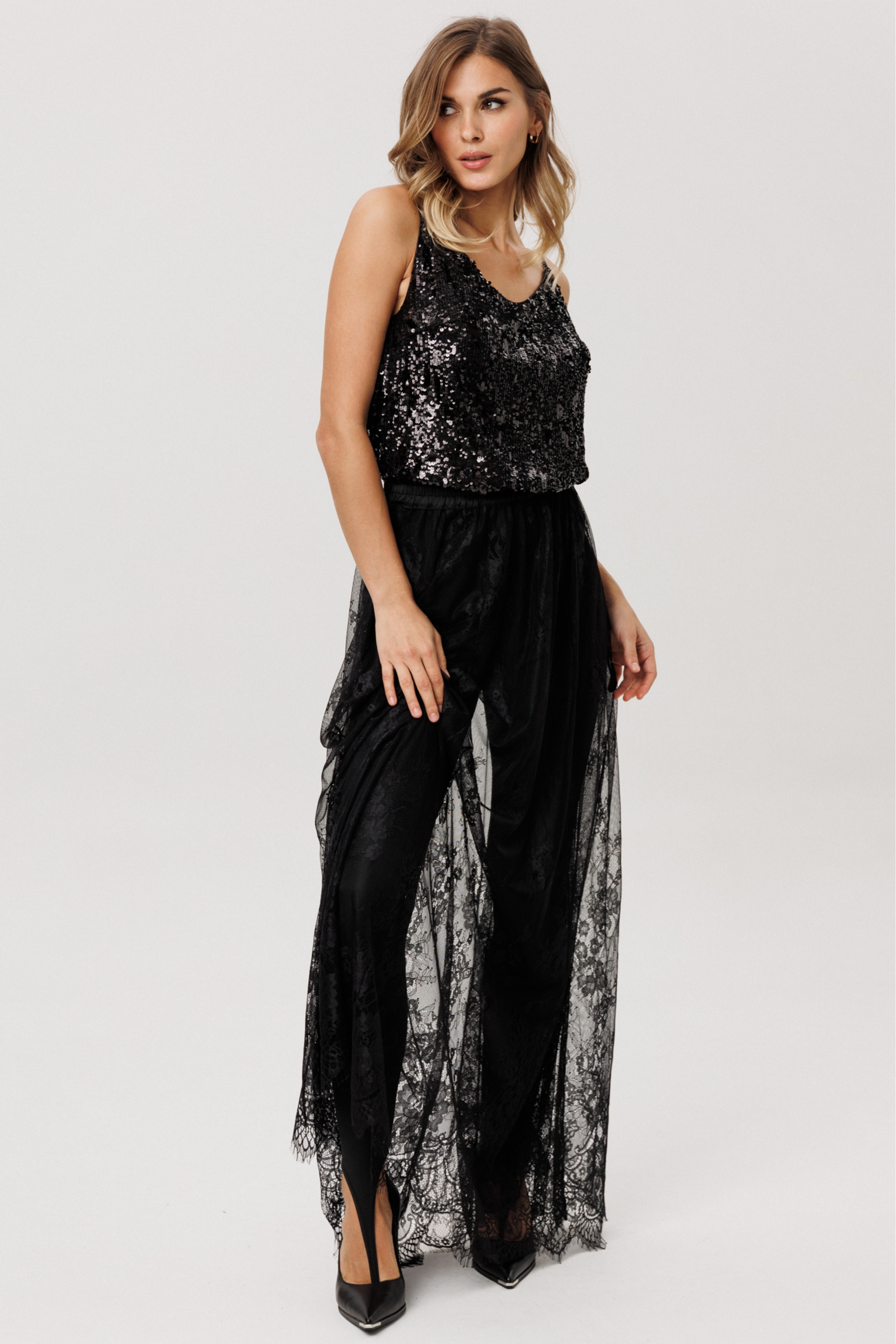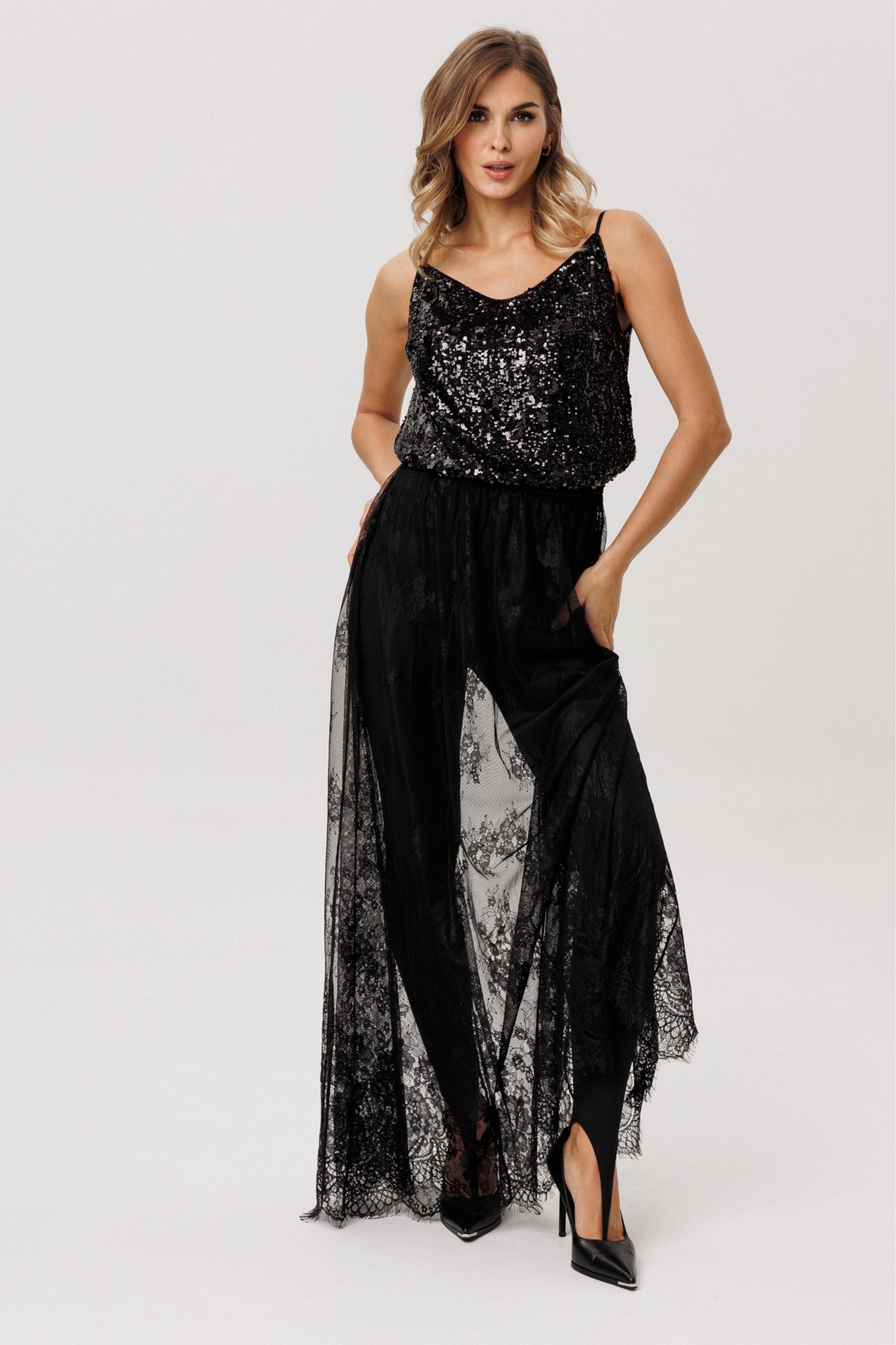 Юбка выполнена из гипюра. Юбка А-образного силуэта, длиной в пол. Юбка на притачном поясе с эластичной тесьмой. Юбка состоит из 6 клиньев. По низу юбки фестоны. Юбка без подкладки.