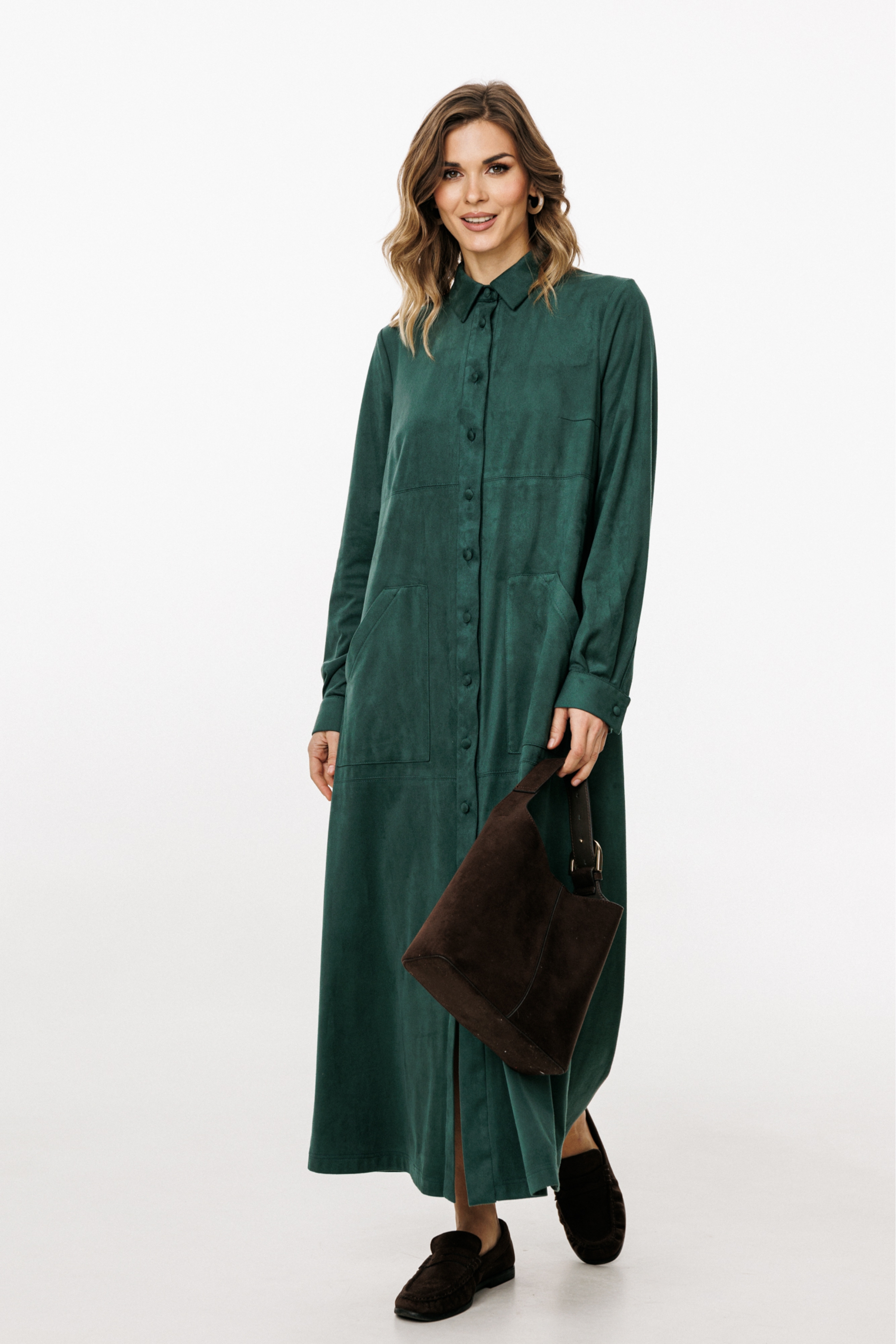 Платье выполнено из тонкой искусственной замши. Платье прямого силуэта, длиной миди. Спереди горизонтальные подрезы, накладные карманы и центральная застежка до верха с планкой на пуговицы. На спинке кокетка и встречная складка. Воротник стояче-отложной с отрезной стойкой и застежкой на пуговицу. Рукав втачной, одношовный. По низу рукава две складки и планка-обтачка. Низ рукава на притачной манжете с застежкой на пуговицу.