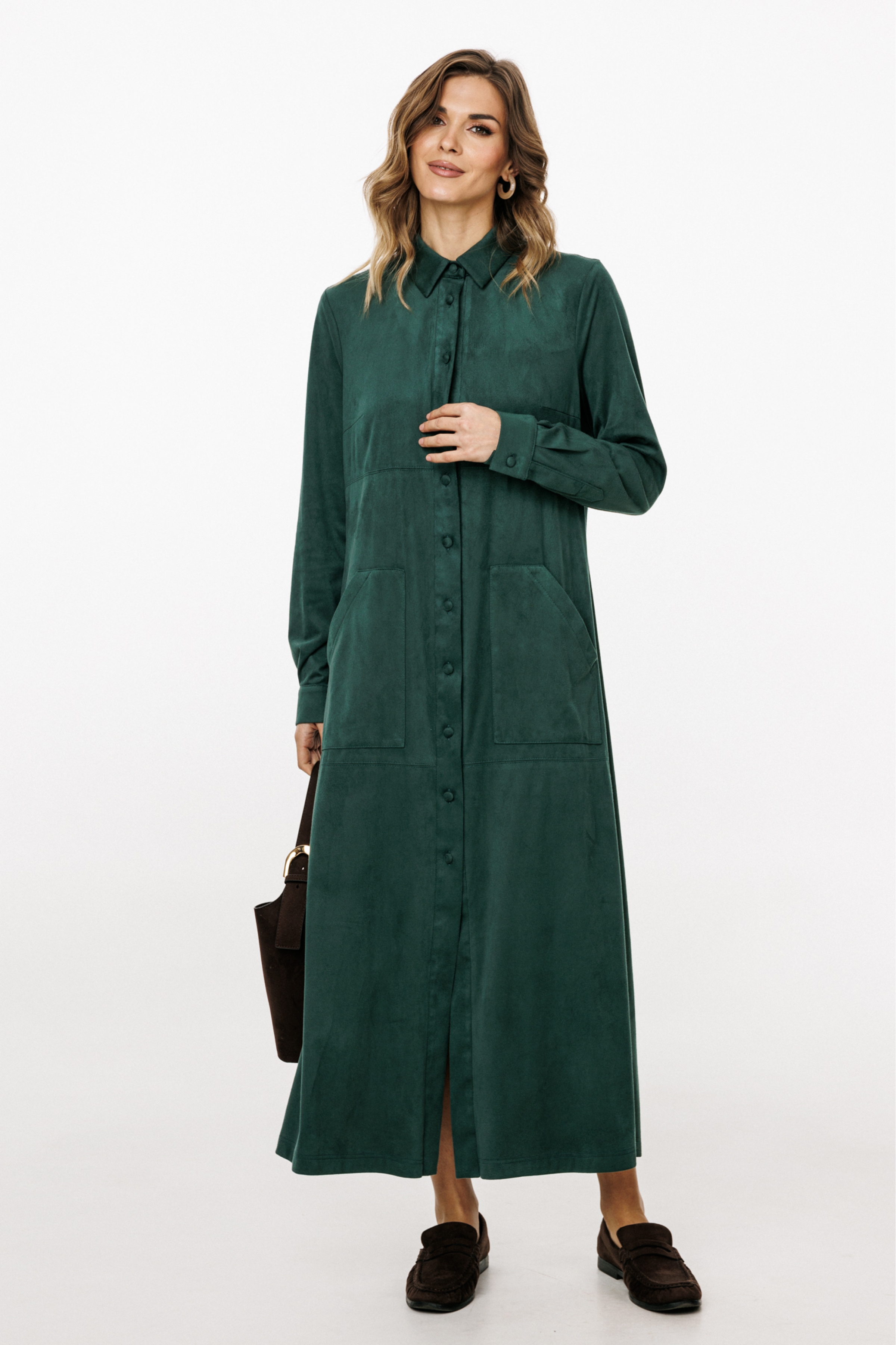 Платье выполнено из тонкой искусственной замши. Платье прямого силуэта, длиной миди. Спереди горизонтальные подрезы, накладные карманы и центральная застежка до верха с планкой на пуговицы. На спинке кокетка и встречная складка. Воротник стояче-отложной с отрезной стойкой и застежкой на пуговицу. Рукав втачной, одношовный. По низу рукава две складки и планка-обтачка. Низ рукава на притачной манжете с застежкой на пуговицу.