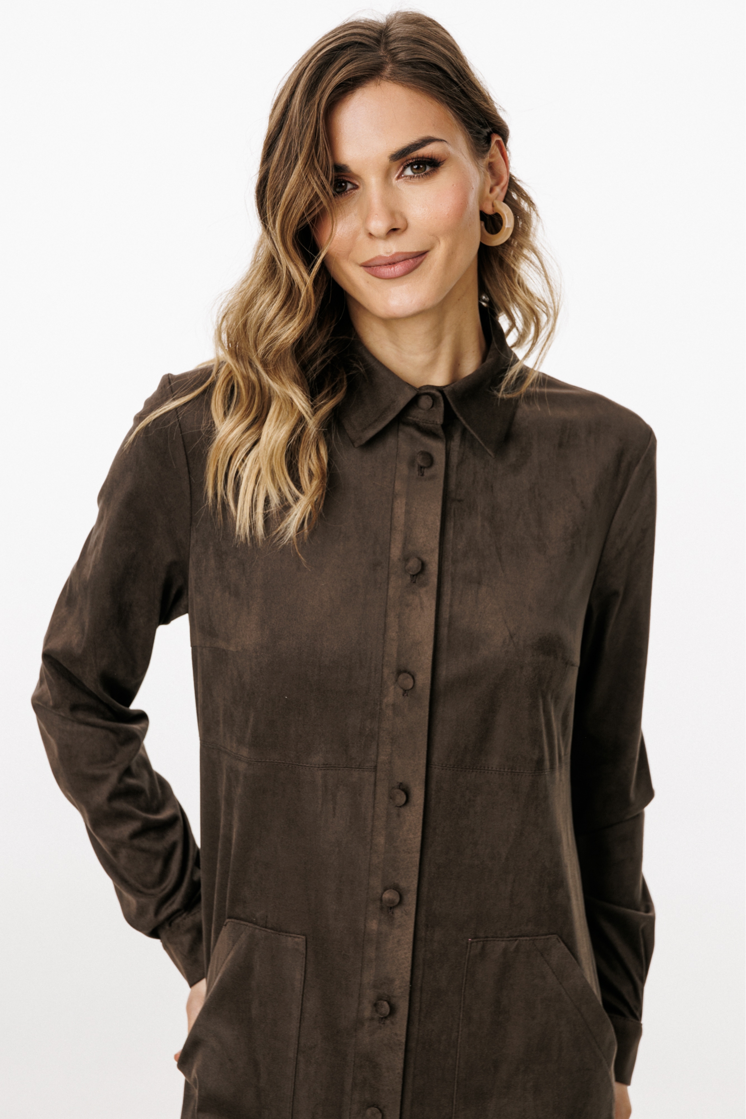Платье выполнено из тонкой искусственной замши. Платье прямого силуэта, длиной миди. Спереди горизонтальные подрезы, накладные карманы и центральная застежка до верха с планкой на пуговицы. На спинке кокетка и встречная складка. Воротник стояче-отложной с отрезной стойкой и застежкой на пуговицу. Рукав втачной, одношовный. По низу рукава две складки и планка-обтачка. Низ рукава на притачной манжете с застежкой на пуговицу.