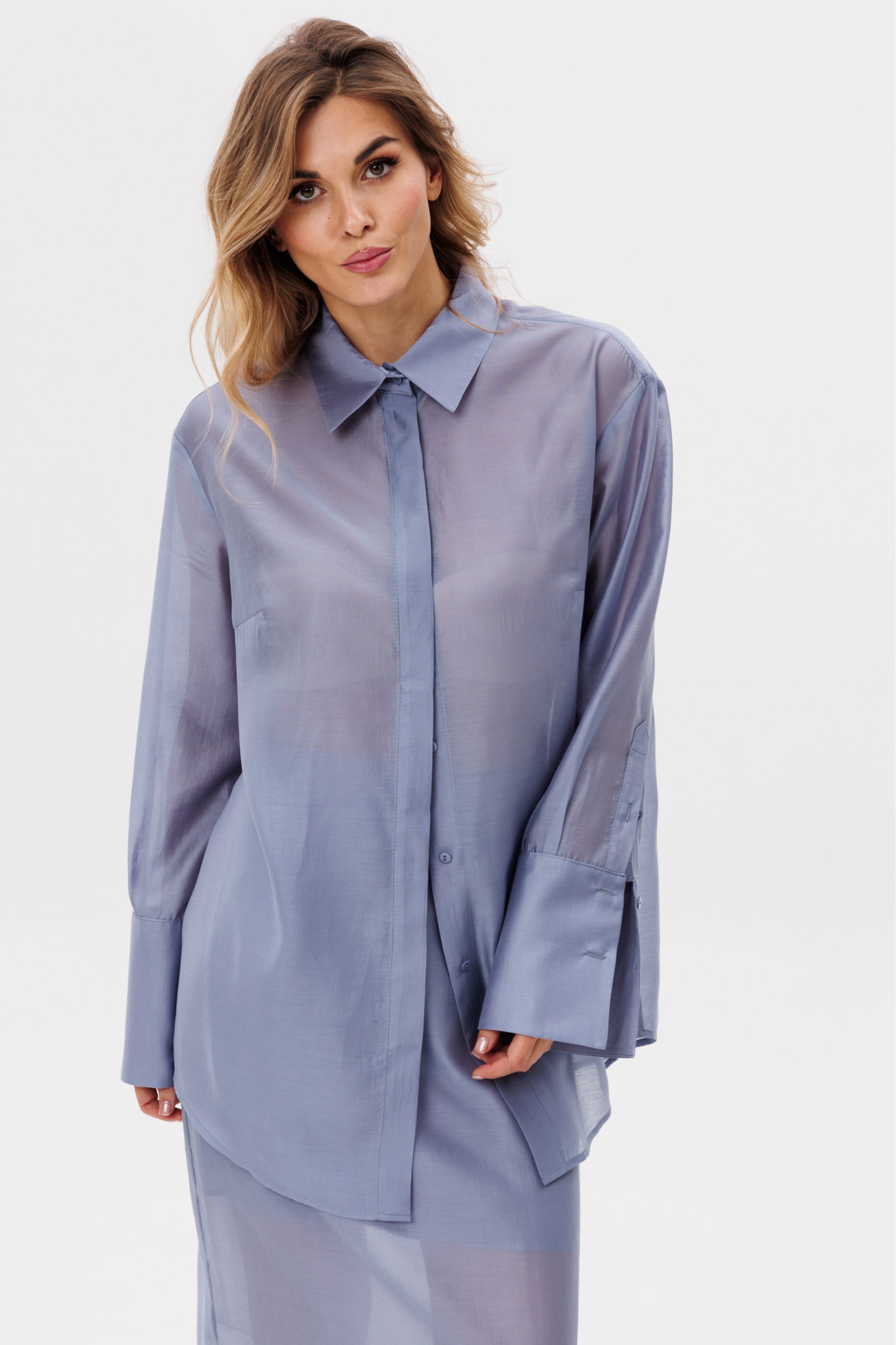 Блузка выполнена из плательно-блузочной ткани. Блузка прямого силуэта, длиной ниже линии бедер. Спереди застежка на пуговицы и потайную планку. Спинка цельная. Воротник стояче-отложной. Плечевой шов удлинен. Рукав рубашечного покроя, одношовный. Низ рукава на притачной манжете. Низ блузки фигурной формы. Длина блузки: р. 44-48 - 78 см, р. 50-54 - 79,5 см.