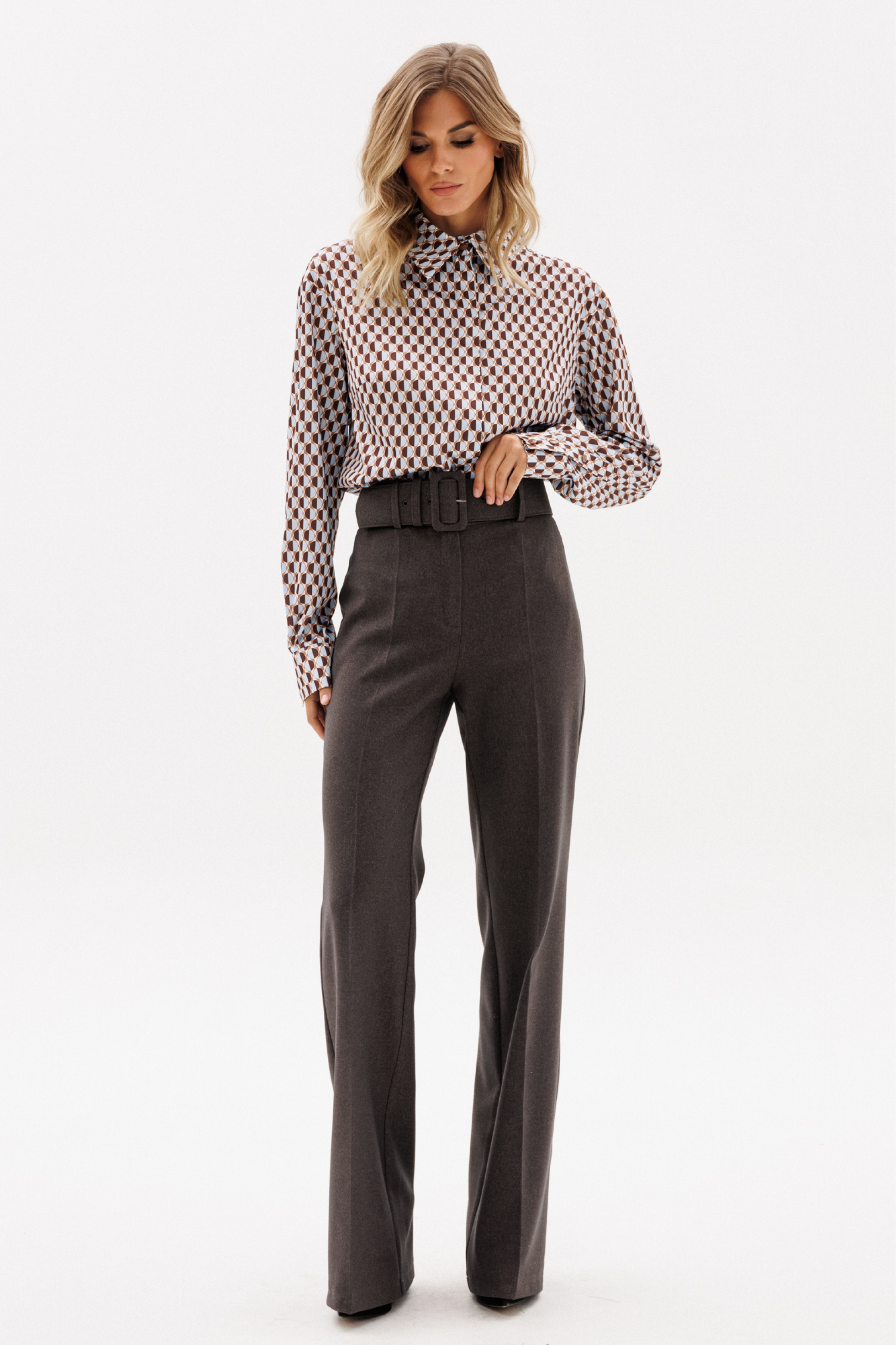 Блузка выполнена из тонкого атласа с принтом. Спереди центральная застежка на потайную планку с пуговицами. Спинка цельная. Воротник стояче-отложной. Плечевой шов удлинен. Рукав рубашечный одношовный. Низ рукава на притачной манжете.