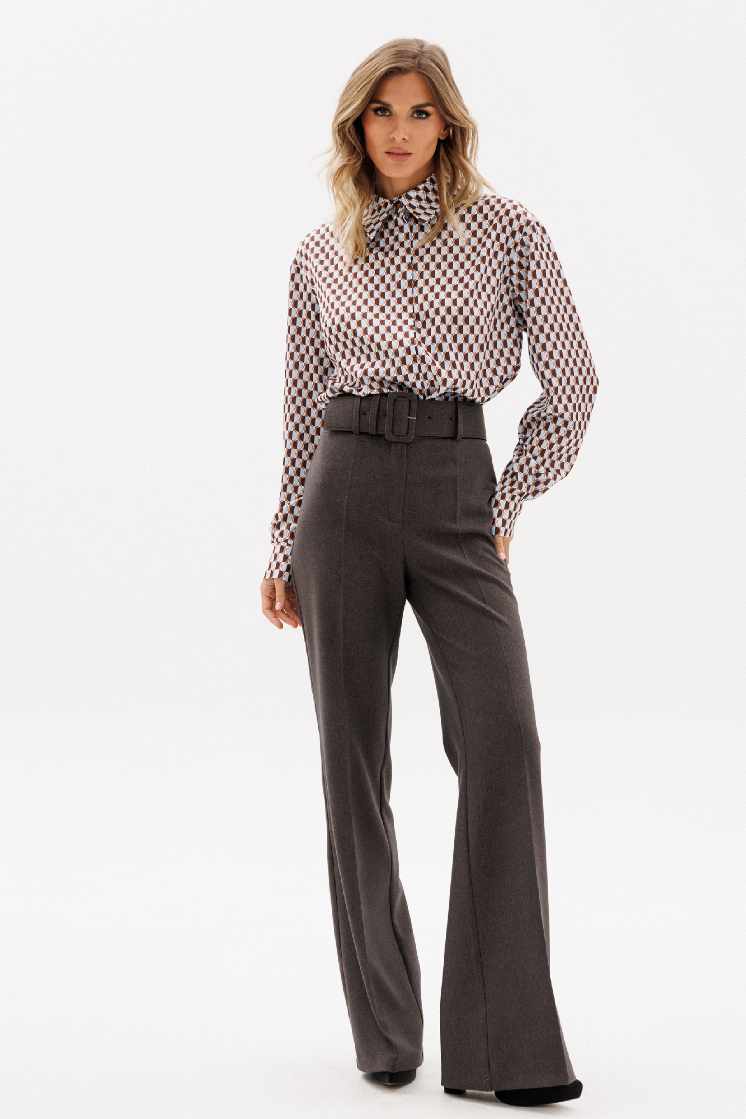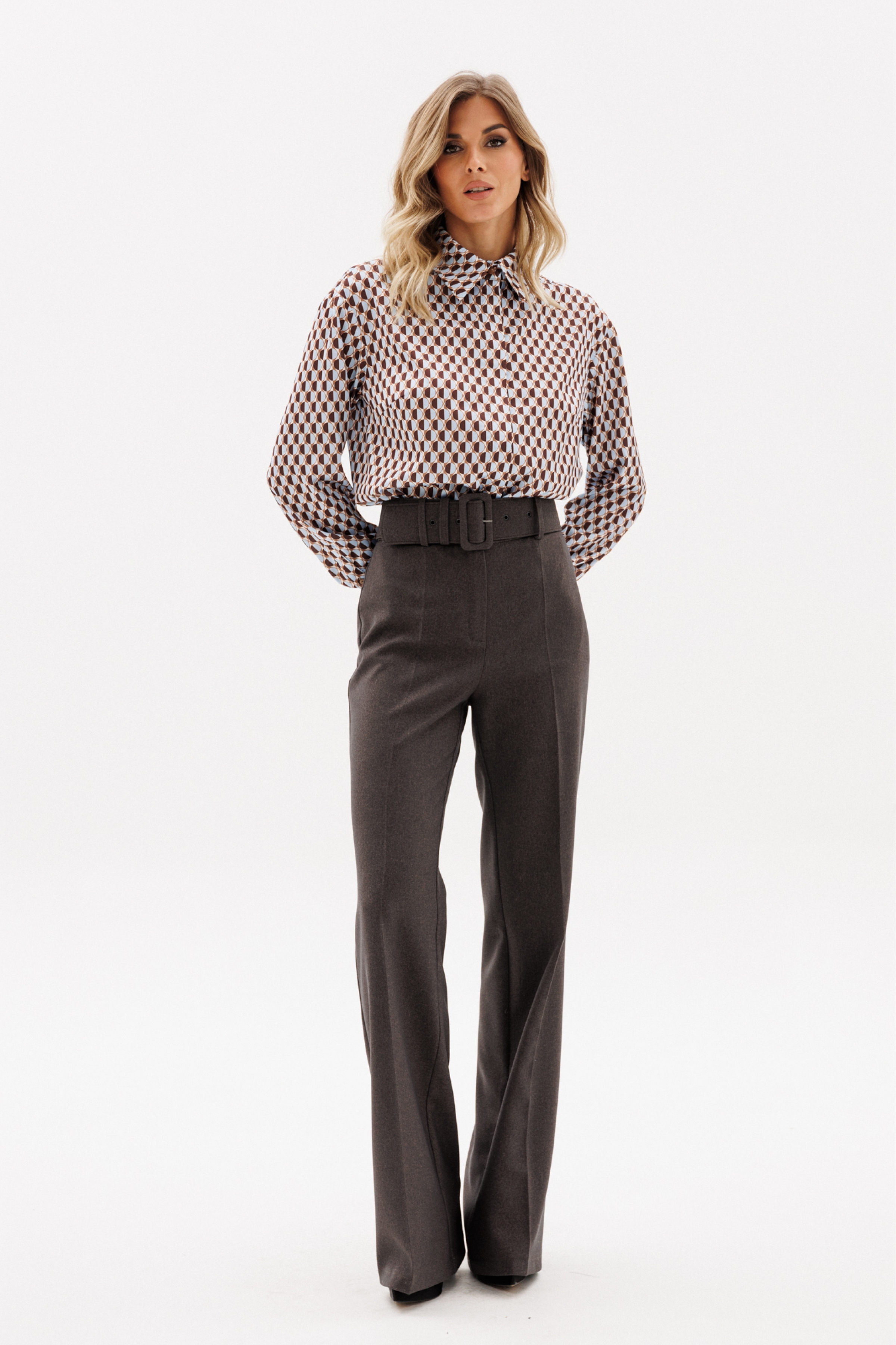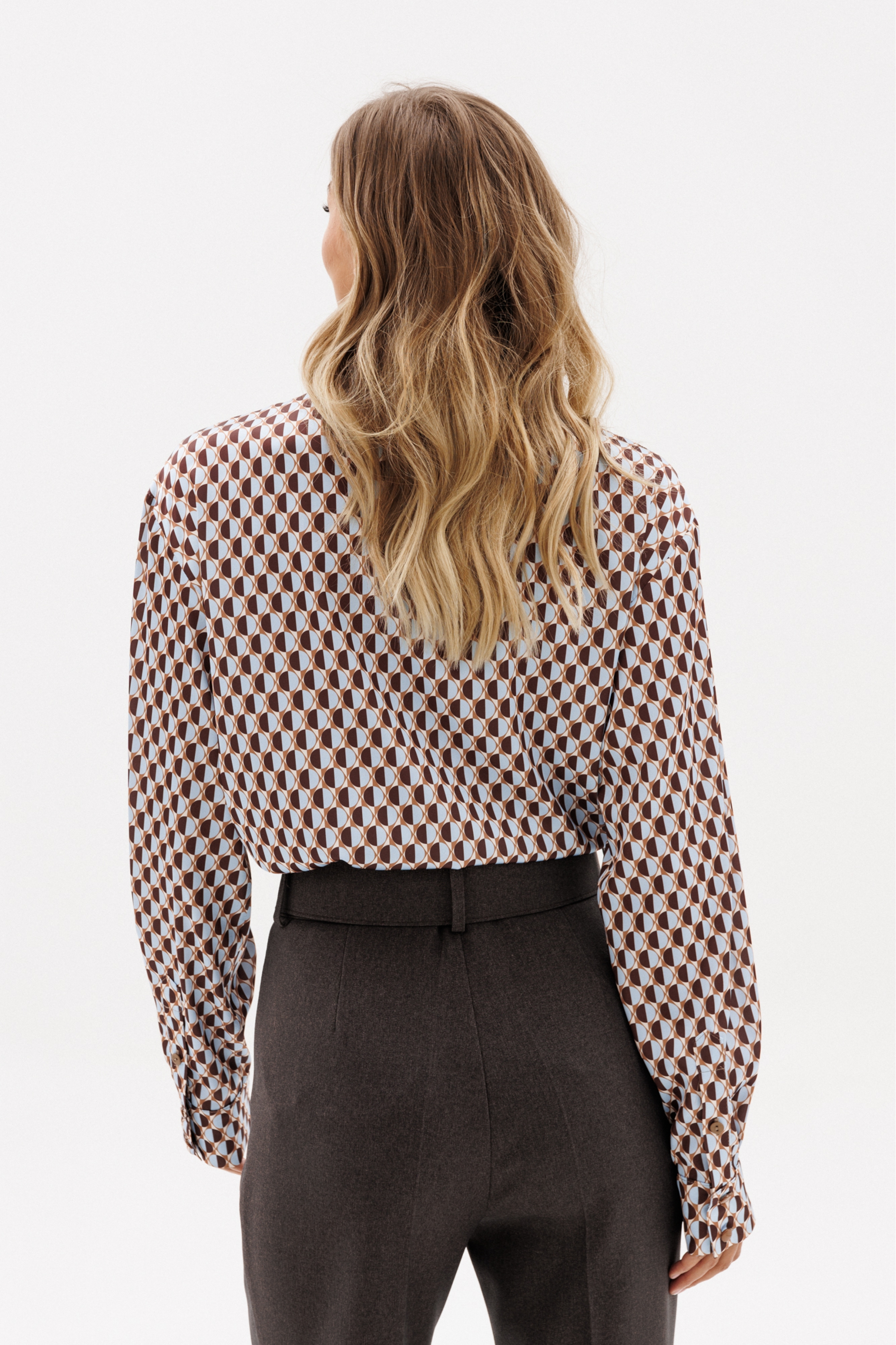 Блузка выполнена из тонкого атласа с принтом. Спереди центральная застежка на потайную планку с пуговицами. Спинка цельная. Воротник стояче-отложной. Плечевой шов удлинен. Рукав рубашечный одношовный. Низ рукава на притачной манжете.