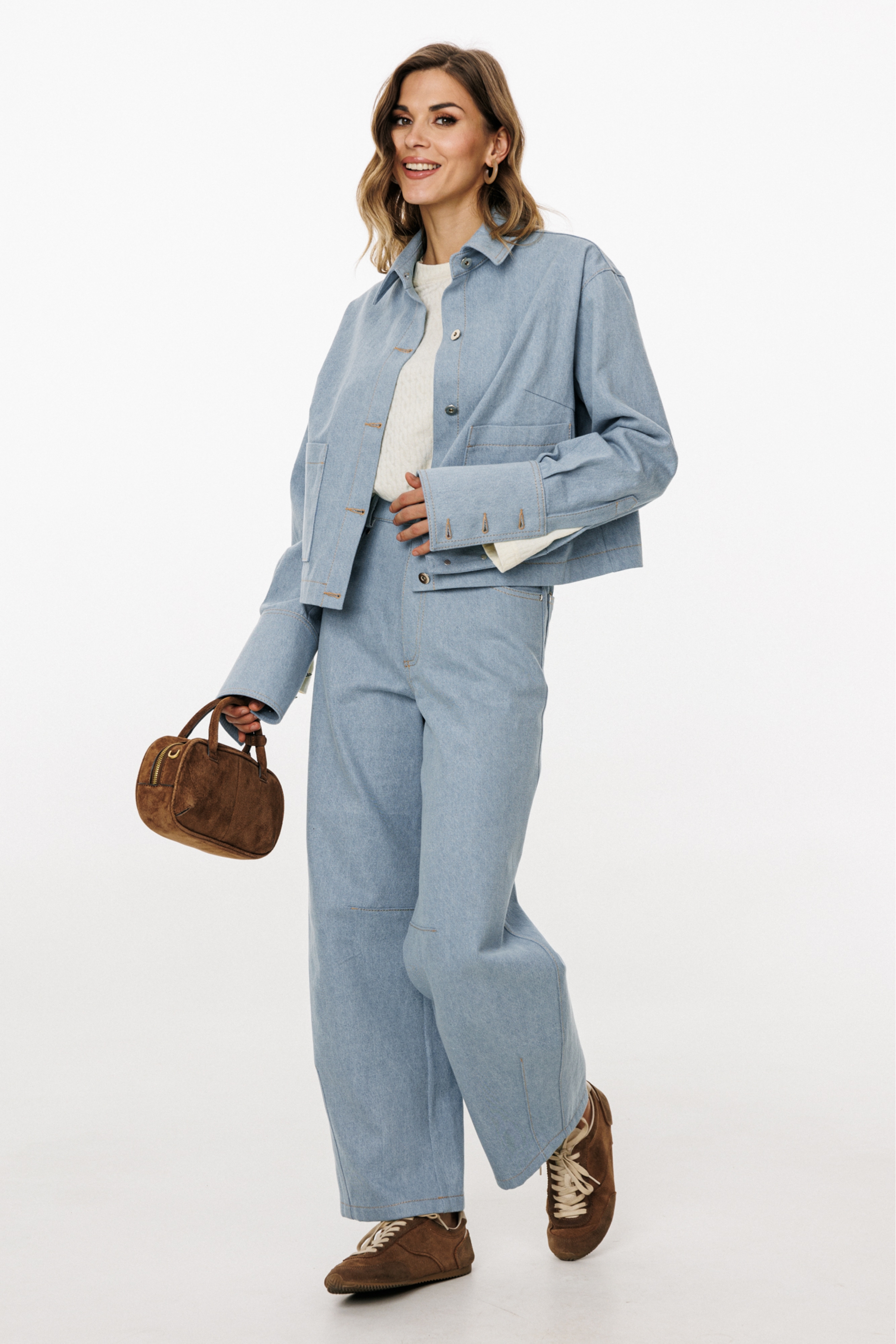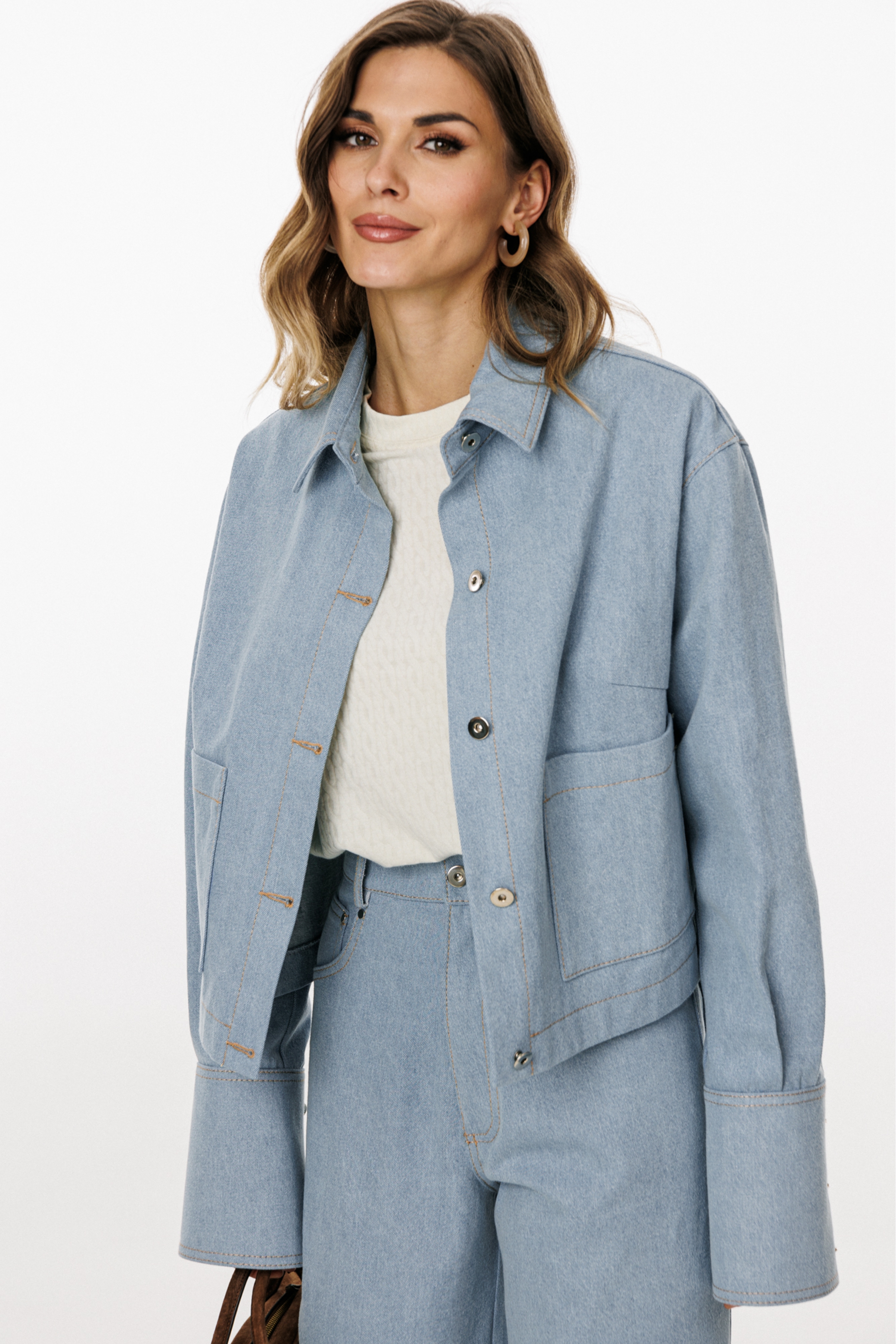 Блузка выполнена из плотного джинса. Блузка прямого силуэта, длиной ниже линии талии. Спереди накладные карманы и центральная застежка с планкой на пробивные пуговицы. На спинке кокетка и две складки. Воротник стояче-отложной с отрезной стойкой. Плечевой шов удлинен. Рукав рубашечного покроя, одношовный. Низ рукава на притачной манжете с застежкой на пробивные пуговицы. Рукав удлинен. Блузка декорирована по кокетке спинки нашивкой из натуральной кожи.