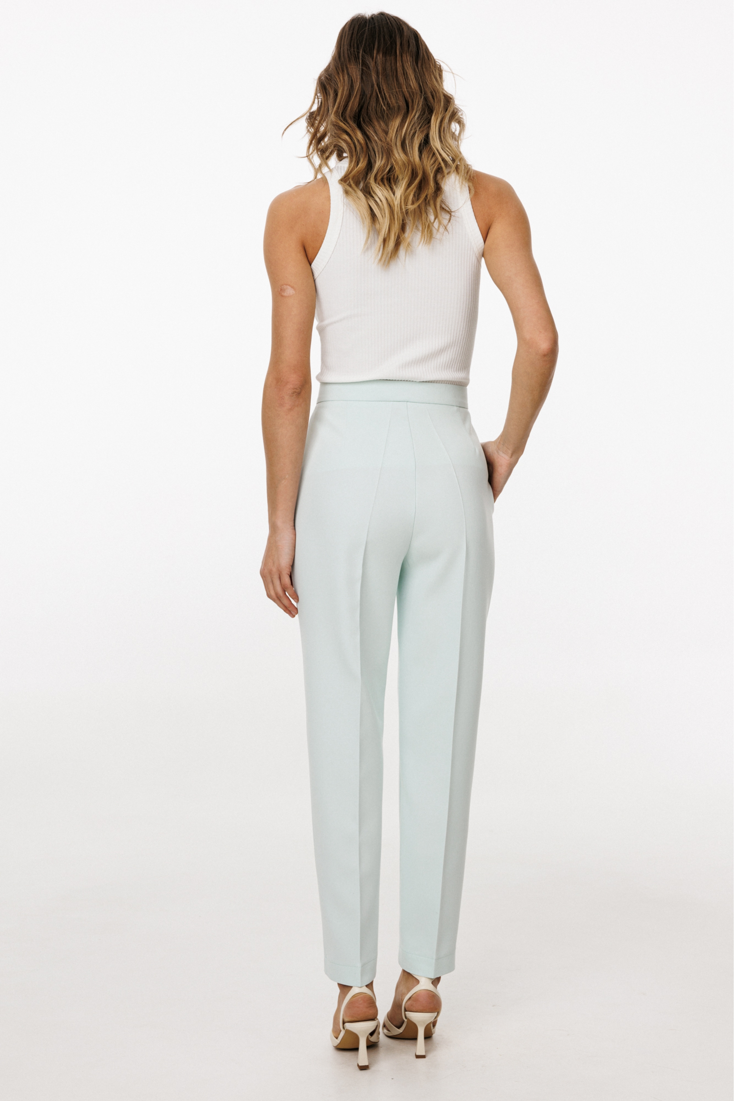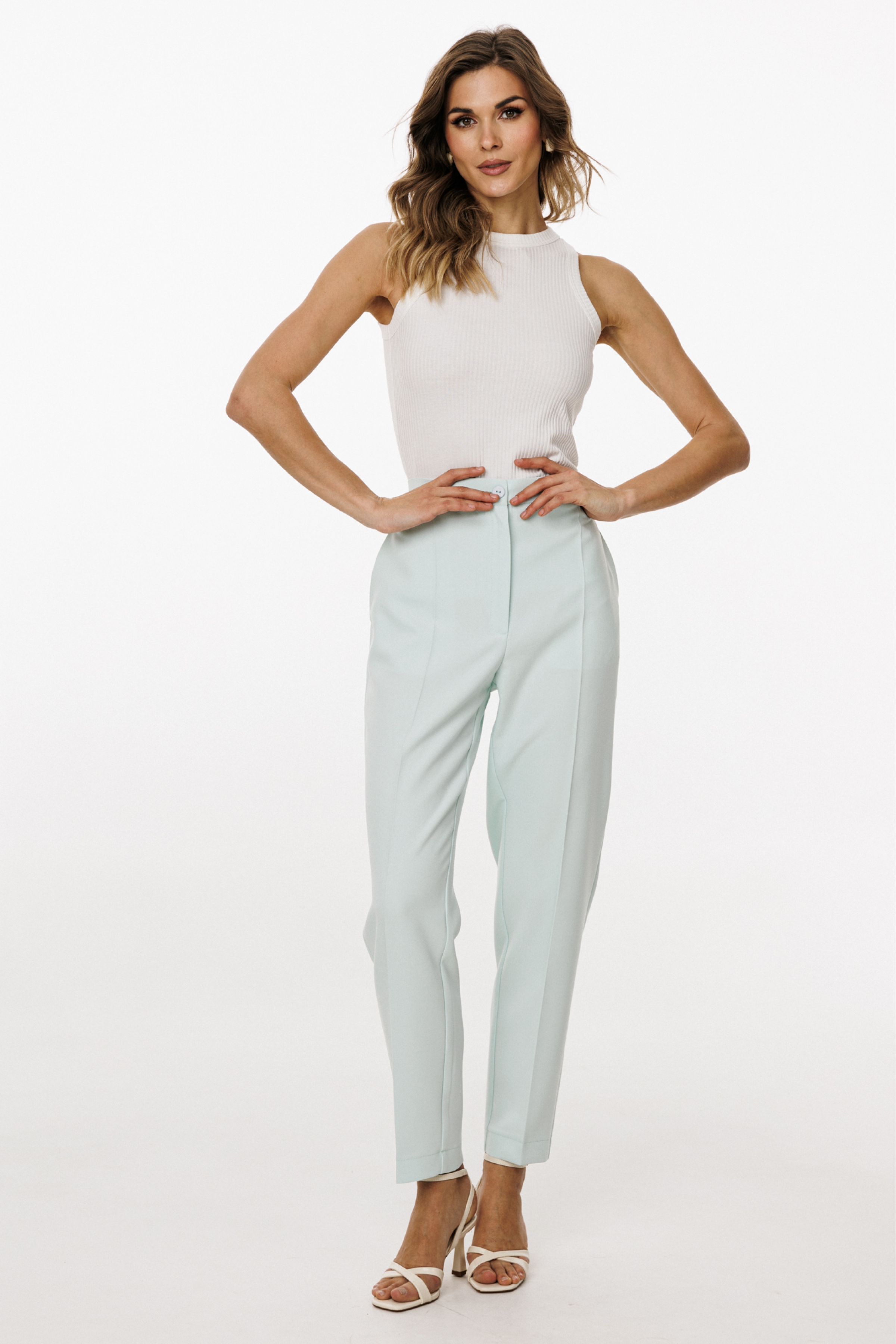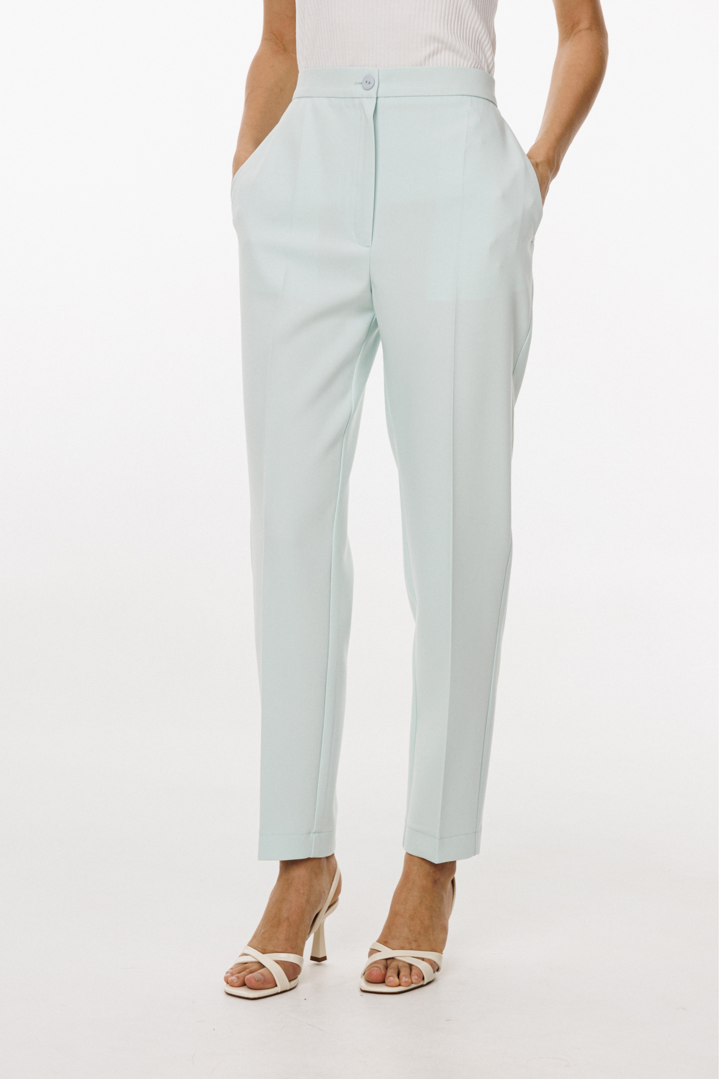 Брюки выполнены из костюмной ткани. Брюки зауженные к низу, длиной 7/8, на притачном поясе. Спереди боковые карманы с наклонным входом и застежка на молнию.