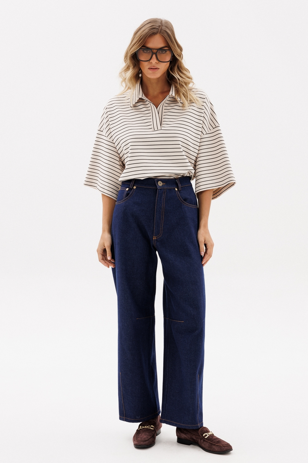 Джемпер выполнен из трикотажного полотна. Джемпер прямого силуэта, длиной до линии бедер. Перед и спинка цельные. Воротник стояче-отложной. Плечевой шов удлинен. Рукав рубашечного покроя, одношовный, длиной до линии локтя.