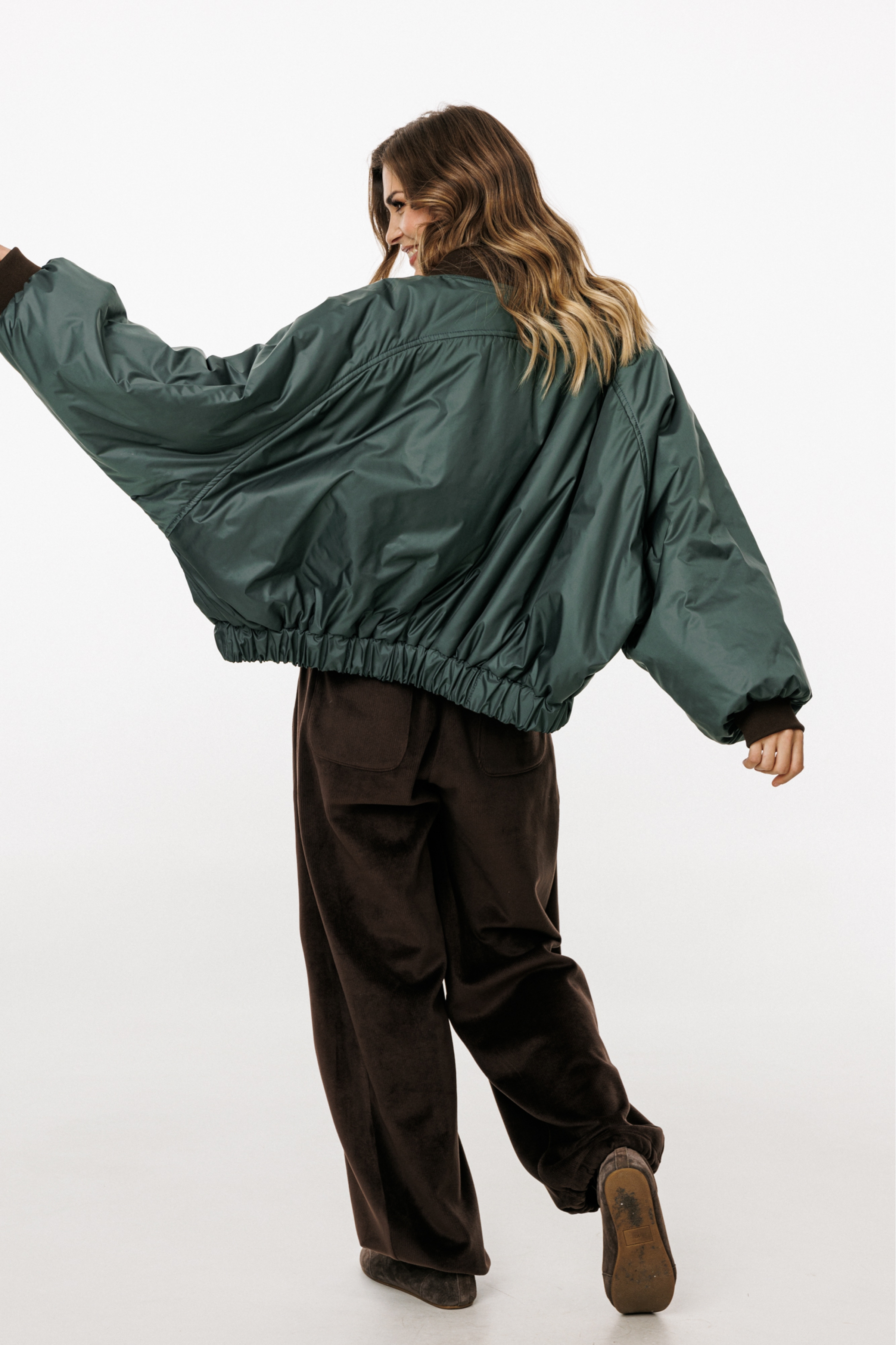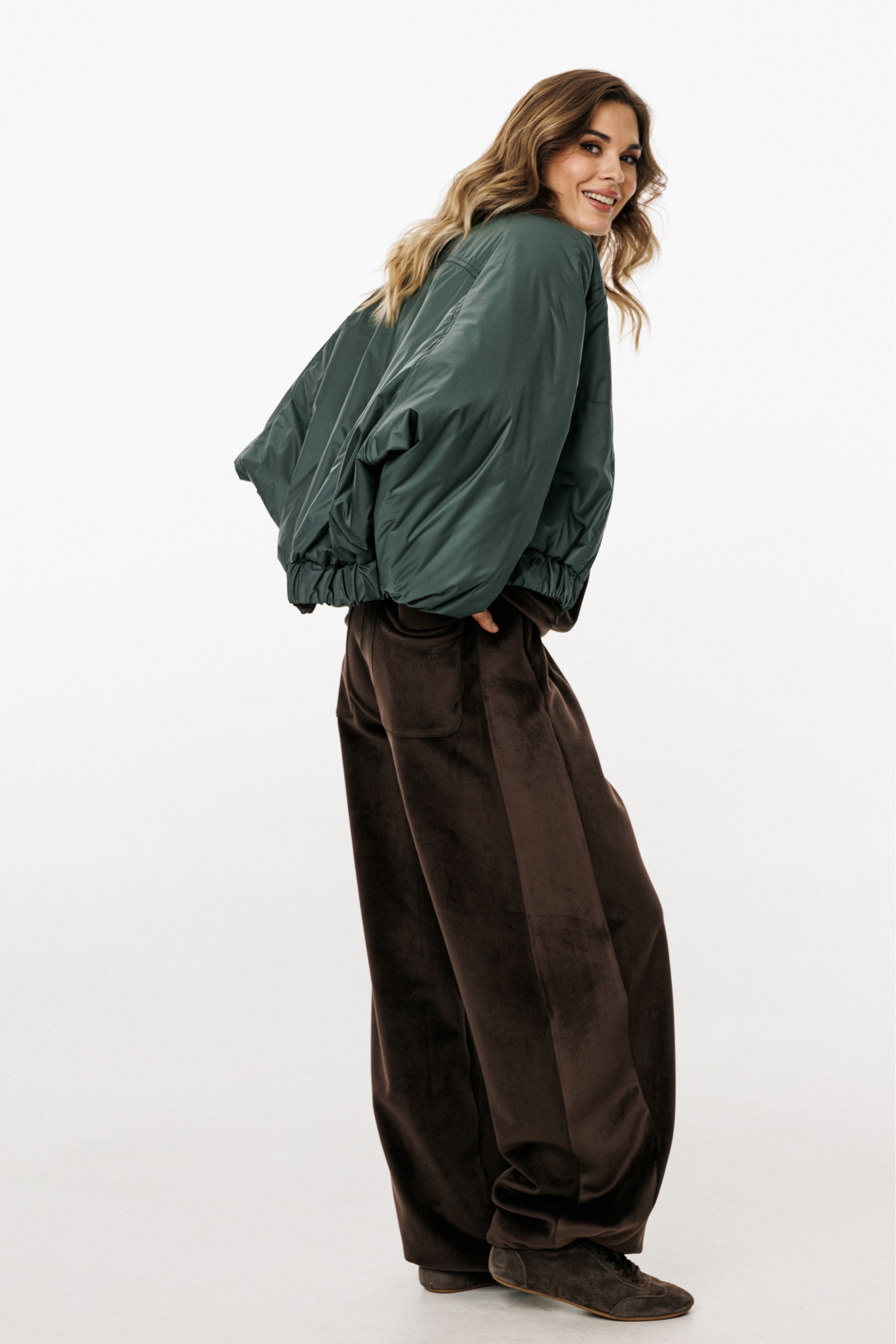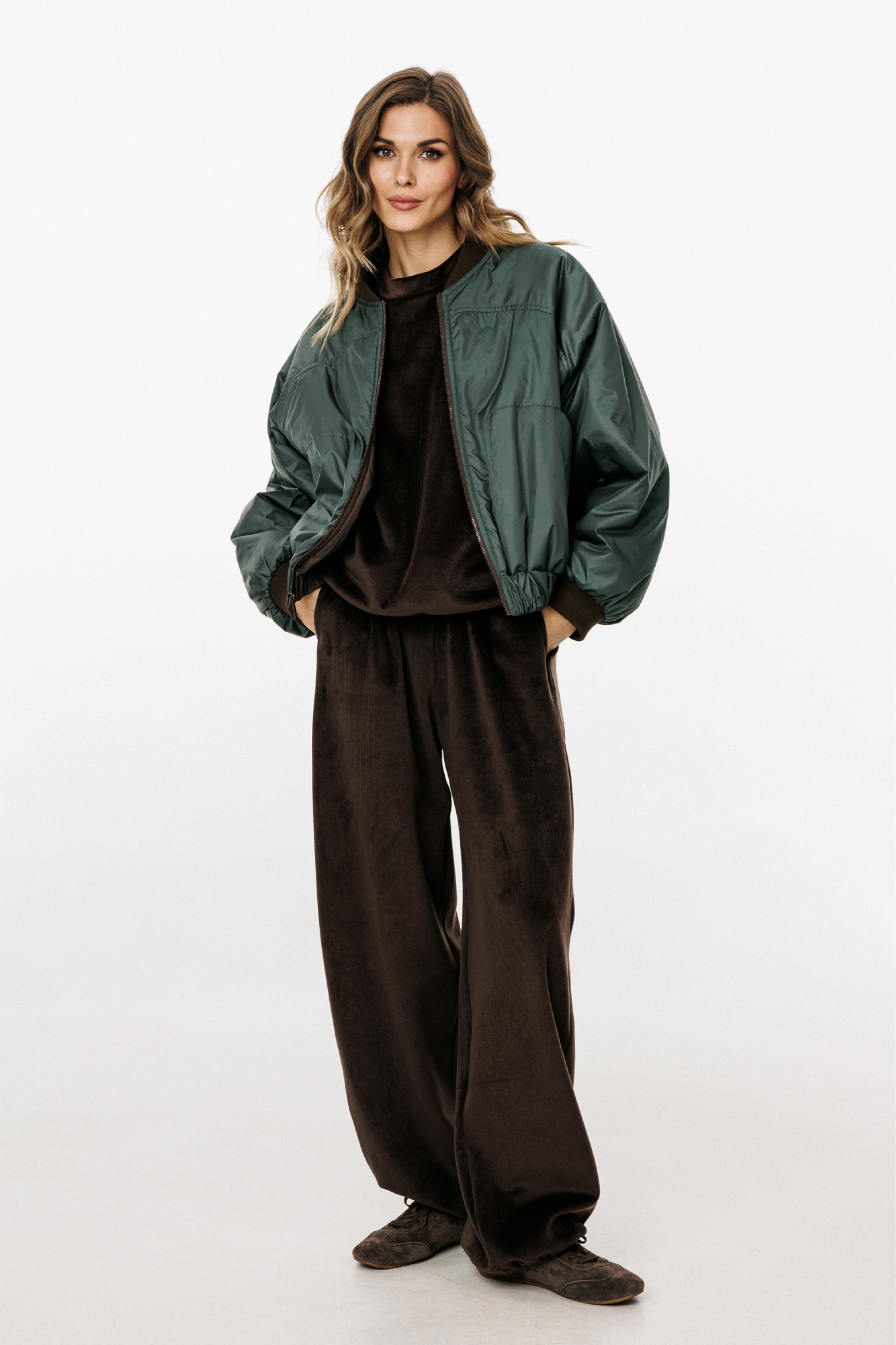 Комплект: джемпер+брюки. Комплект выполнен из двустороннего велюра в мелкий рубчик. Джемпер О-образного силуэта, покроя "oversize", длиной до линии бедер. Перед и спинка цельные. Горловина округлой формы, обработана бейкой. Плечевой шов удлинен. Рукав рубашечного покроя, одношовный. Низ рукава на манжете. Верхняя часть рукава переходит в кокетку переда т спинки и доходит до горловины. По низу джемпера обработан пояс. Пояс, манжеты, верхняя часть рукава и бейка горловины выполнены из основной, но без рубчика. Брюки на притачном поясе с эластичной тесьмой, прямого силуэта, длиной в пол, покроя "oversize". Боковой шов заменен лампасом. В швах лампаса карманы. Сзади накладные карманы. В пояс протянут шнур с наконечниками. По низу брюк втянута эластичная тесьма с фиксаторами. Лампасы и пояс выполнены из основной ткани, но без рубчика.