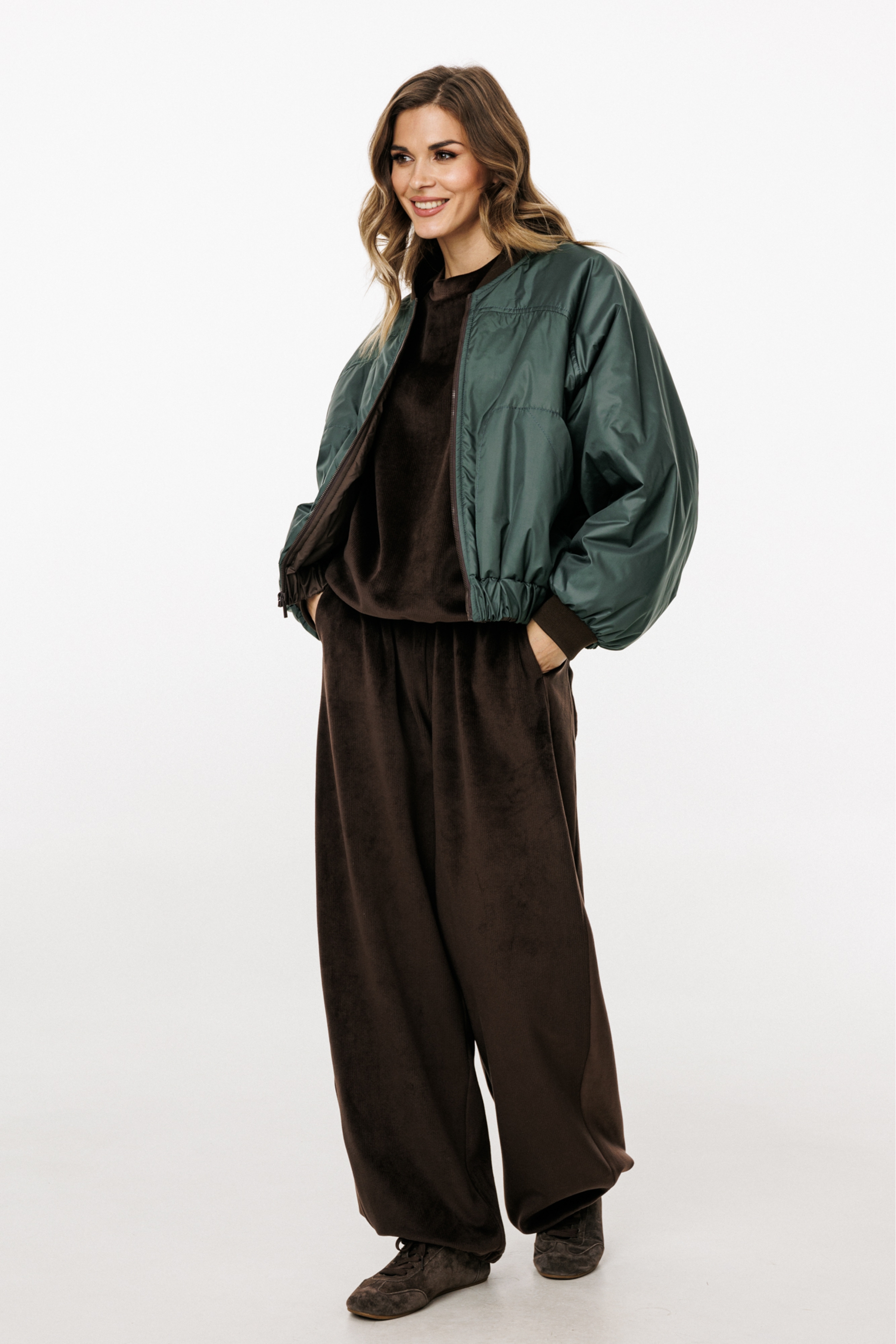 Комплект: джемпер+брюки. Комплект выполнен из двустороннего велюра в мелкий рубчик. Джемпер О-образного силуэта, покроя "oversize", длиной до линии бедер. Перед и спинка цельные. Горловина округлой формы, обработана бейкой. Плечевой шов удлинен. Рукав рубашечного покроя, одношовный. Низ рукава на манжете. Верхняя часть рукава переходит в кокетку переда т спинки и доходит до горловины. По низу джемпера обработан пояс. Пояс, манжеты, верхняя часть рукава и бейка горловины выполнены из основной, но без рубчика. Брюки на притачном поясе с эластичной тесьмой, прямого силуэта, длиной в пол, покроя "oversize". Боковой шов заменен лампасом. В швах лампаса карманы. Сзади накладные карманы. В пояс протянут шнур с наконечниками. По низу брюк втянута эластичная тесьма с фиксаторами. Лампасы и пояс выполнены из основной ткани, но без рубчика.
