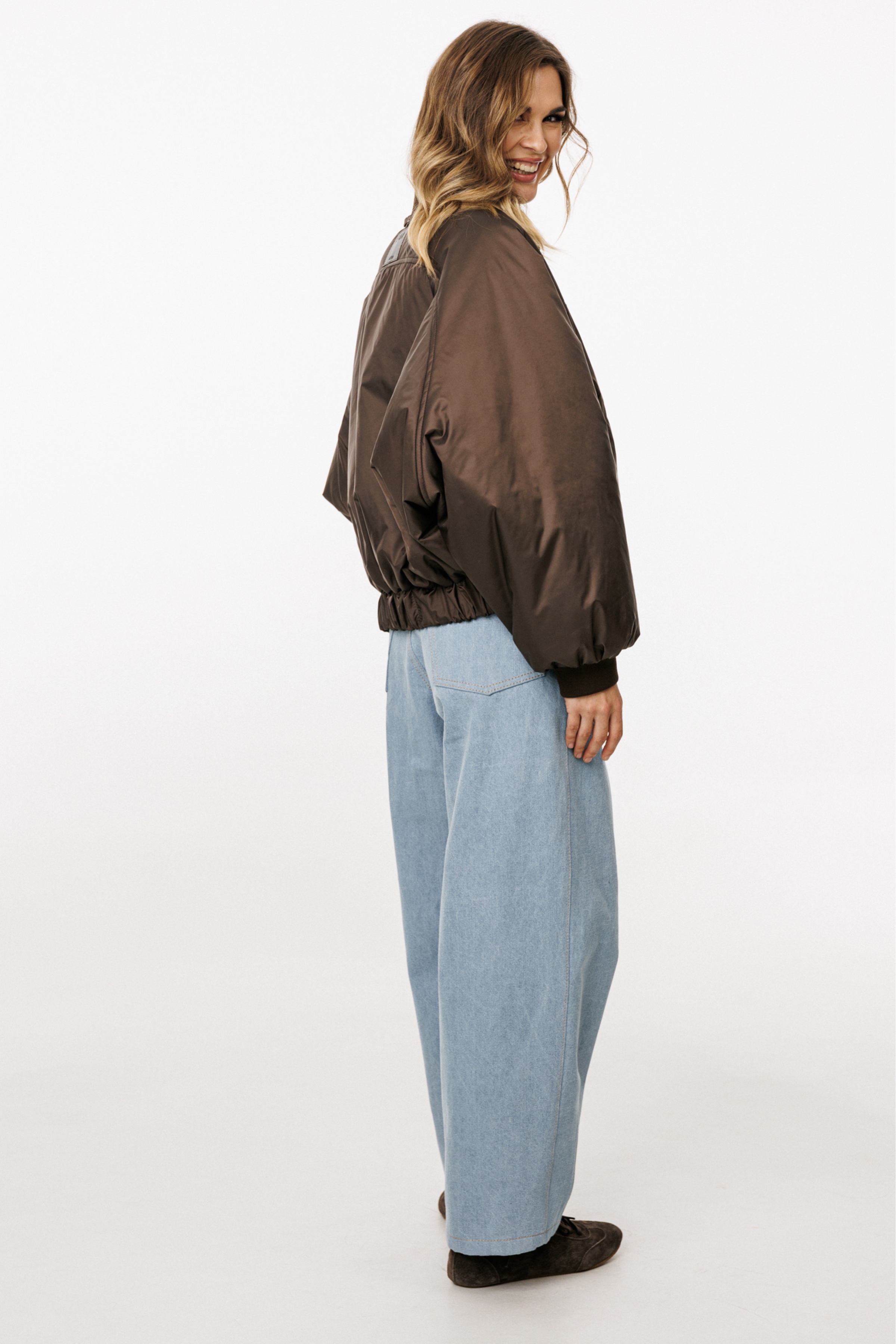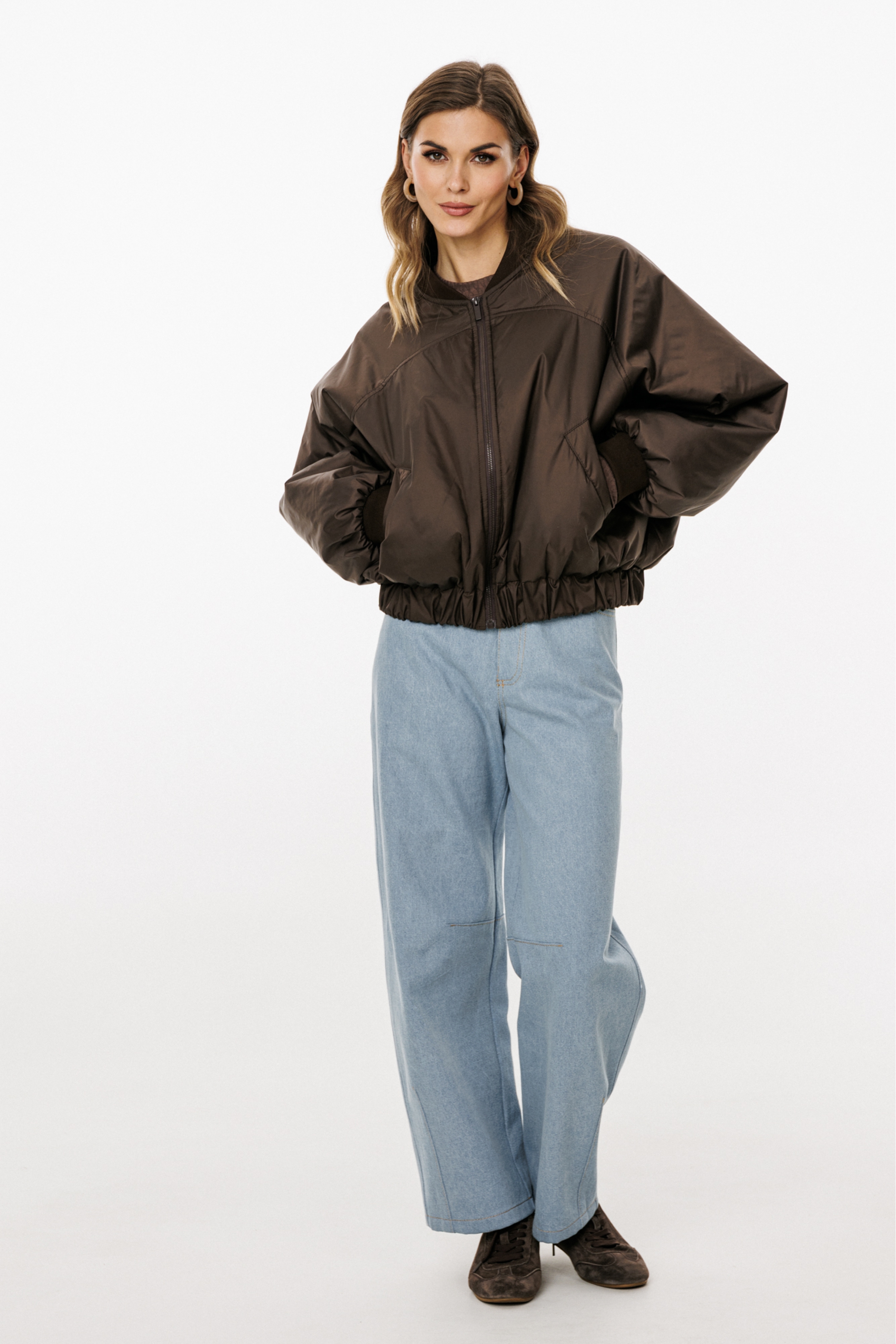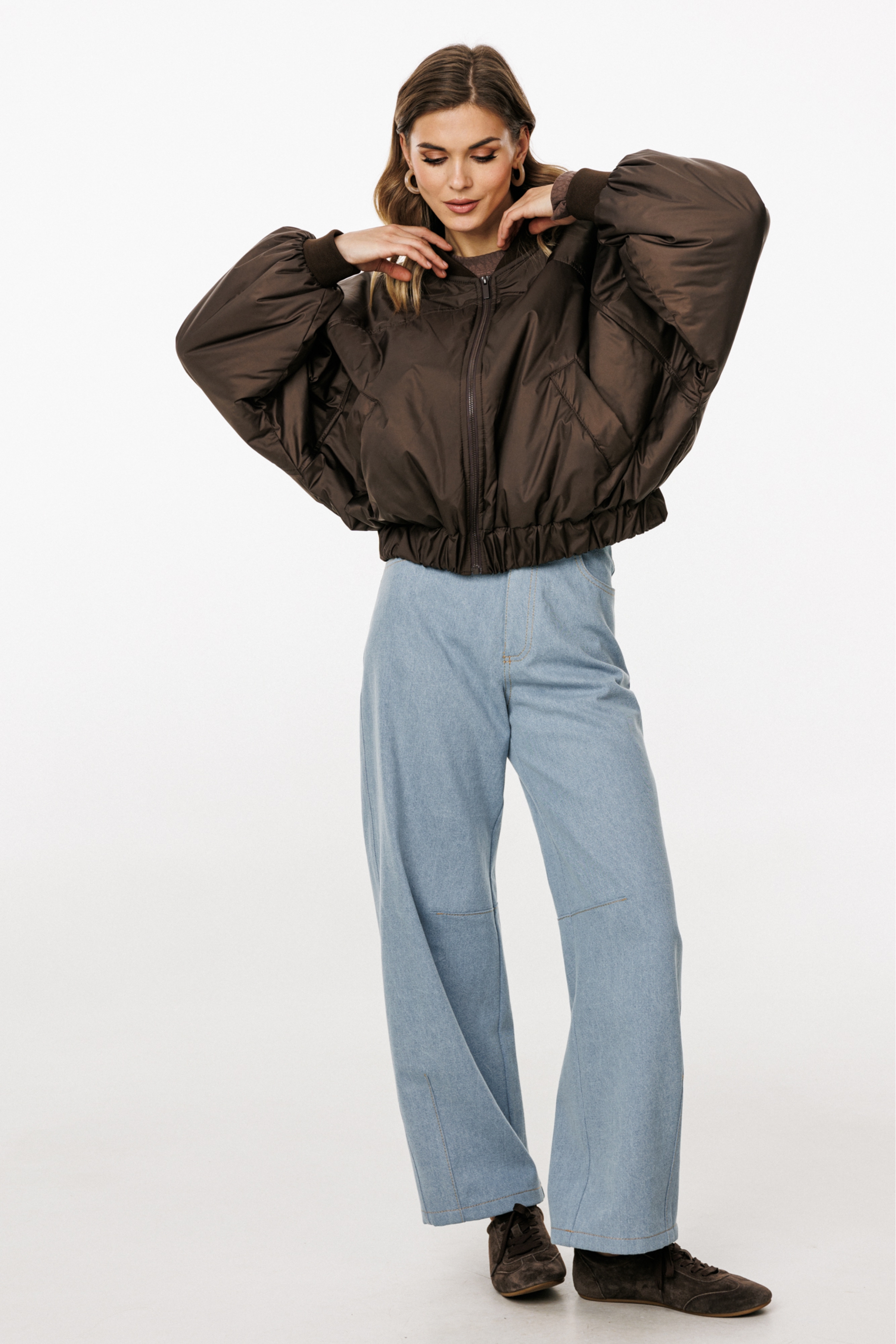 Куртка выполнена из плащевой ткани с утеплителем Isosoft. Куртка О-образного силуэта, длиной выше линии бедер. Куртка двусторонняя. Спереди застежка на молнию и карманы. Рукав покроя кимоно переходящий в кокетки спереди и по спинке. Низ рукава на притачной манжете из трикотажного довяза. Горловина округлой формы с вортником-стойкой из трикотажного довяза. Низ куртки на притачном поясе с эластичной тесьмой внутри. Одна из сторон куртки декорирована на спинке нашивкой из натуральной кожи.