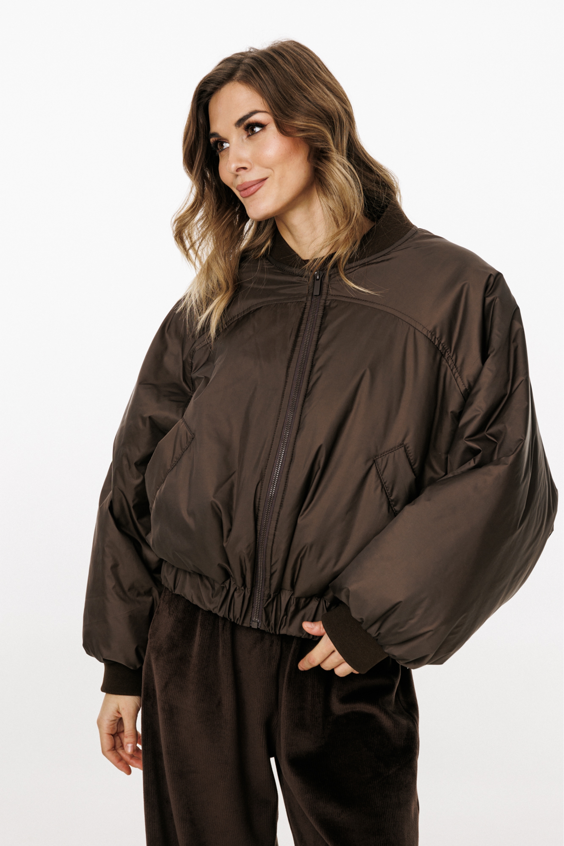 Куртка выполнена из плащевой ткани с утеплителем Isosoft. Куртка О-образного силуэта, длиной выше линии бедер. Куртка двусторонняя. Спереди застежка на молнию и карманы. Рукав покроя кимоно переходящий в кокетки спереди и по спинке. Низ рукава на притачной манжете из трикотажного довяза. Горловина округлой формы с вортником-стойкой из трикотажного довяза. Низ куртки на притачном поясе с эластичной тесьмой внутри. Одна из сторон куртки декорирована на спинке нашивкой из натуральной кожи.