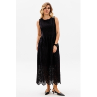 Платье выполнено из хлопка с вышивкой. Платье Х-образного силуэта, длиной миди, отрезное по линии талии. Горловина округлой формы. Плечевой шов заужен. Юбка расширена к низу. В среднем шве спинки застежка на потайную молнию. В боковых швах карманы. По низу юбки фестоны. Платье на отлетной по низу подкладке.