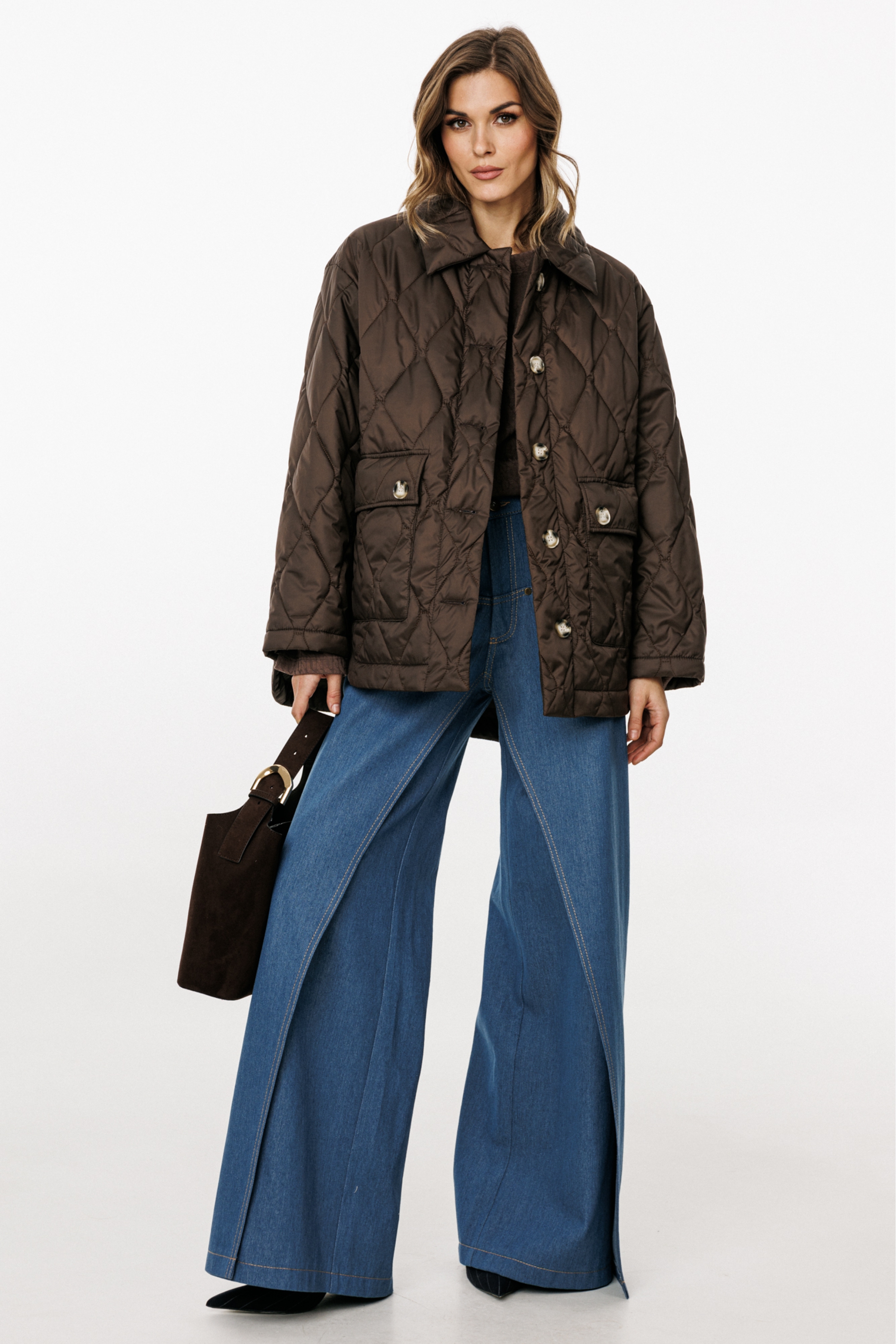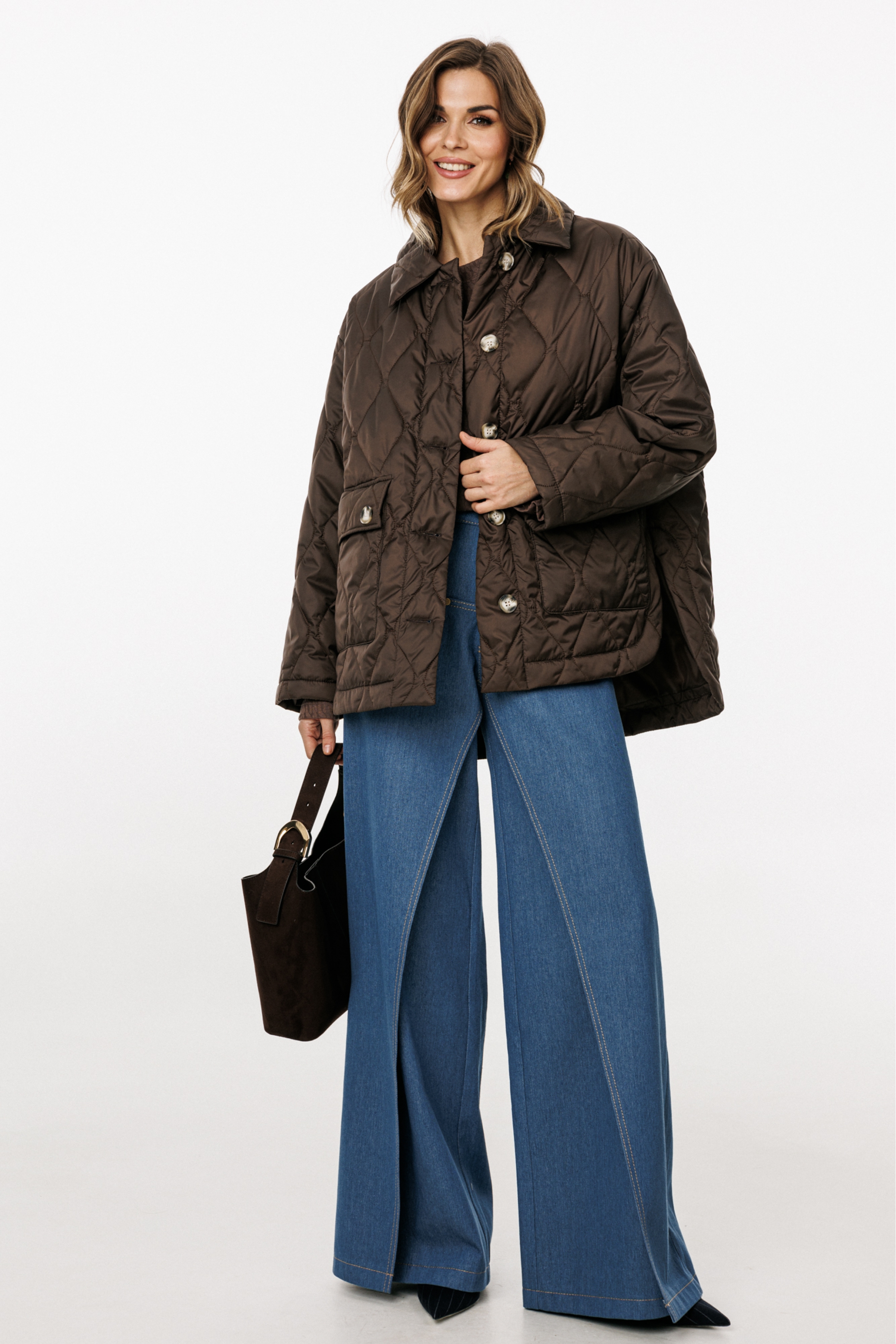 Куртка выполнена из плащевой ткани, простеганной с Isosoft. Куртка прямого силуэта, длиной до линии бедер. Застежка центральная бортовая на пришивные пуговицы. Спереди накладные карманы с клапанами. Спинка цельная. Воротник стояче-отложной. Рукав втачной, двухшовный. Плечевой шов спущен. Пройма углублена. Спинка длиннее переда. В боковых швах фигурные разрезы.
